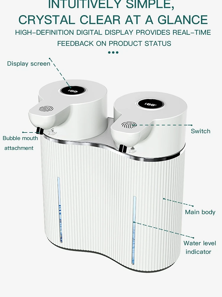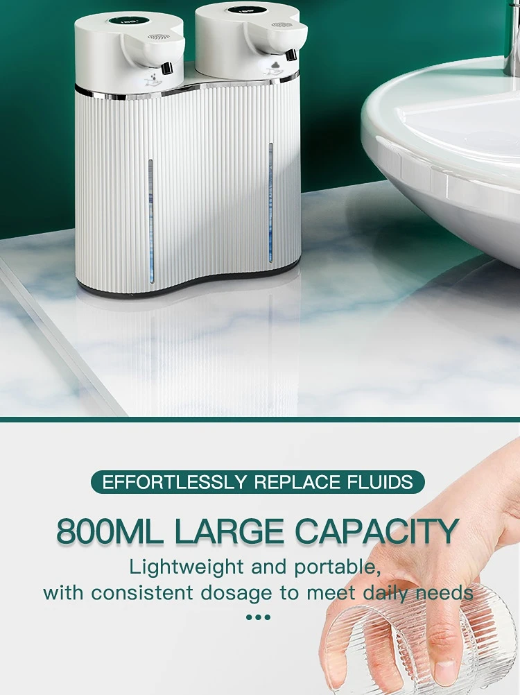 Large Capacity and Long Battery Life: Holds up to 28 oz of soap in its dual 14 oz containers, reducing refill frequency. Each side is powered by a 1200mAh lithium battery, capable of 2500 uses on a single charge. The USB Type C port ensures quick and convenient recharging.