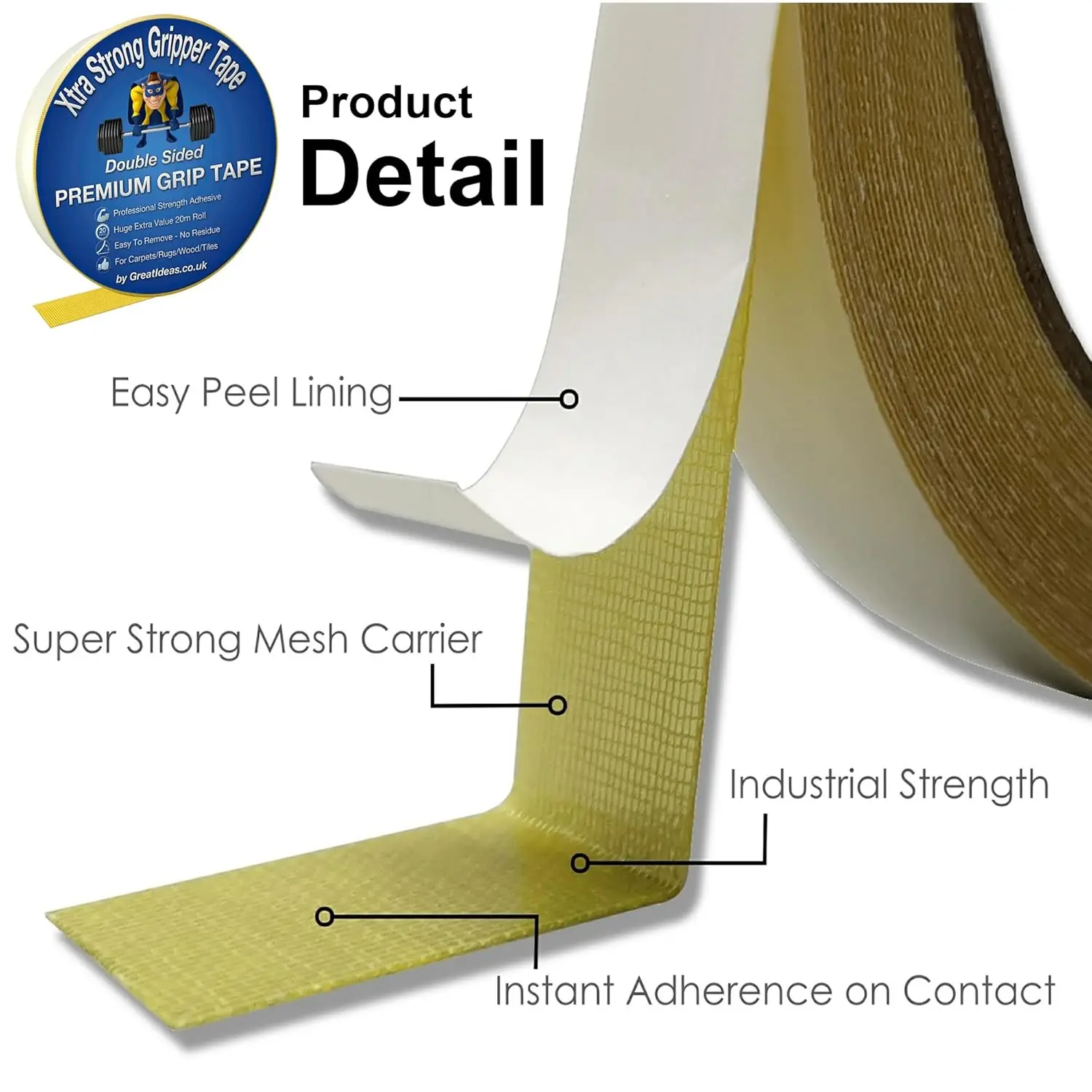 Engineered for instant grip and long-term hold. This industrial-grade adhesive tape features a reinforced mesh carrier for maximum strength and effortless application ideal for rugs, mats, and heavy-duty DIY.
