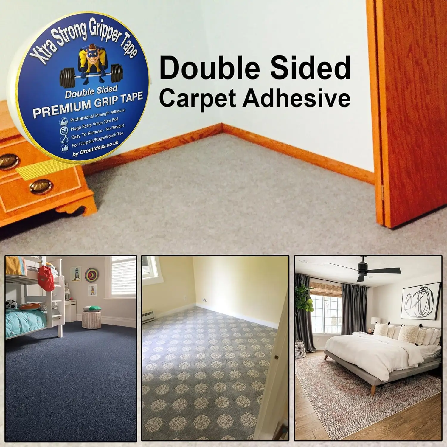 - Double Sided Carpet Tape: Heavy Duty Rug Gripper Tape
