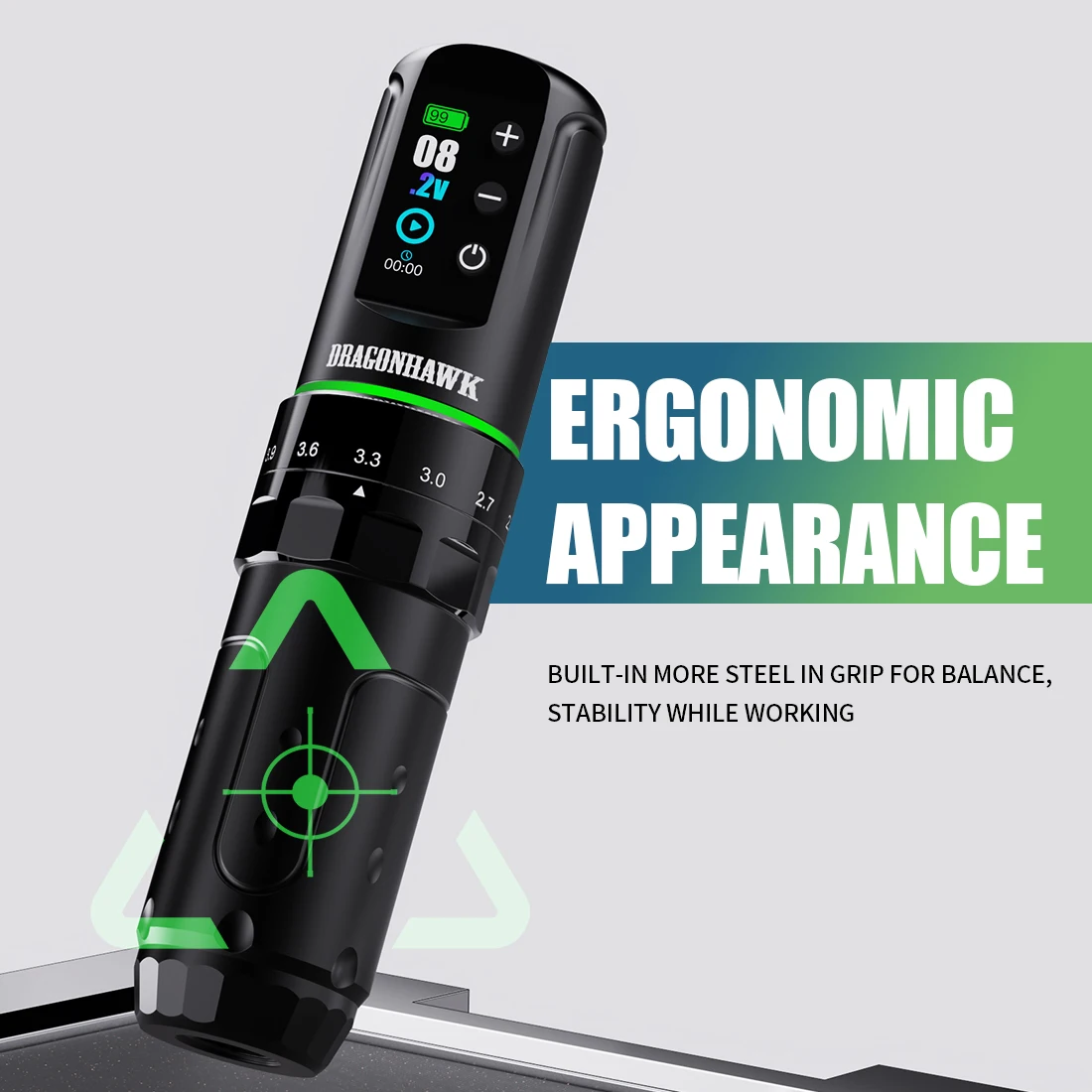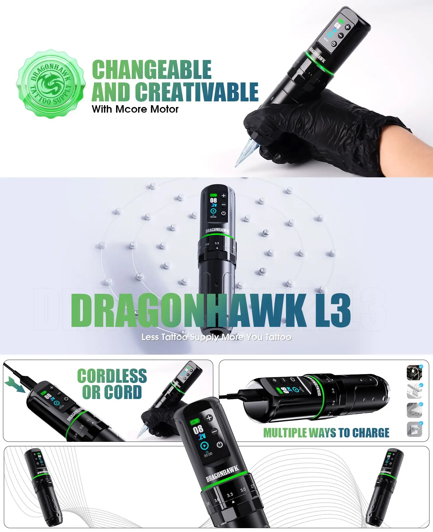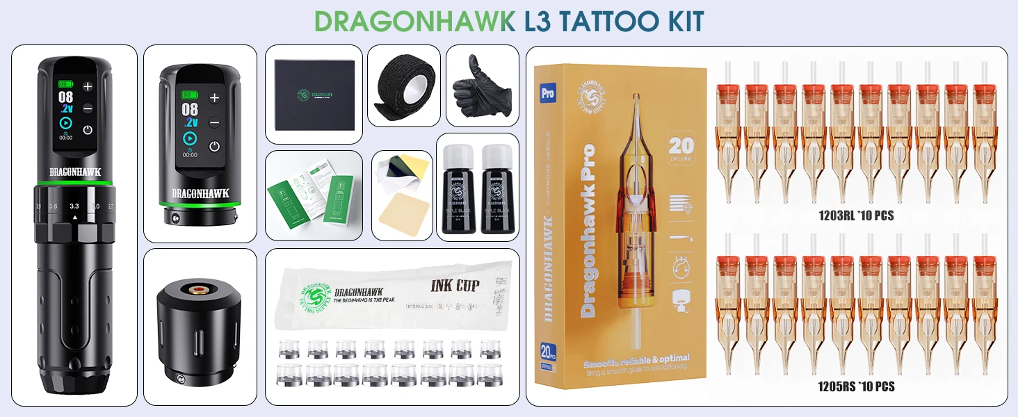 Designed for professional tattoo artists, the Dragonhawk L3 excels in lining, shading, and blending; Its cordless design offers freedom and control for high-quality results