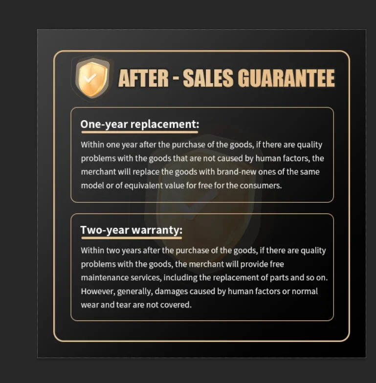 Within one year after the purchase of the goods, if there are quality problems with the goods that are not caused by human factors, the merchant will replace the goods with brand-new ones of the same model or of equivalent value for free for the consumers.