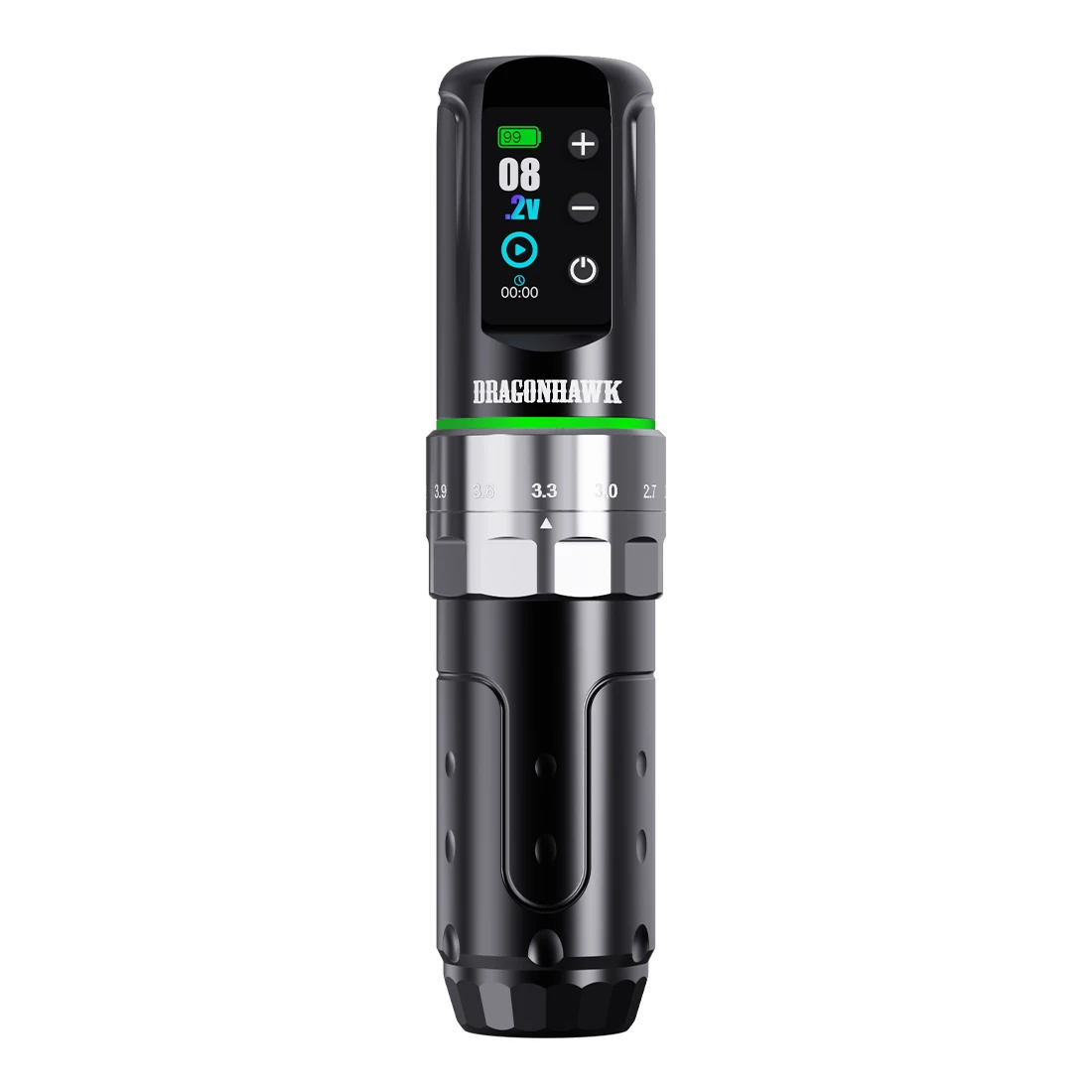 The Dragonhawk L3 tattoo machine is 140 mm (5.5 in) long and weighs 233 g; With a 32 mm grip for comfort, it operates cordlessly for up to 7 hours; The upgraded smart screen enhances visibility and user experience