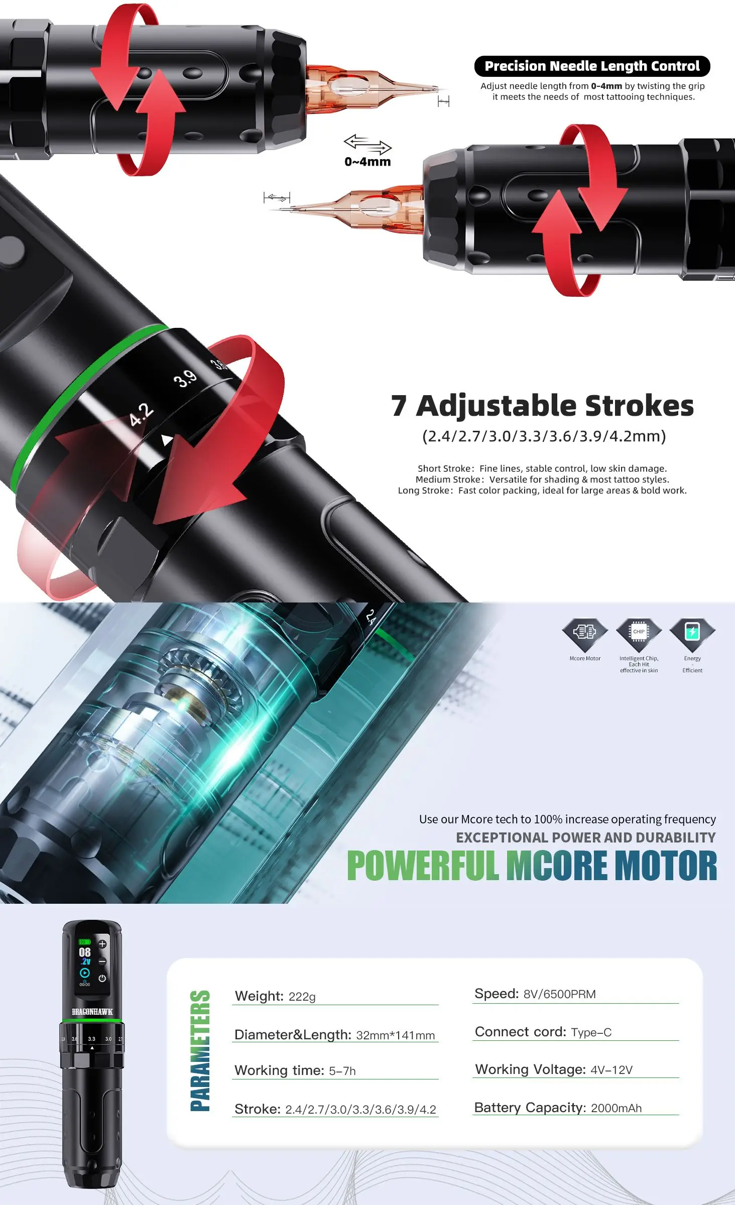 The Dragonhawk L3 tattoo machine is 140 mm (5.5 in) long and weighs 233 g; With a 32 mm grip for comfort, it operates cordlessly for up to 7 hours; The upgraded smart screen enhances visibility and user experience