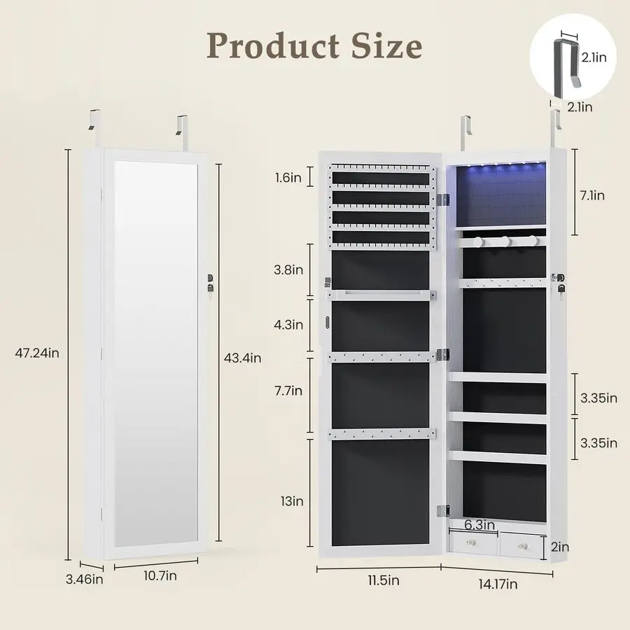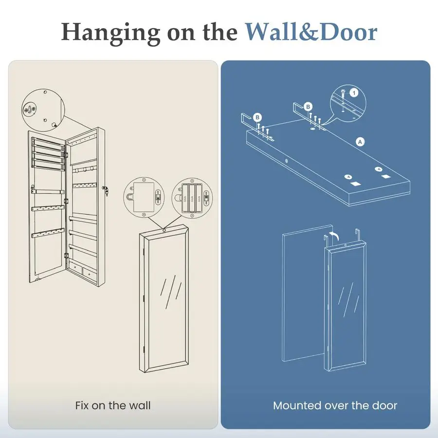 Flexible Placement SafetyMount it on any wall or hang it over the door DUMOS jewelry cabinet adapts to your space with adjustable height. Includes a lock and 2 keys to keep curious out and protect your valuables. Your security, your choice.