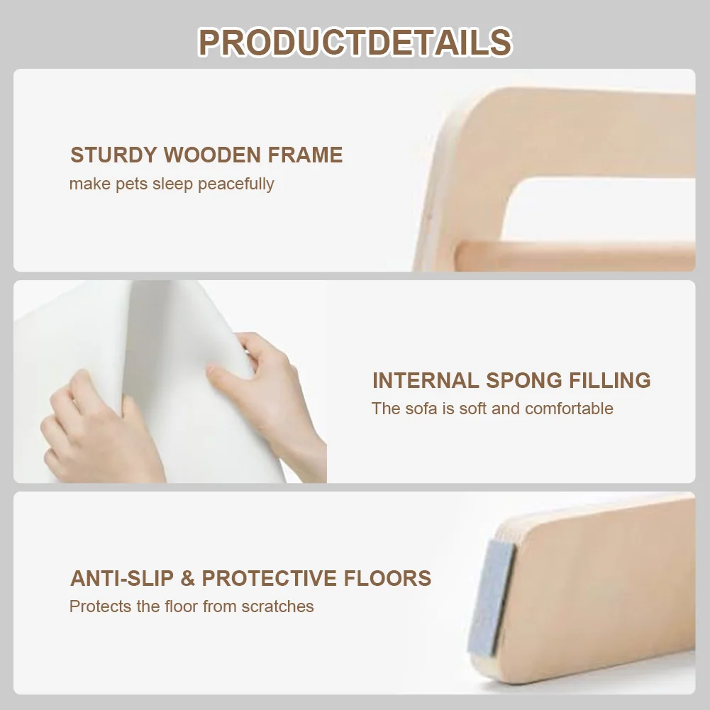 5. Size: Measuring 56*45*27cm/22*17.7*10.6in (L*W*H), this pet couch bed suits various cats and small to medium dogs, featuring a sturdy wooden frame supporting up to 15kg.