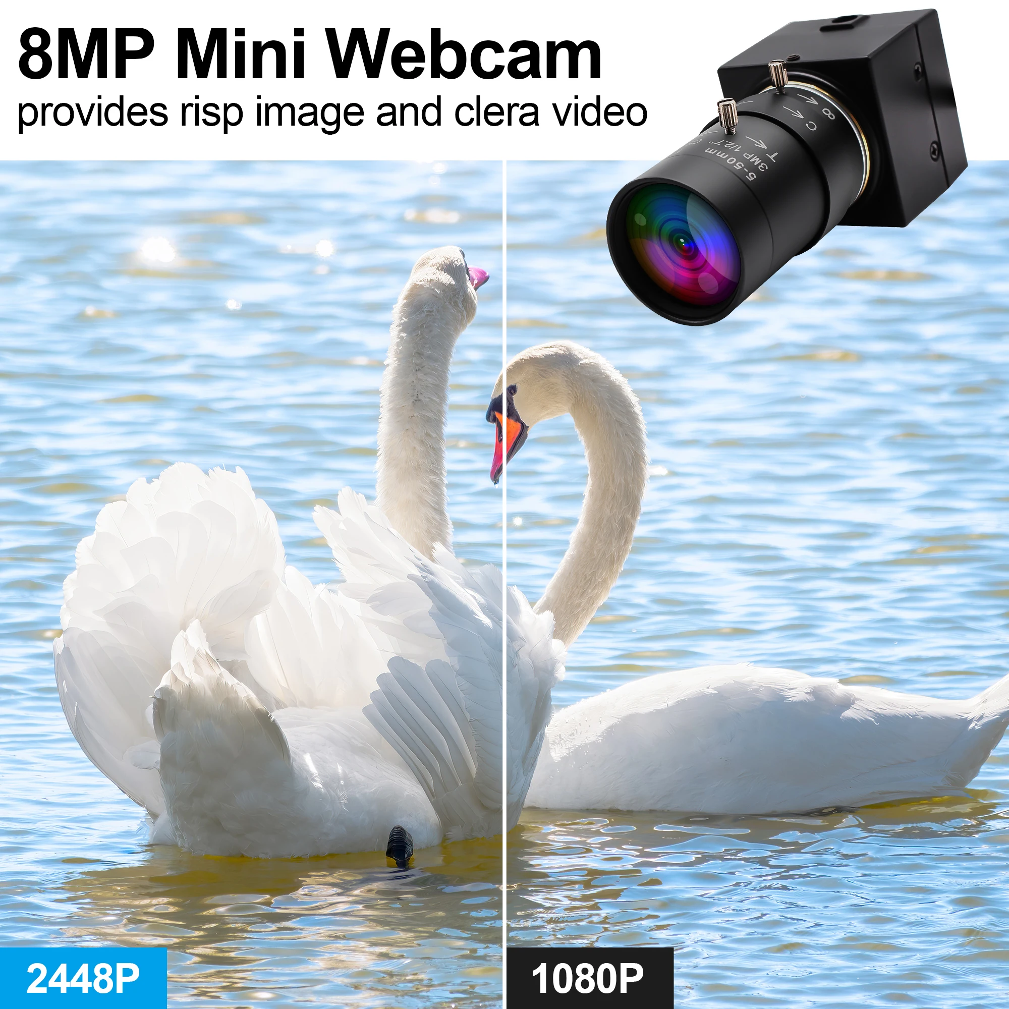 Super HD 8MP High Resolution: The streaming camera provides incredibly sharp full hd 2448P to capture crystal clear images and records 2448P@15fps video. 8megapixels usb camera max. resolution is: 3264(H)X2448(V), High definition 1024×768@30fps/3200×2400@ 20fps/3264X2448@15fps. Compression format: MJPEG / YUV2(YUYV)