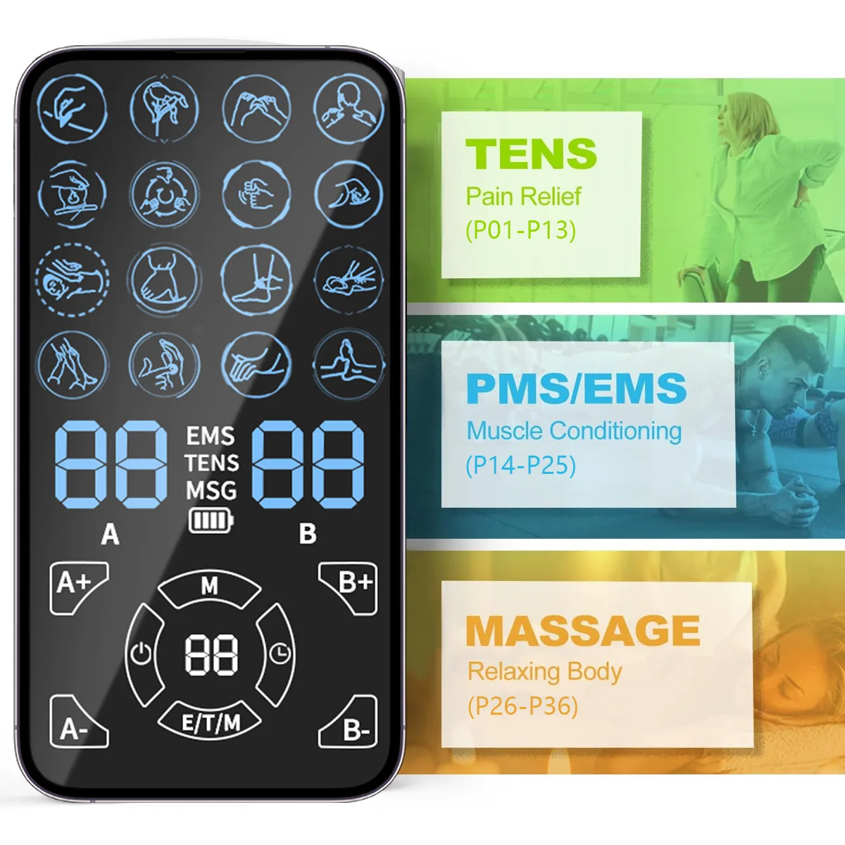 1.TENS/EMS/MAS three types of pulse physical therapy simulate human body massage, effectively stimulate muscles, promote blood circulation, relieve muscle soreness, and reduce physical fatigue.