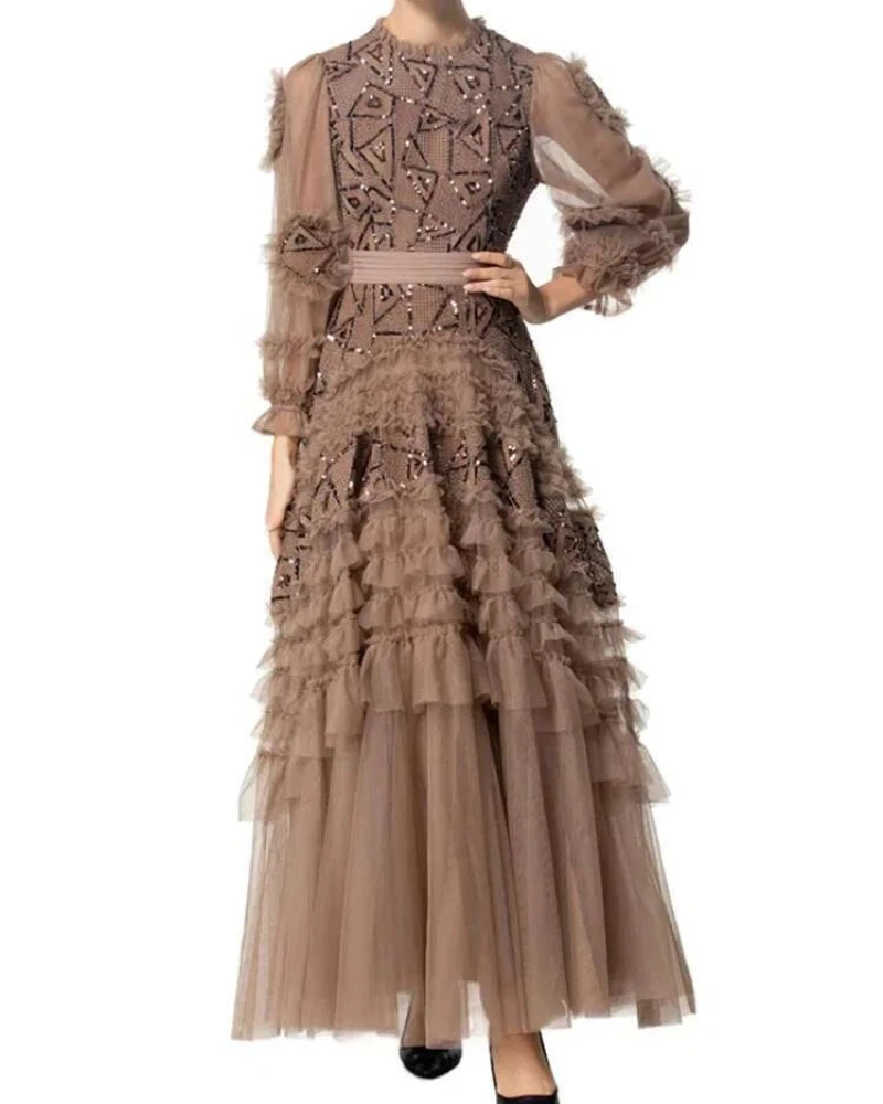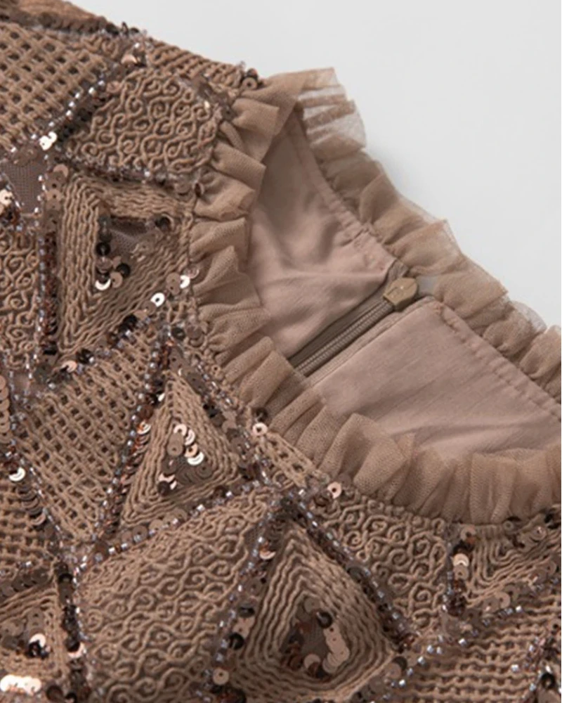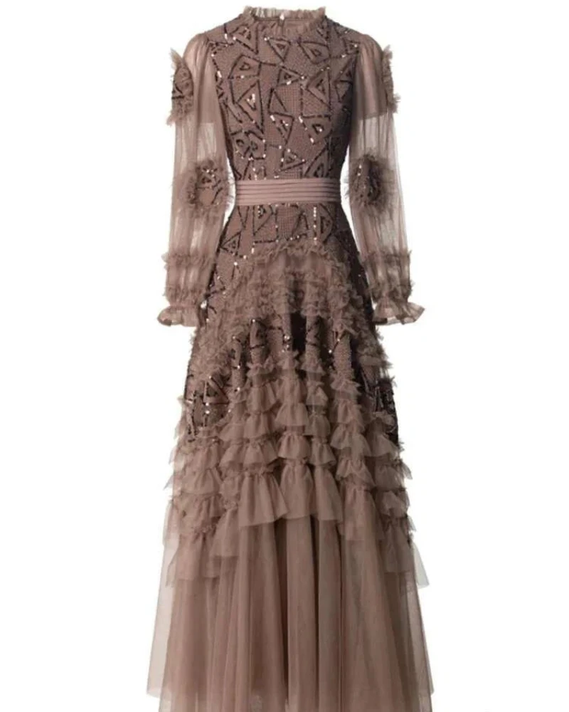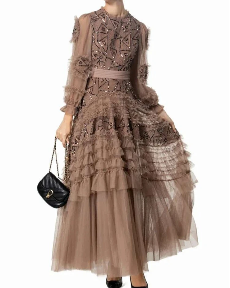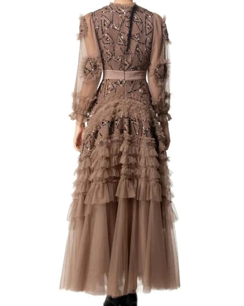 European and American Socialite Spring/Summer 2025 Luxury Sequin Nail Bead Ruffle Fluffy Princess Style Long Performance Dress