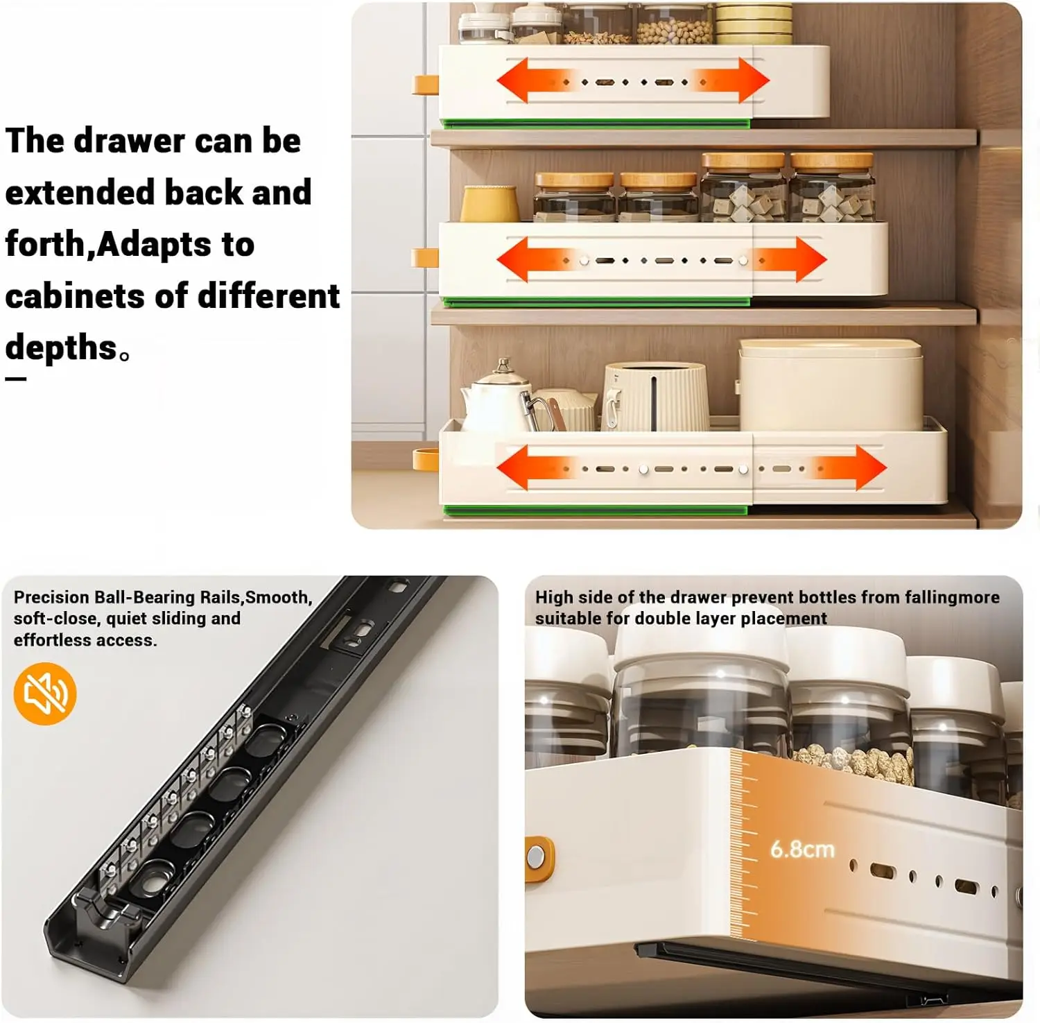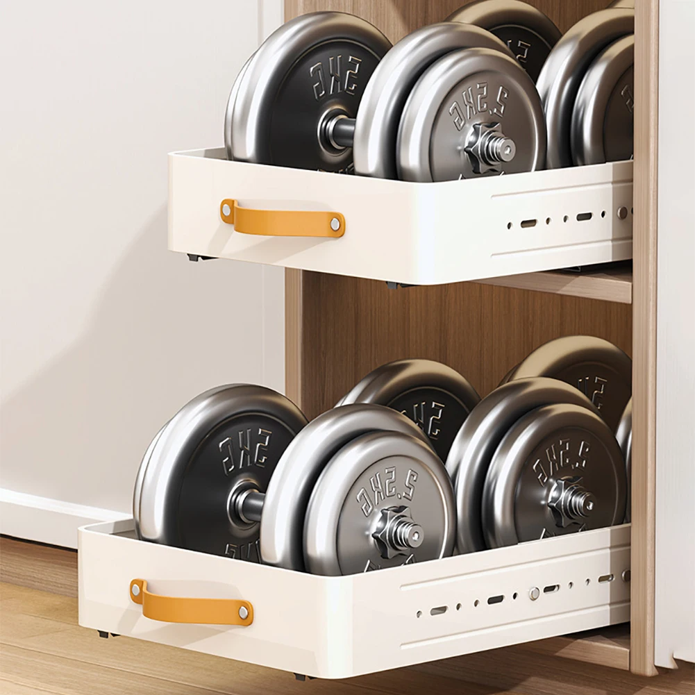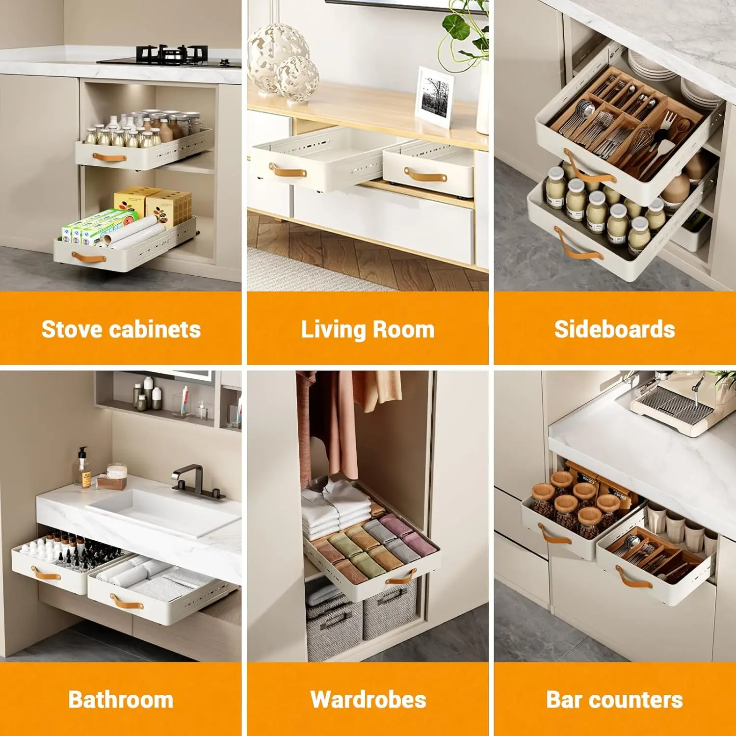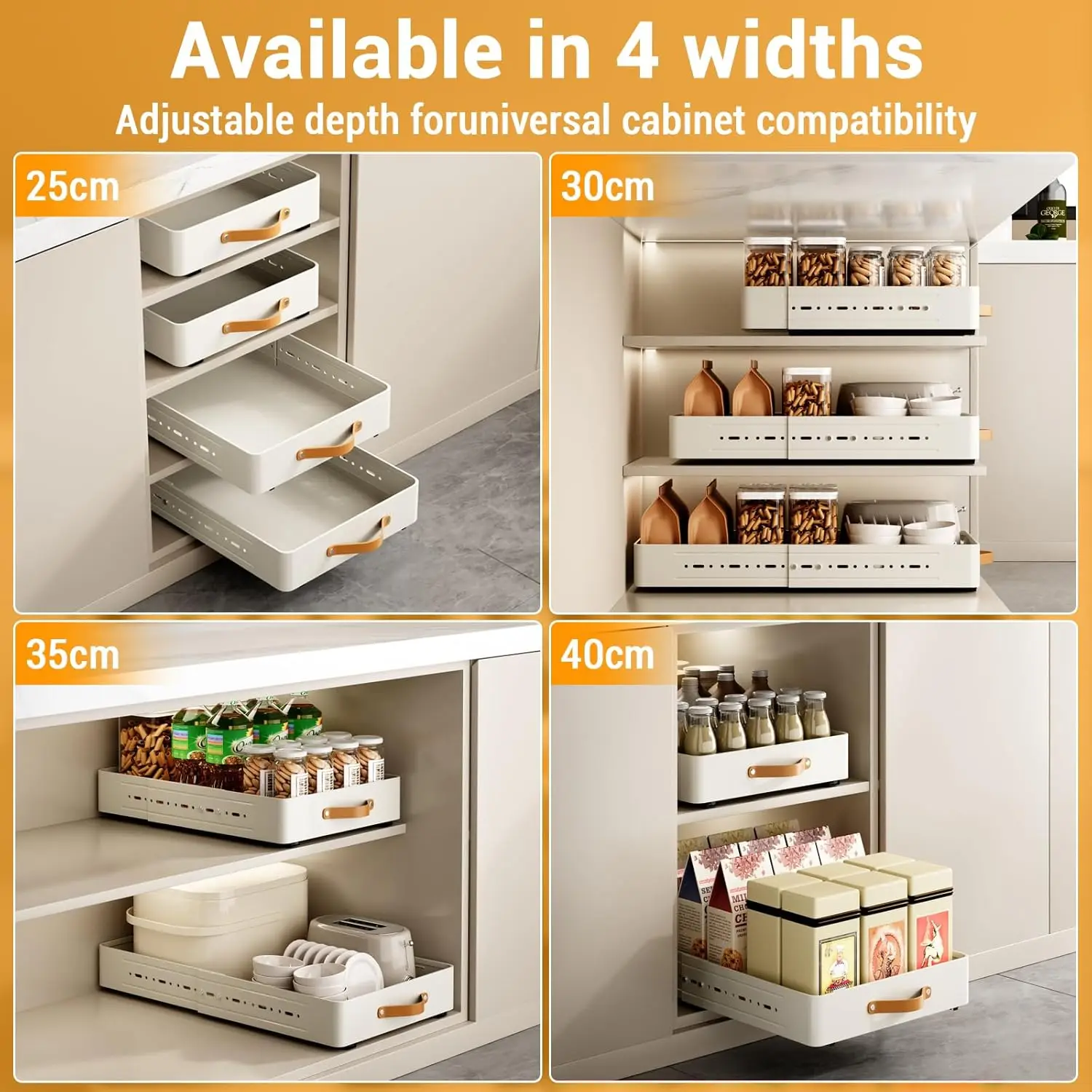 【Smooth Bottom Slides】Pull Out Cabinet Organizer comes with 2 smooth sliding bottom slides with holes on the side for pull-outs, so you can experience quiet and silky smooth operation every time you open and close the drawers, you can maximise the use of your cabinet space and effortlessly access all your pots, pans, small kitchen utensils, cleaning supplies, canned food and other items, making organising your cupboard space a breeze.