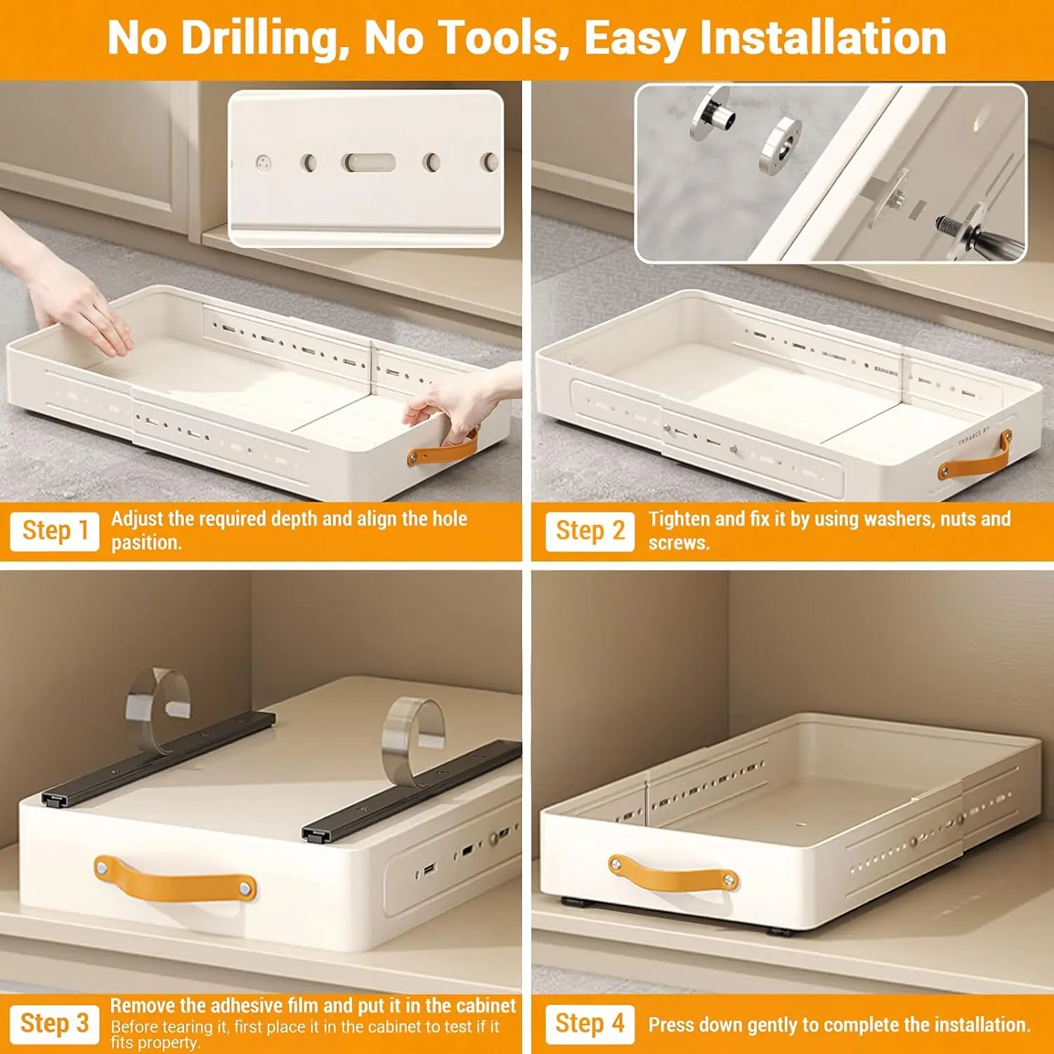 【2 Installation Methods】Cupboard Pull Out Storage has two available installation methods, the first is the strong adhesive film that comes with each drawer, which utilises adhesive strips instead of drilling holes in the cabinets, and can be easily installed by simply following the instructions, saving time and effort. The second is a drilled and nailed installation using the available holes in the drawer bottom slides.