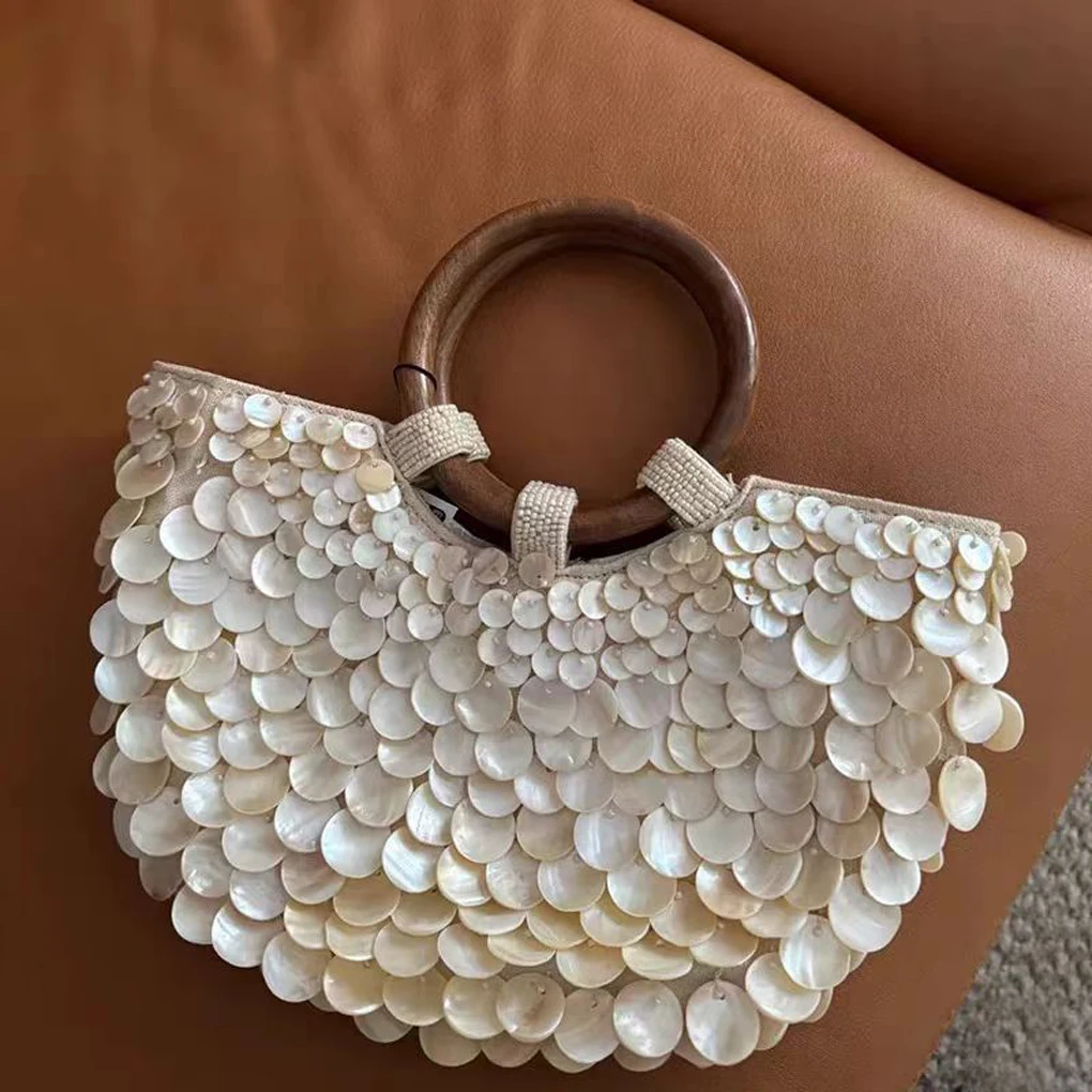 Fashionable design: The beach pearl bag has a moon shaped top with double circular wooden handles, combined with beach style.