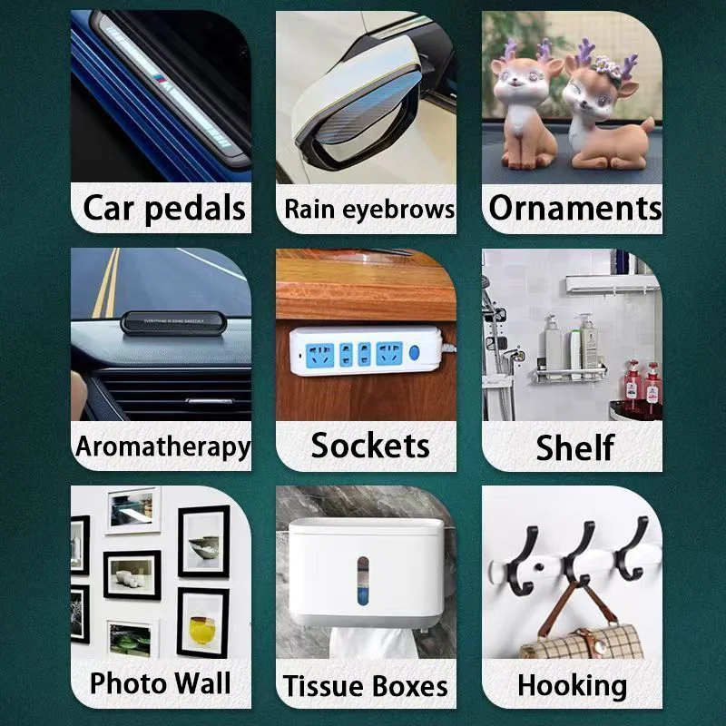 3.Multiusos:Úselo para fijar o pegar artículos, como pared de cuadros, soporte para teléfono de automóvil, adhesivo de pared, gancho, almohadillas adhesivas, fundas de teléfonos, etc.