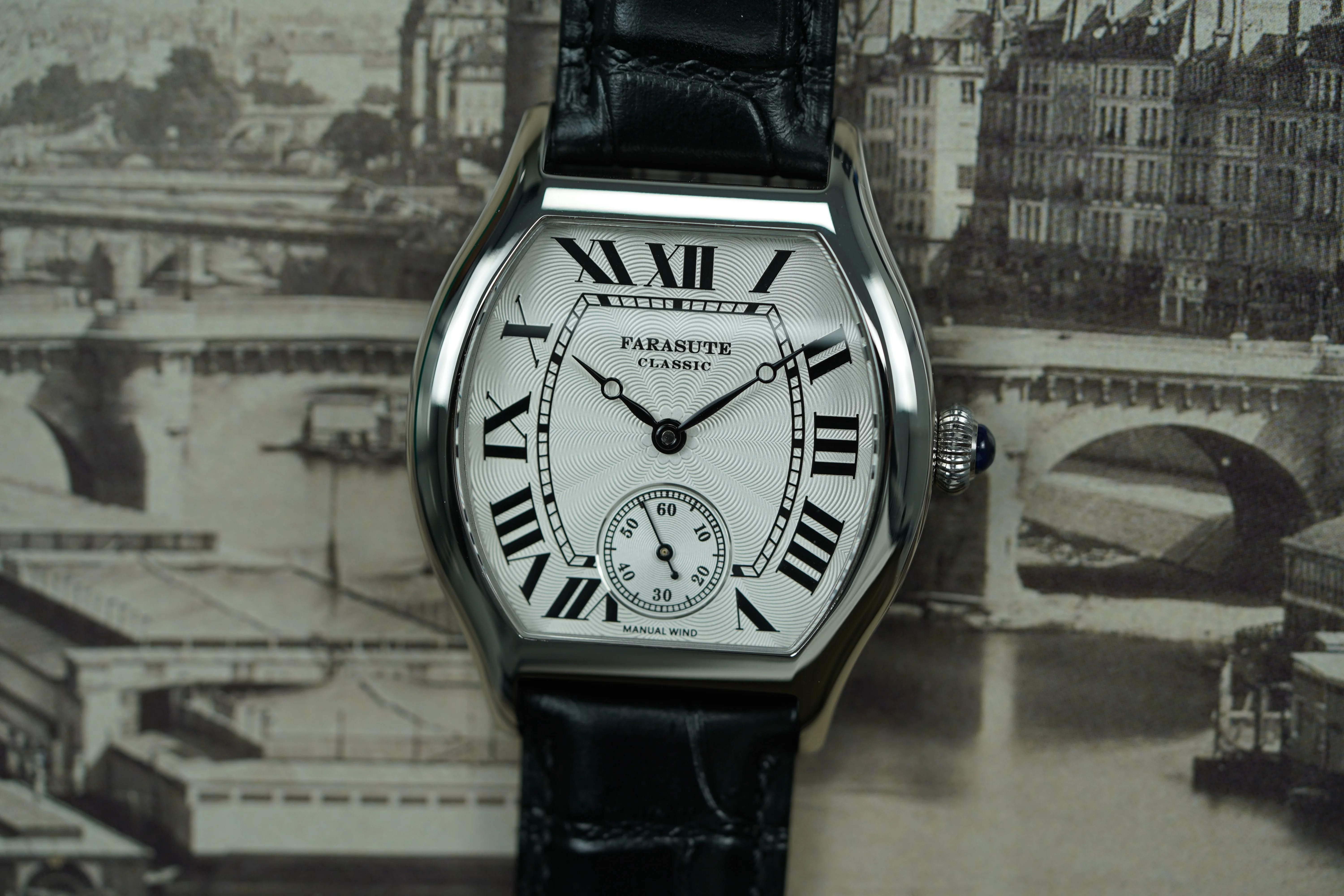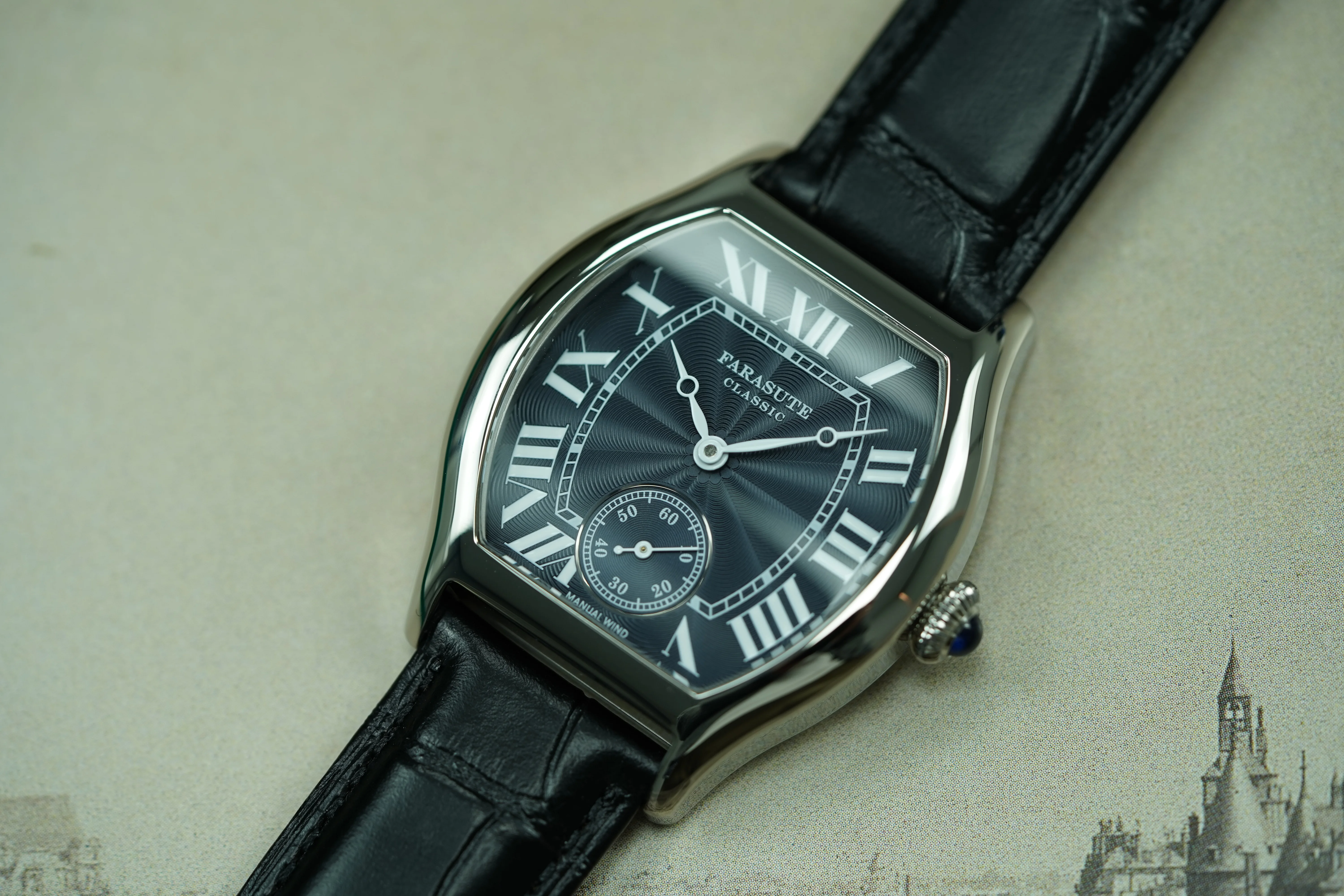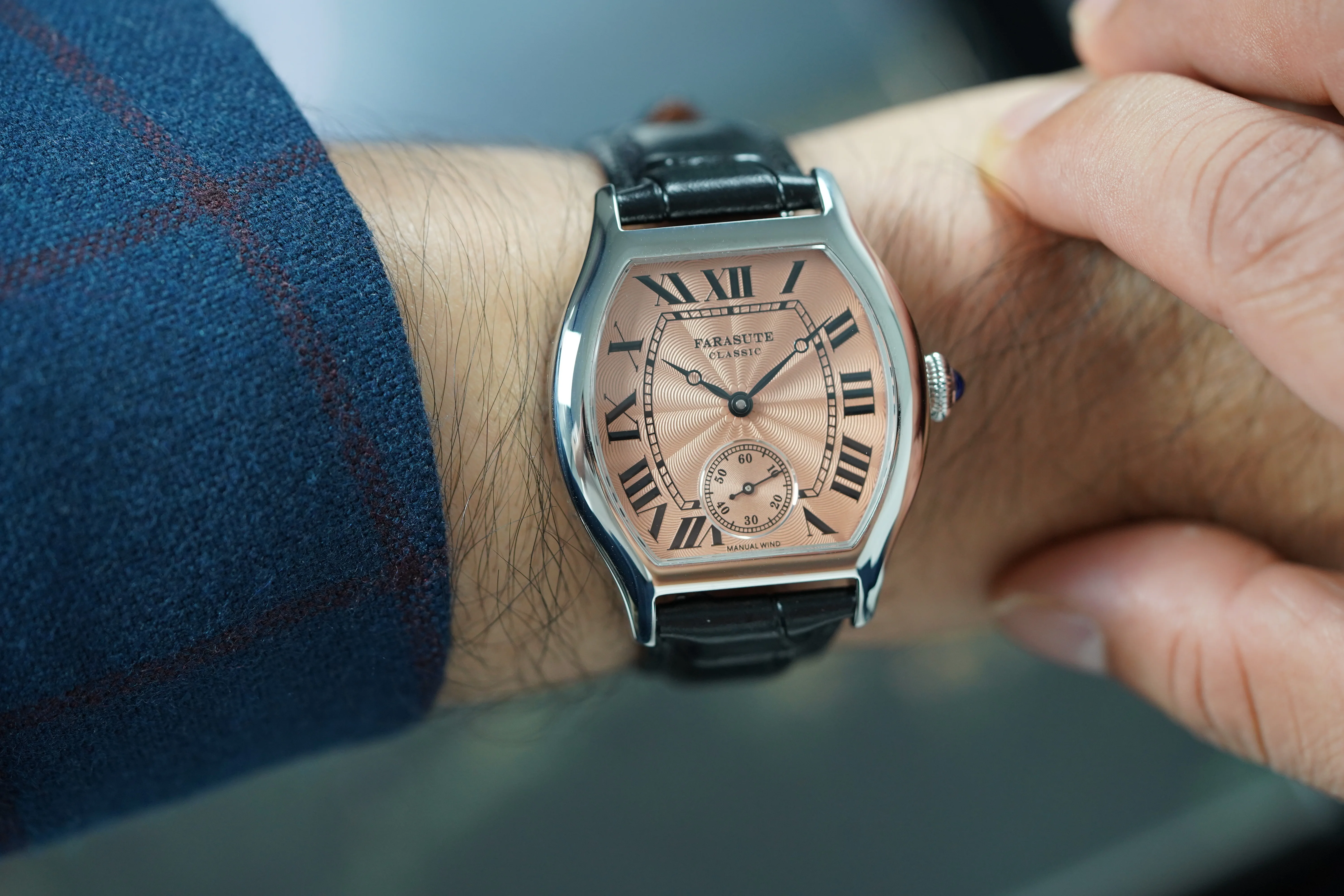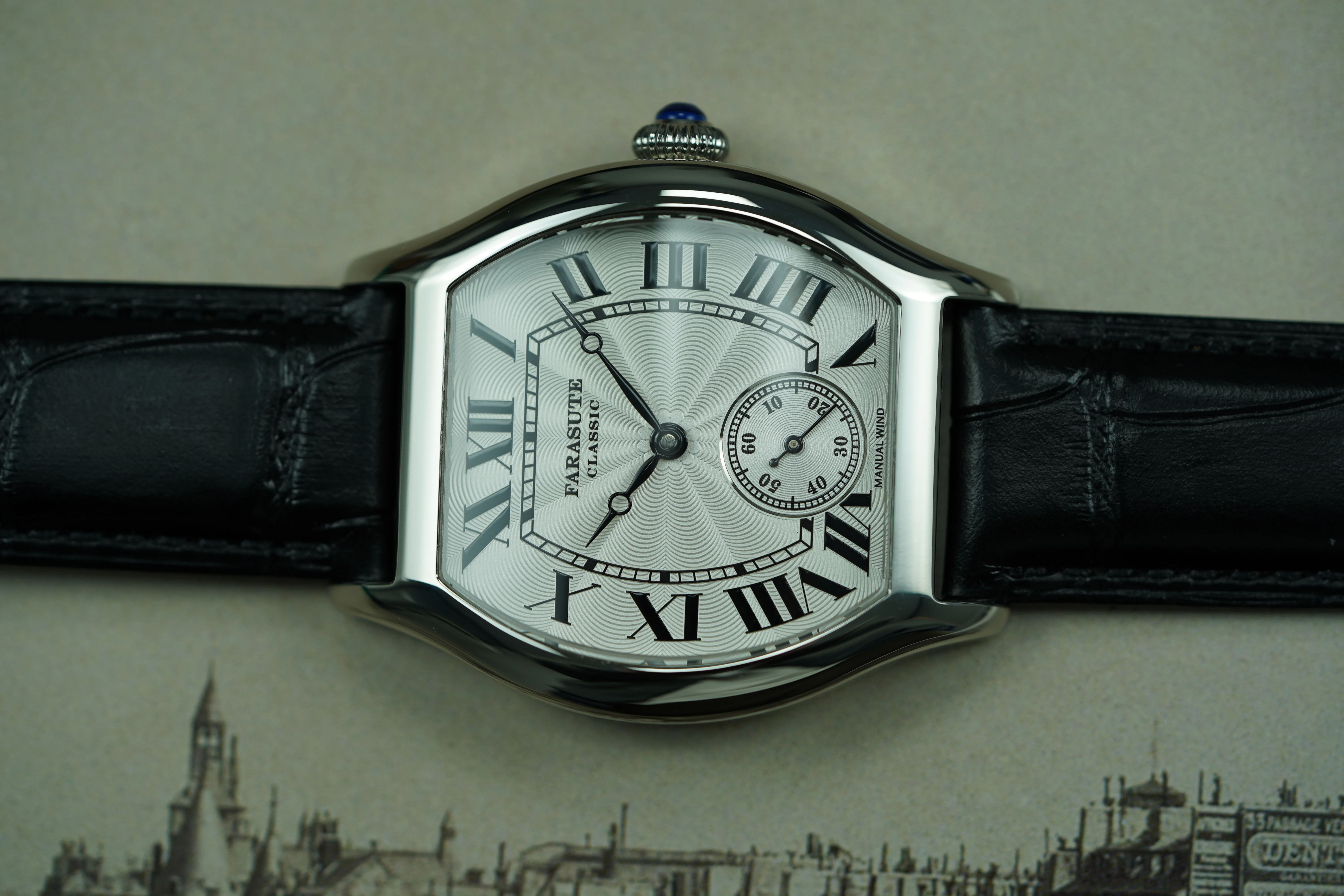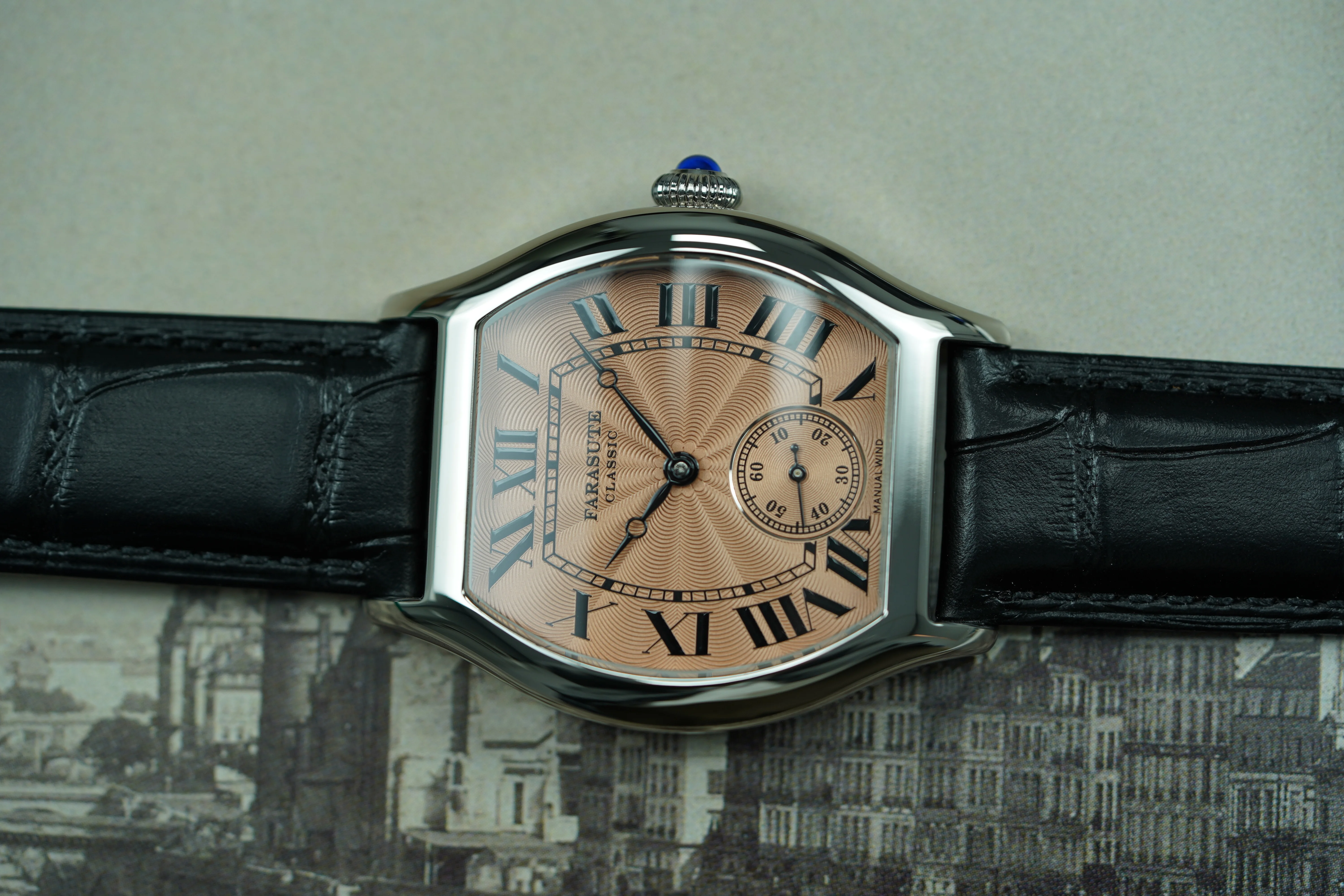 An elegant homage to cartier tortue platinum. the guilloche dial is stunning. the size is perfect for a dress watch. overall i am impressed by the quality of this watch. well done farasute!