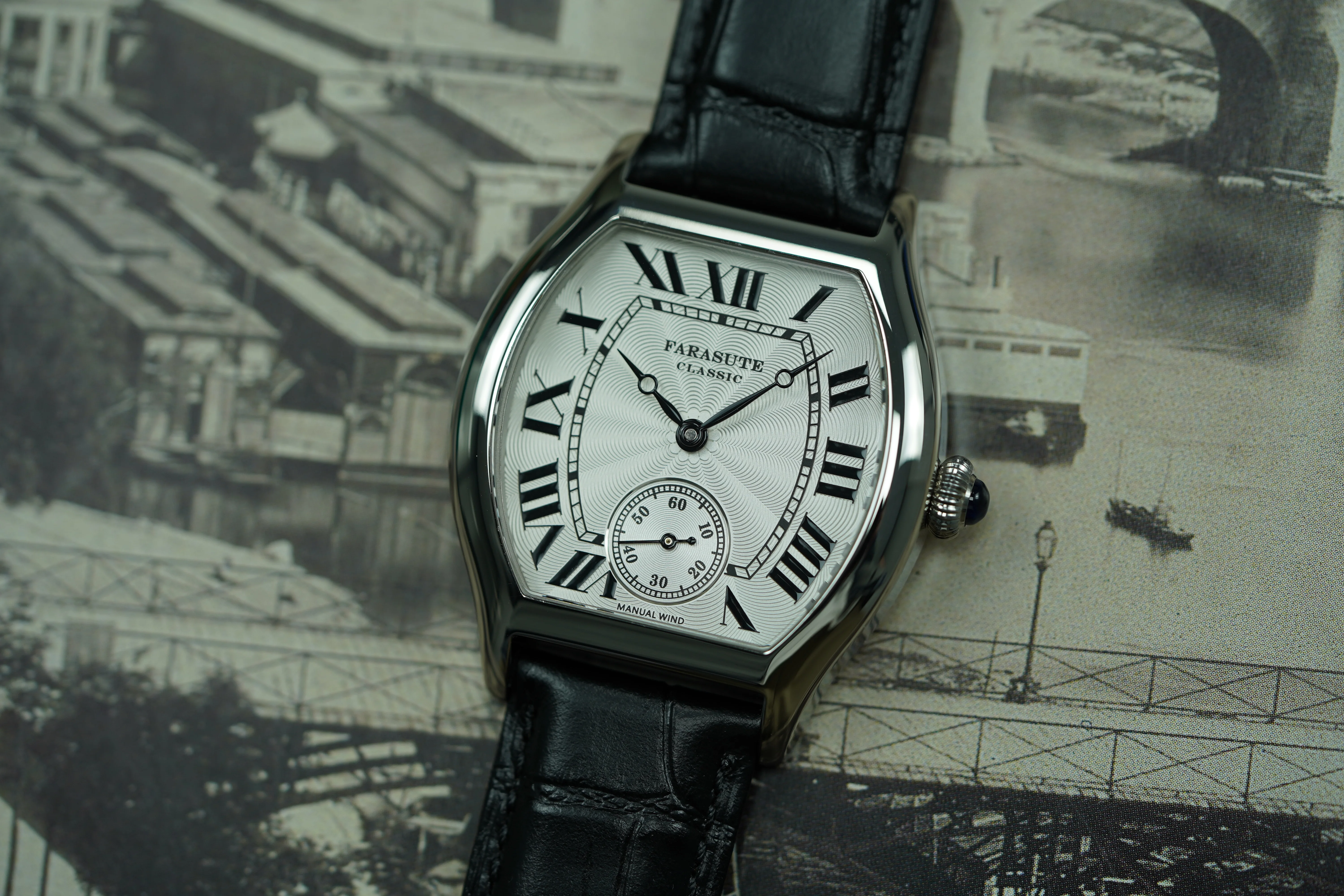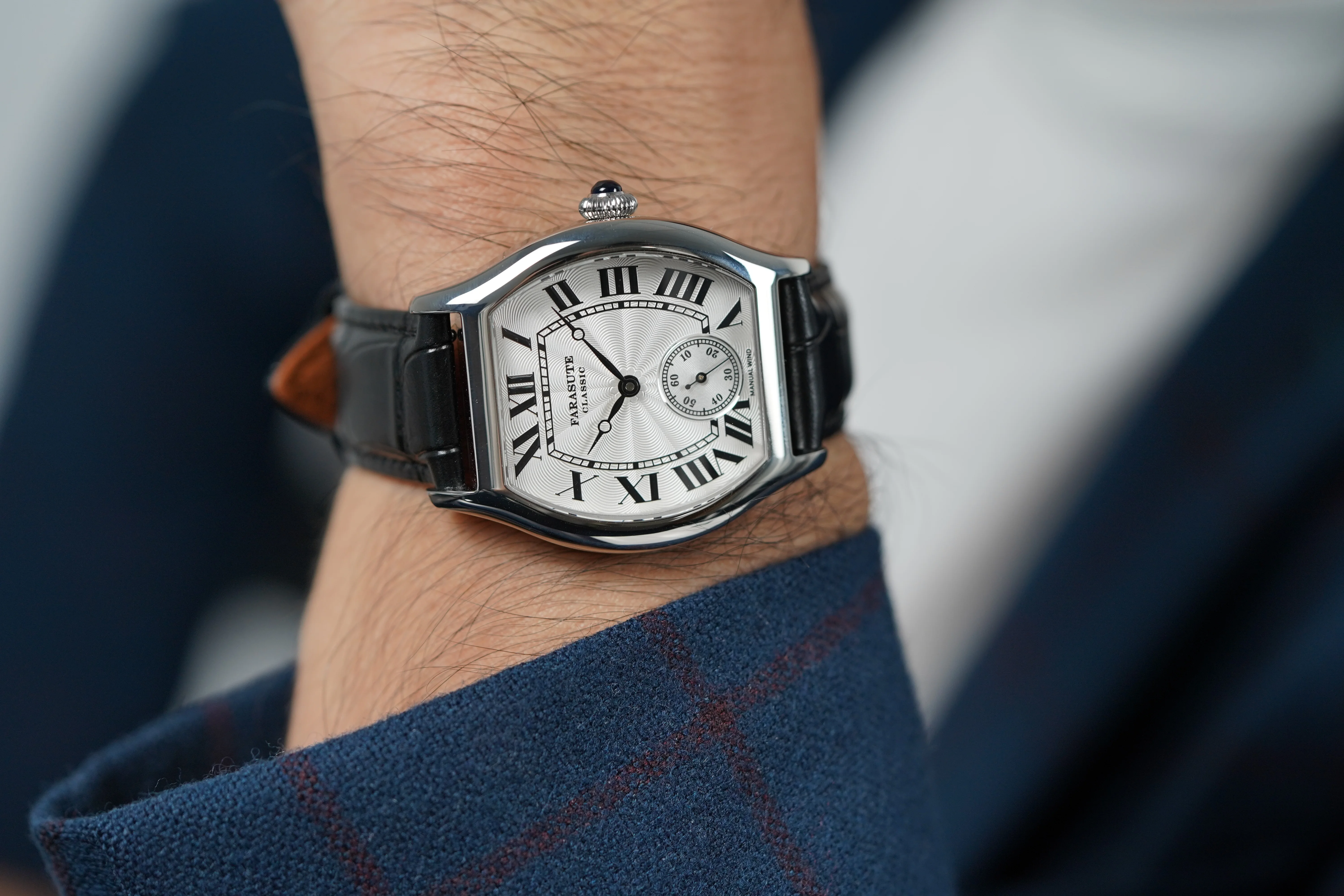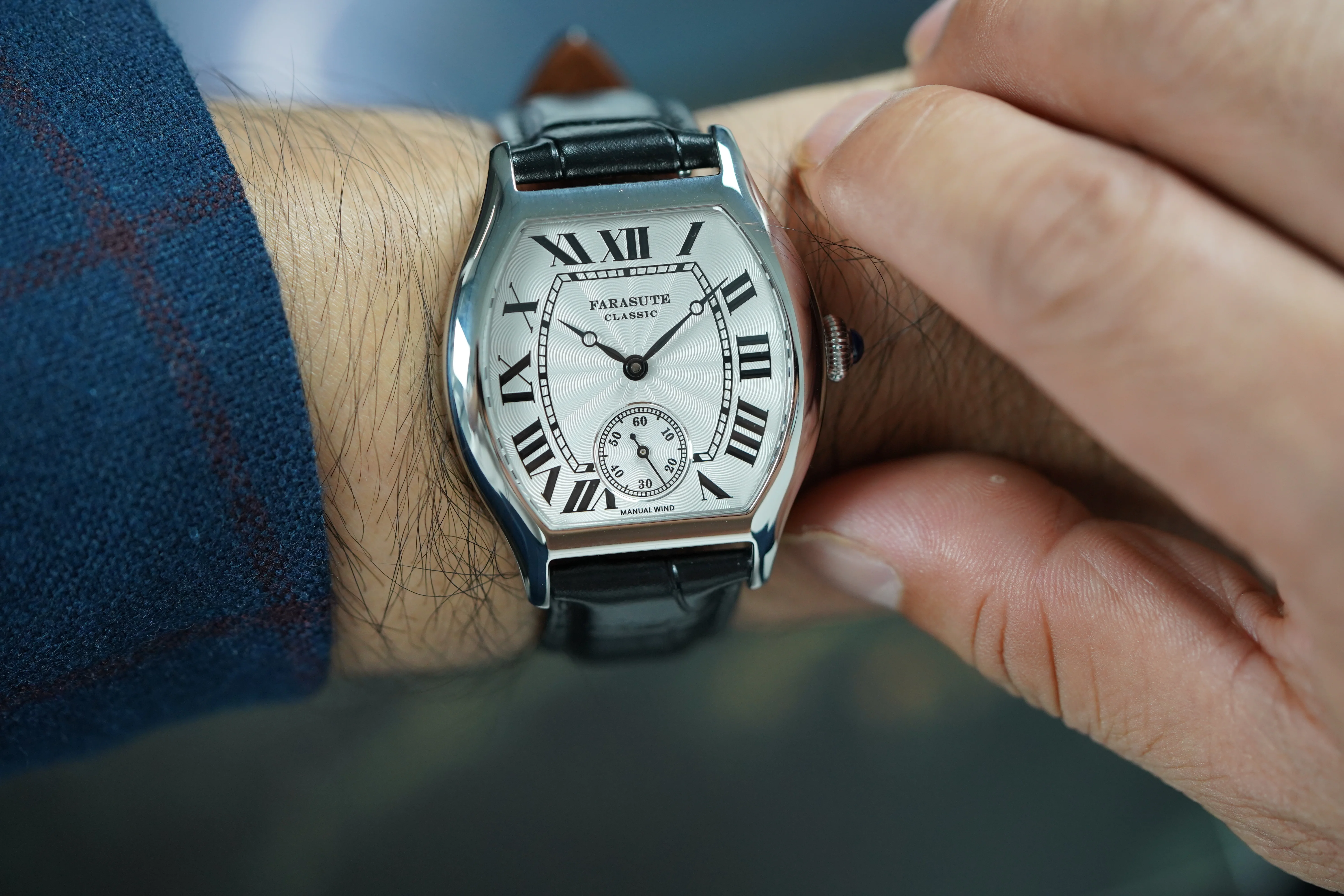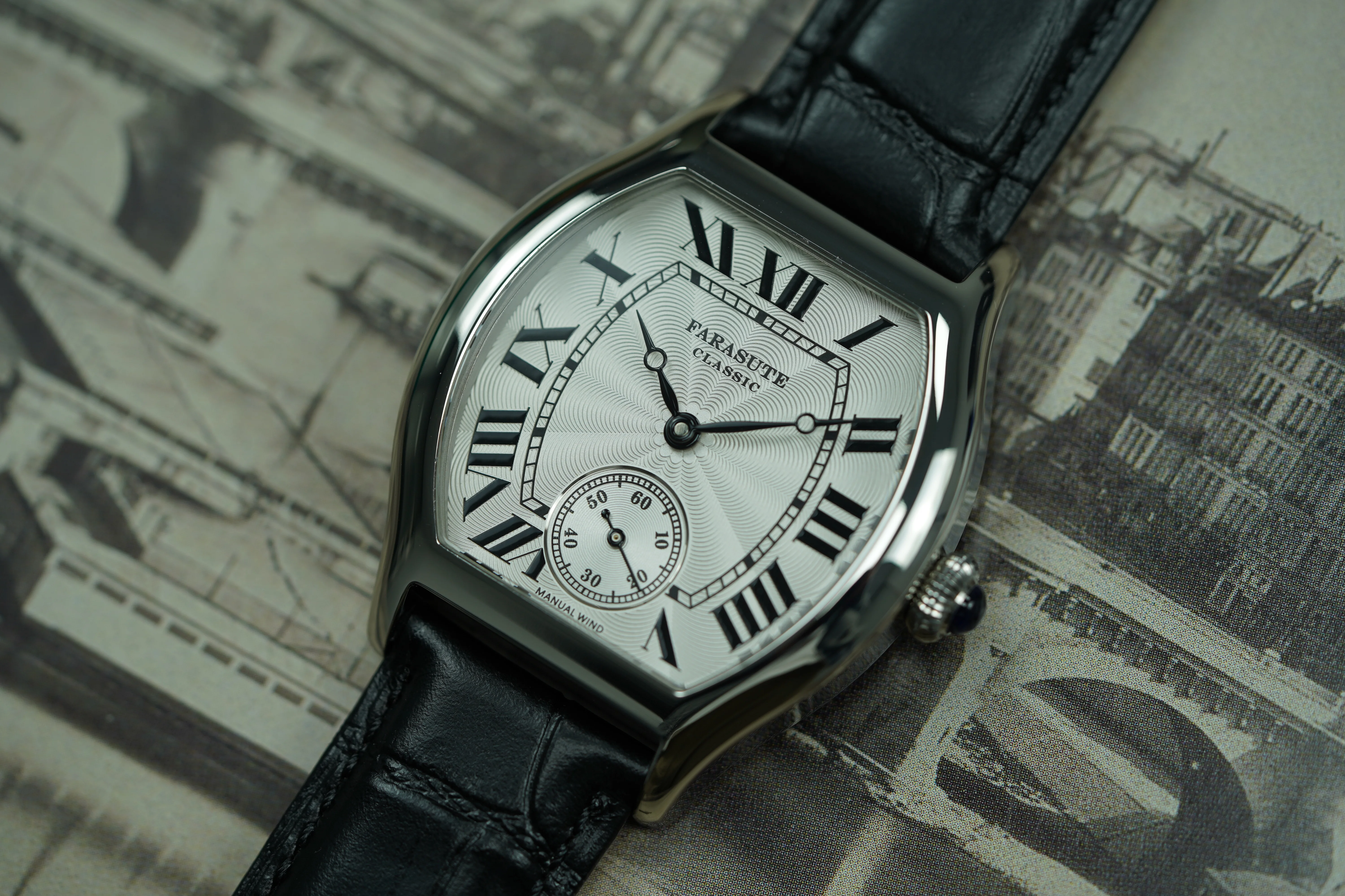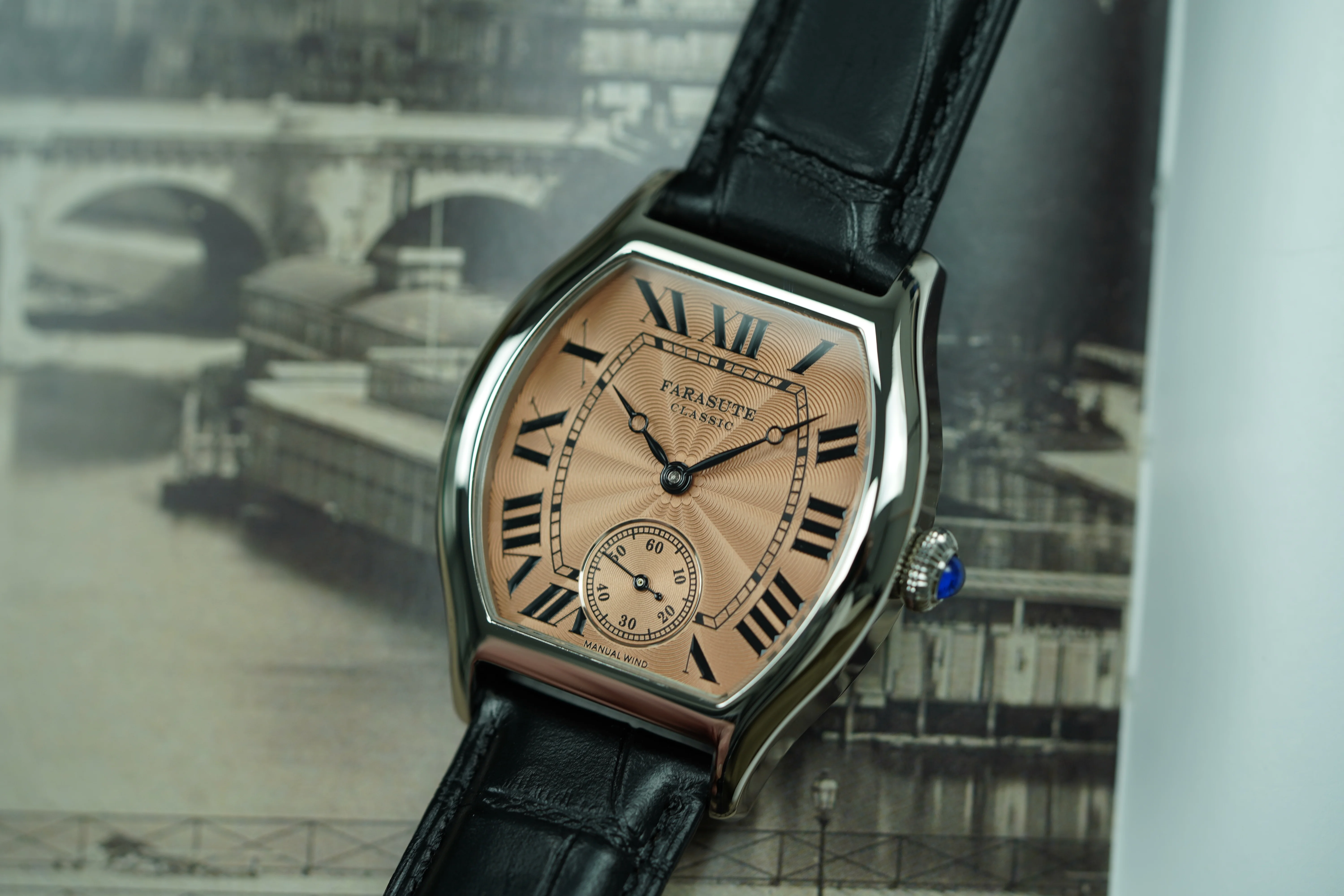 An elegant homage to cartier tortue platinum. the guilloche dial is stunning. the size is perfect for a dress watch. overall i am impressed by the quality of this watch. well done farasute!