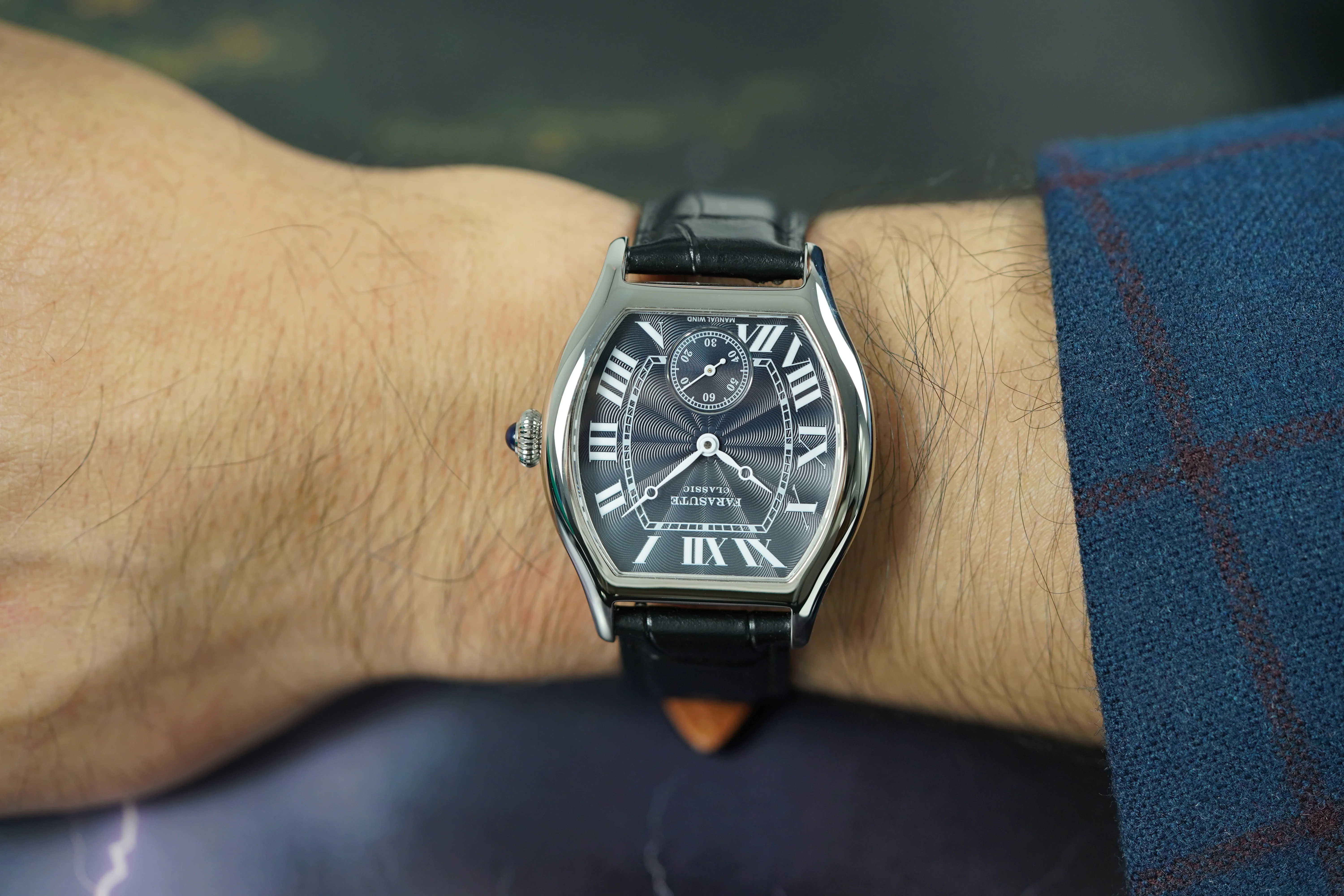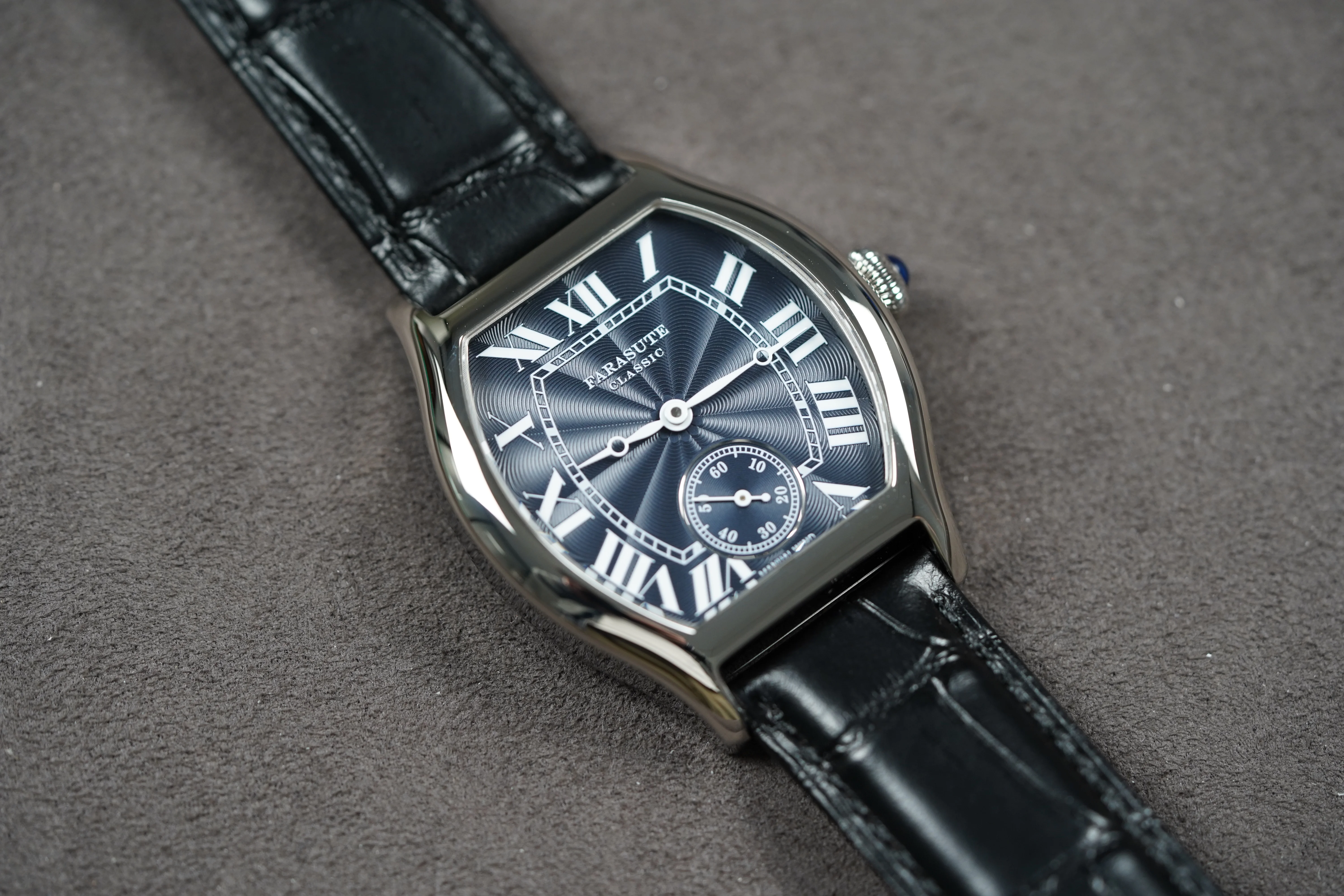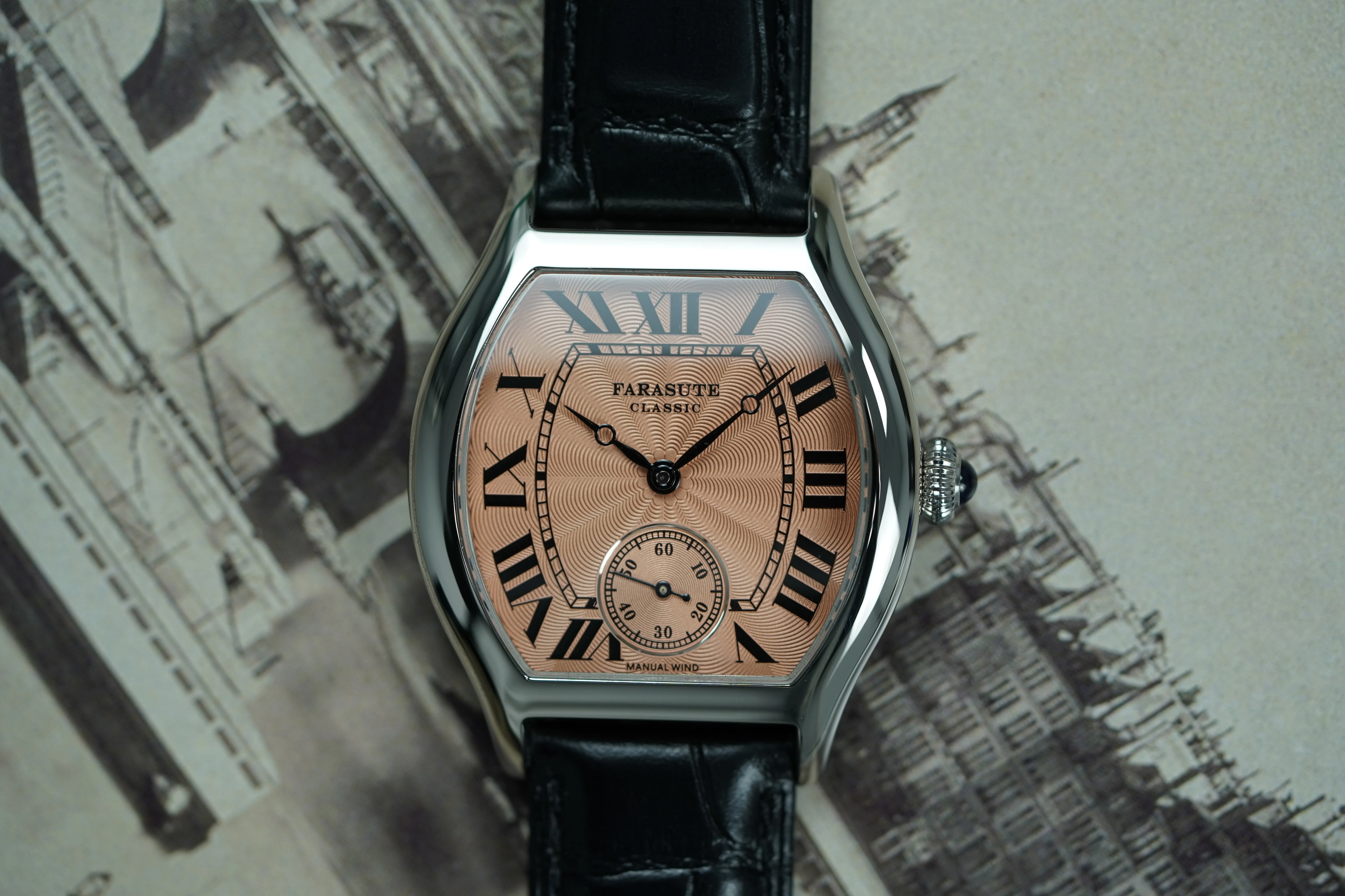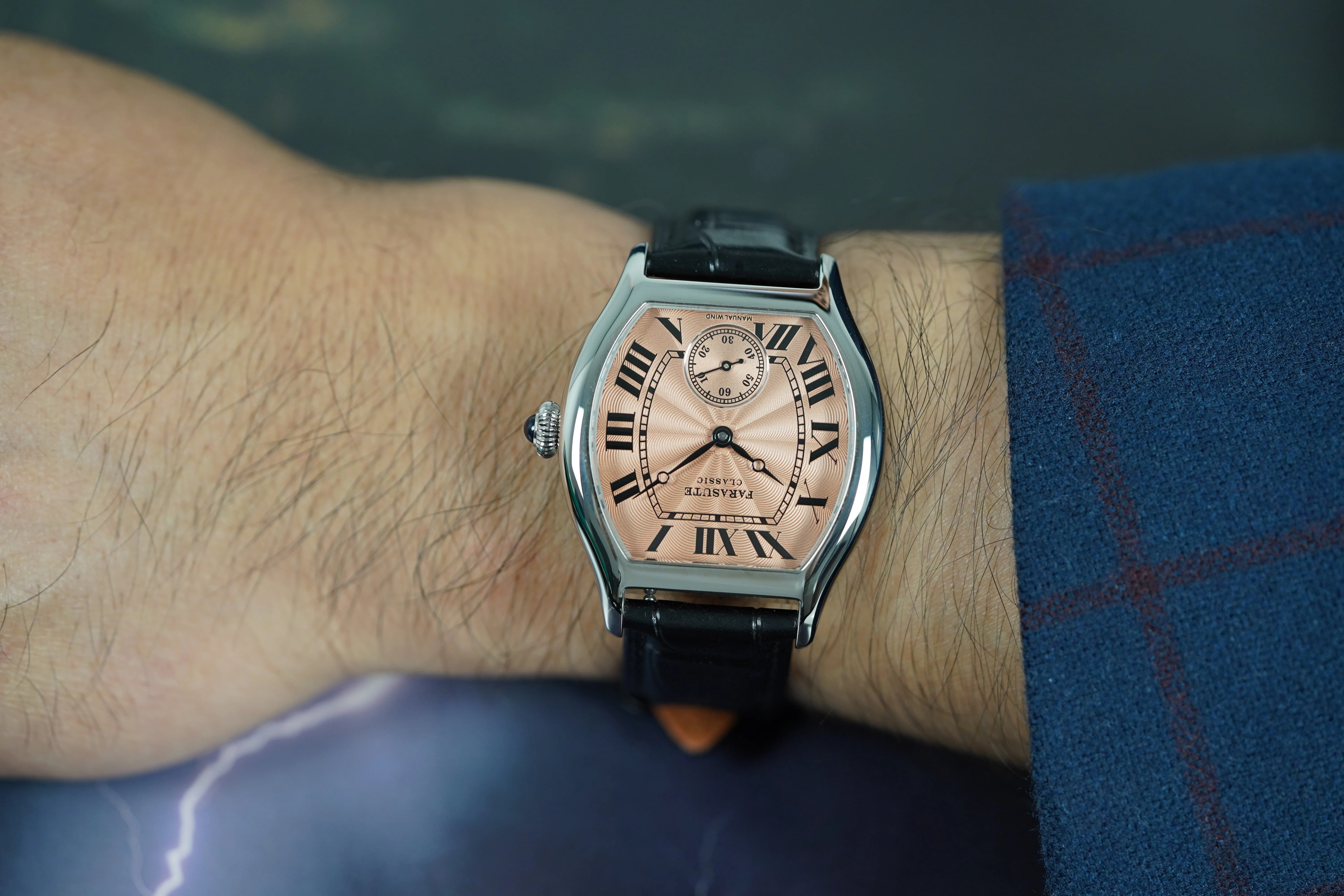 An elegant homage to cartier tortue platinum. the guilloche dial is stunning. the size is perfect for a dress watch. overall i am impressed by the quality of this watch. well done farasute!