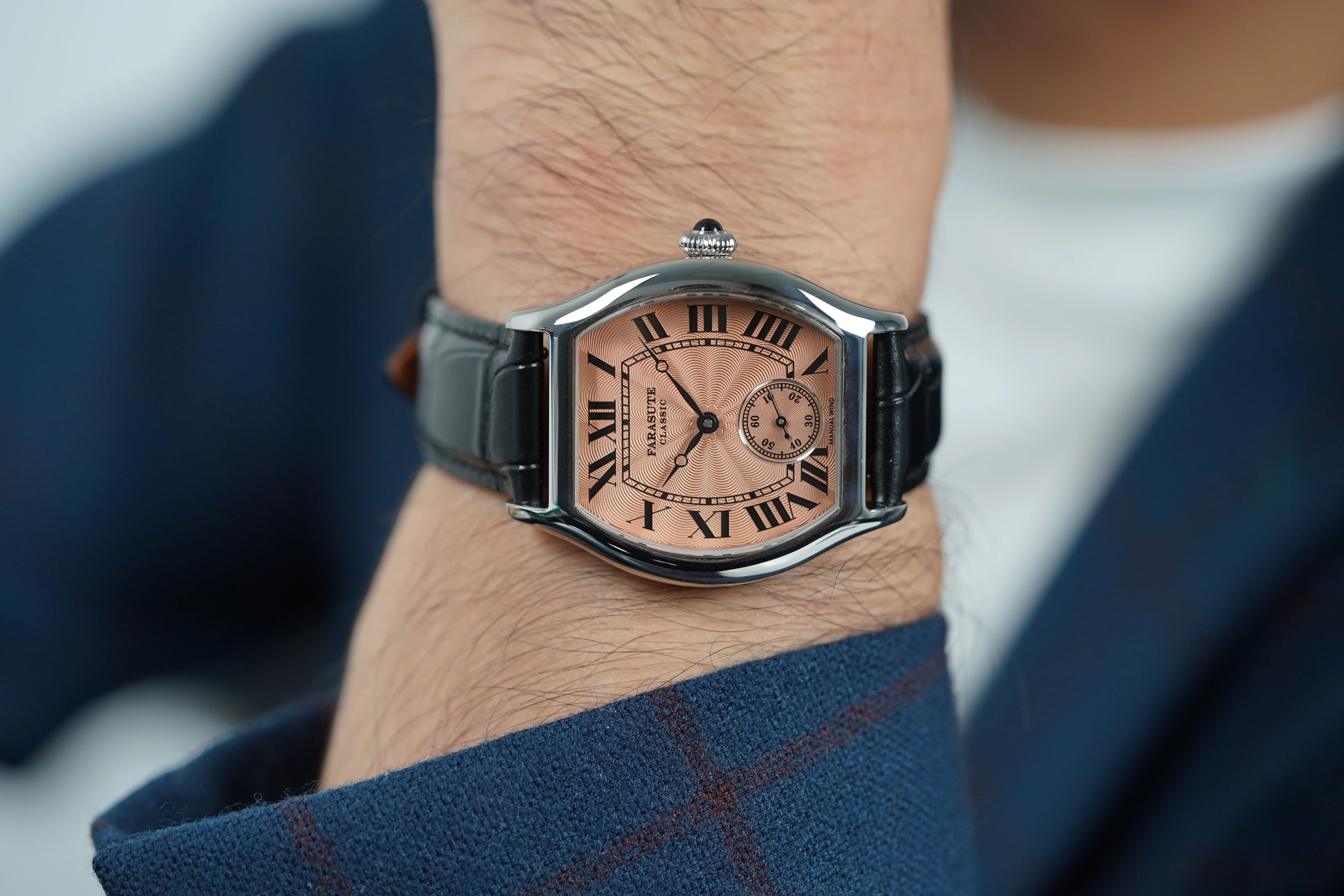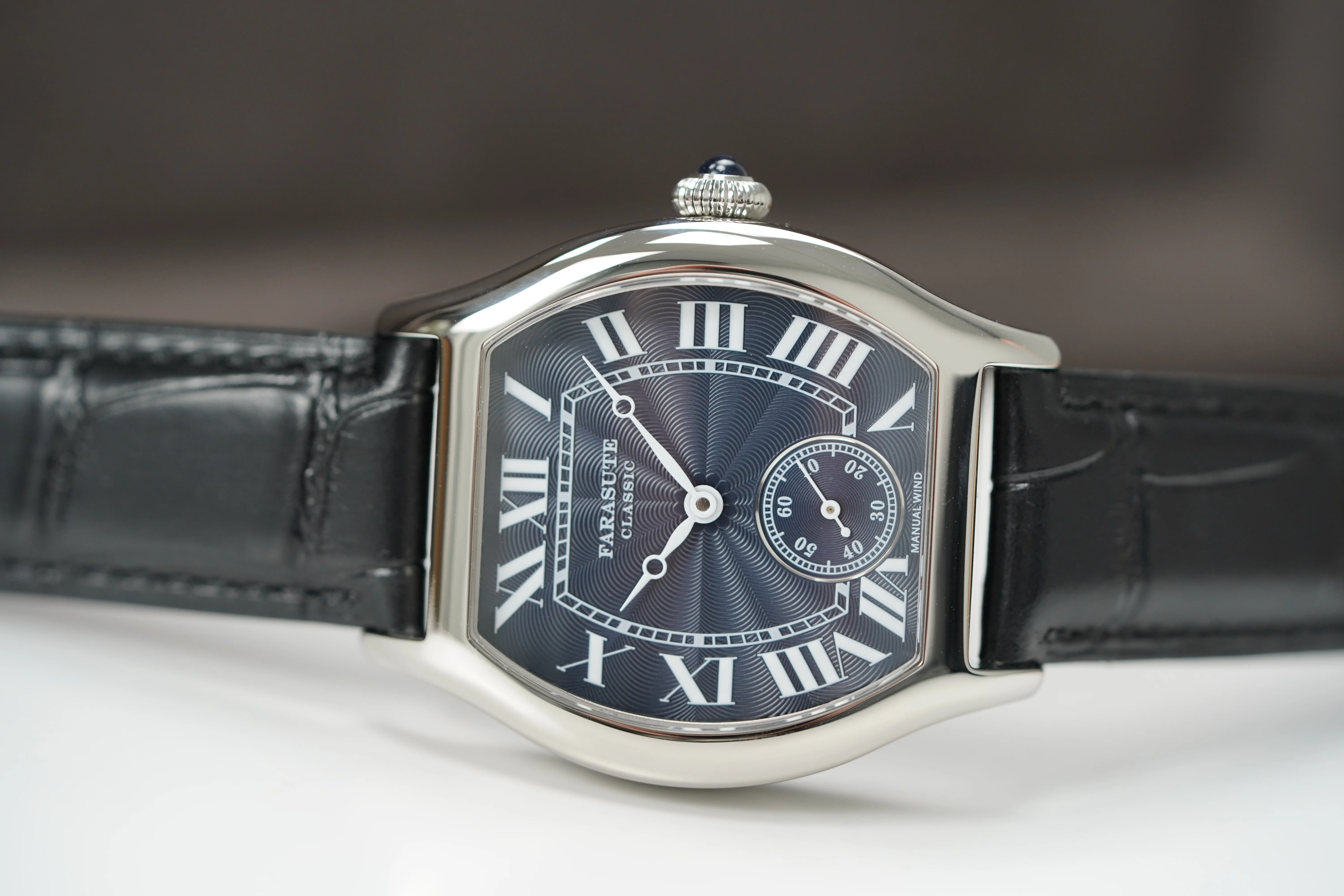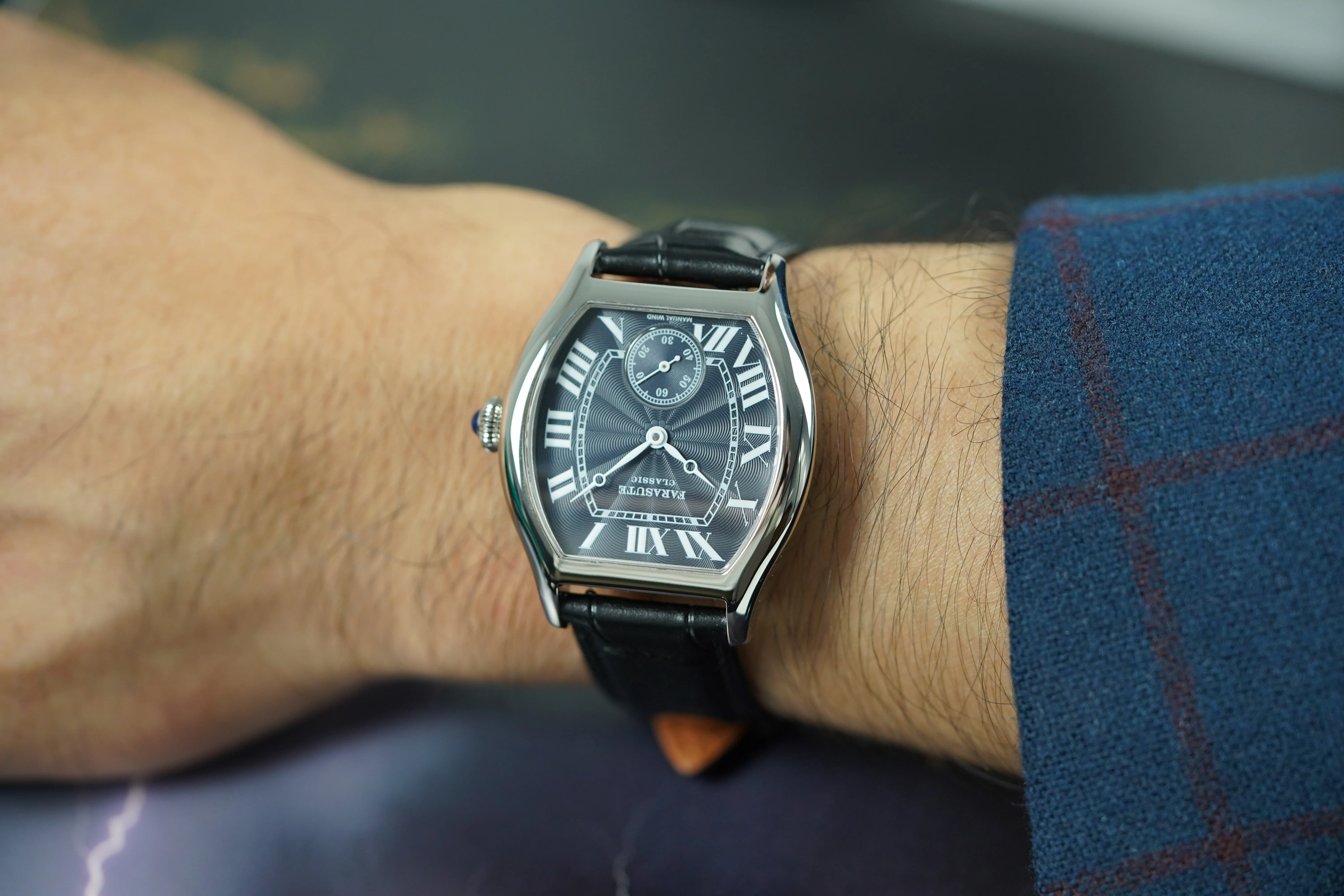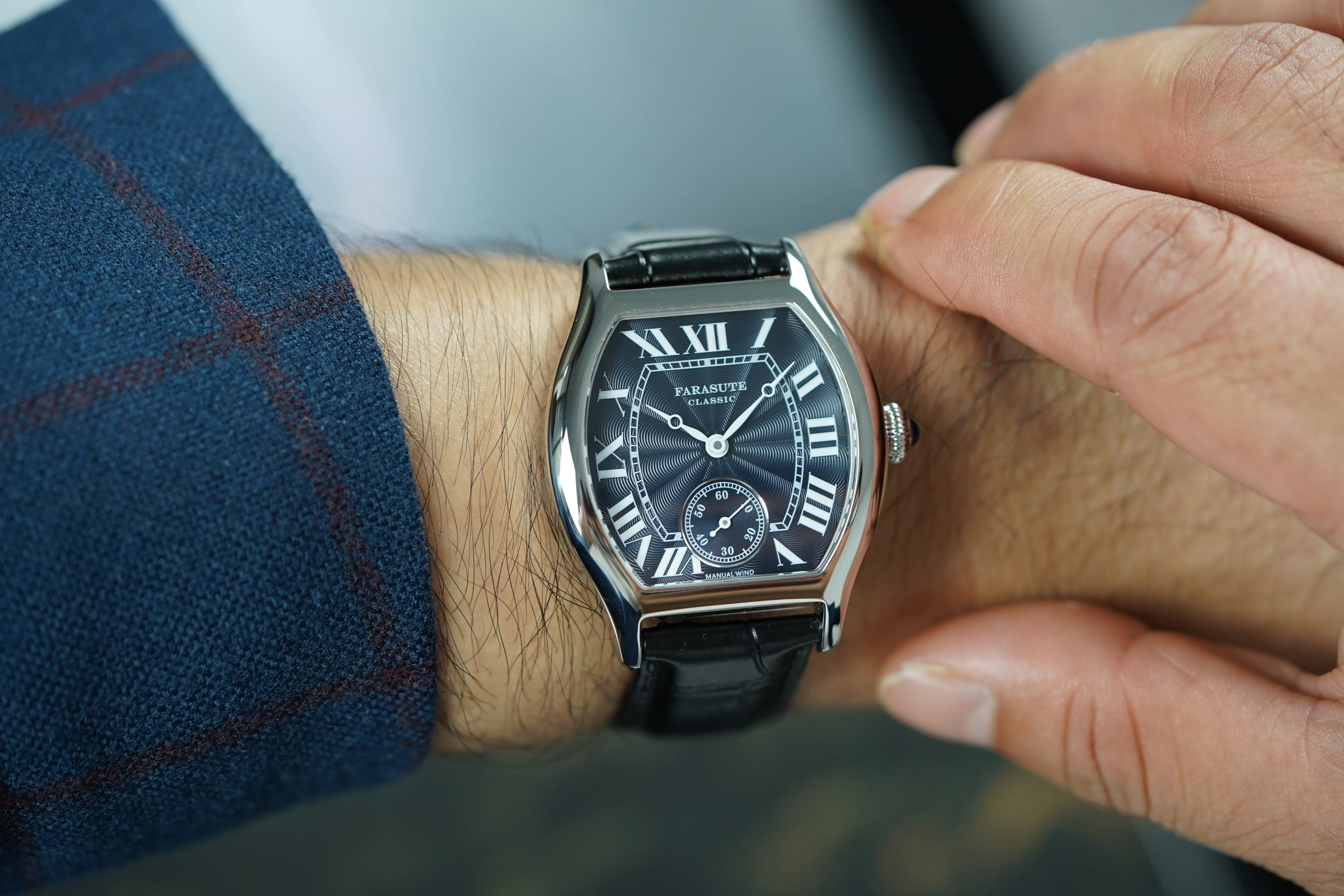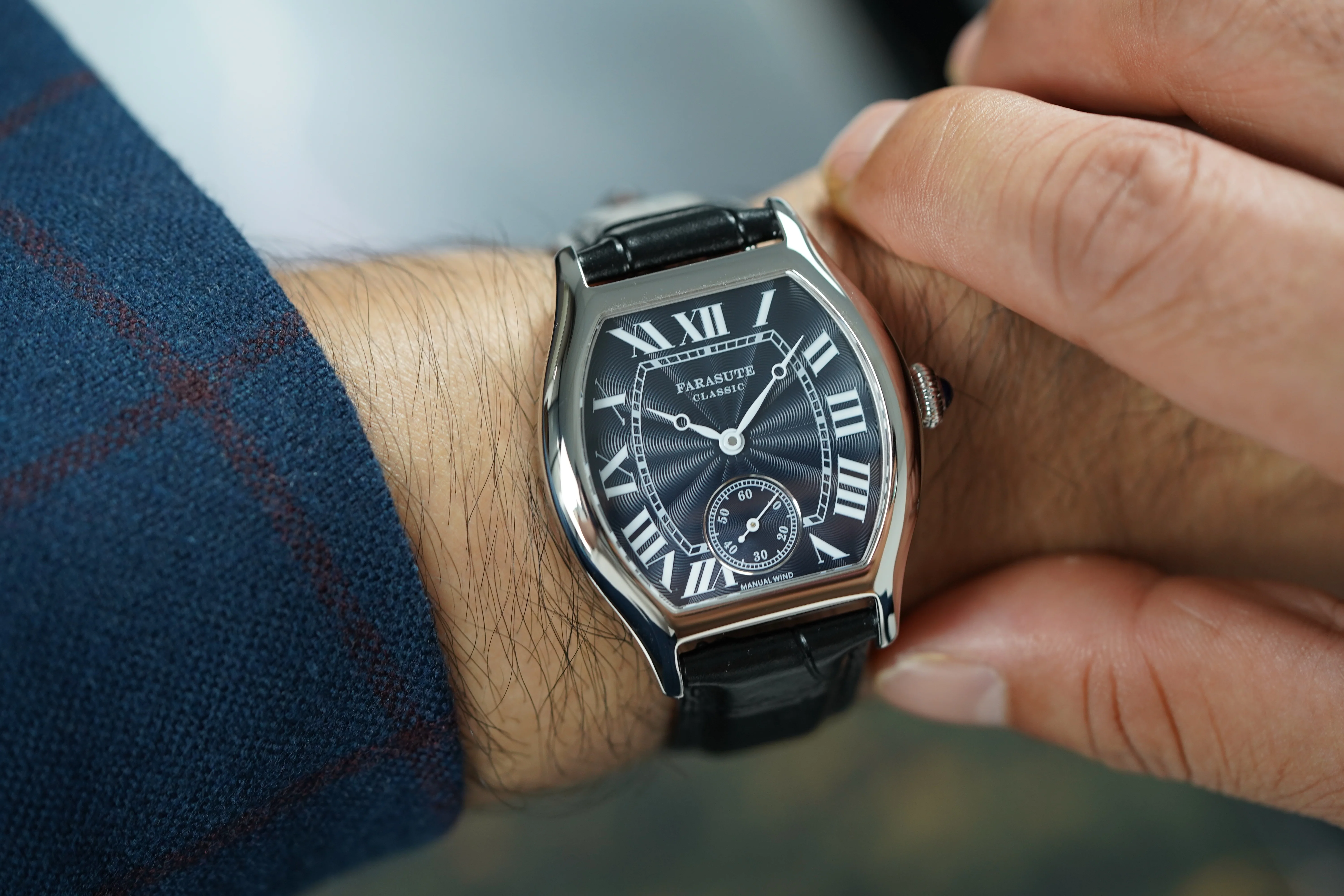 An elegant homage to cartier tortue platinum. the guilloche dial is stunning. the size is perfect for a dress watch. overall i am impressed by the quality of this watch. well done farasute!