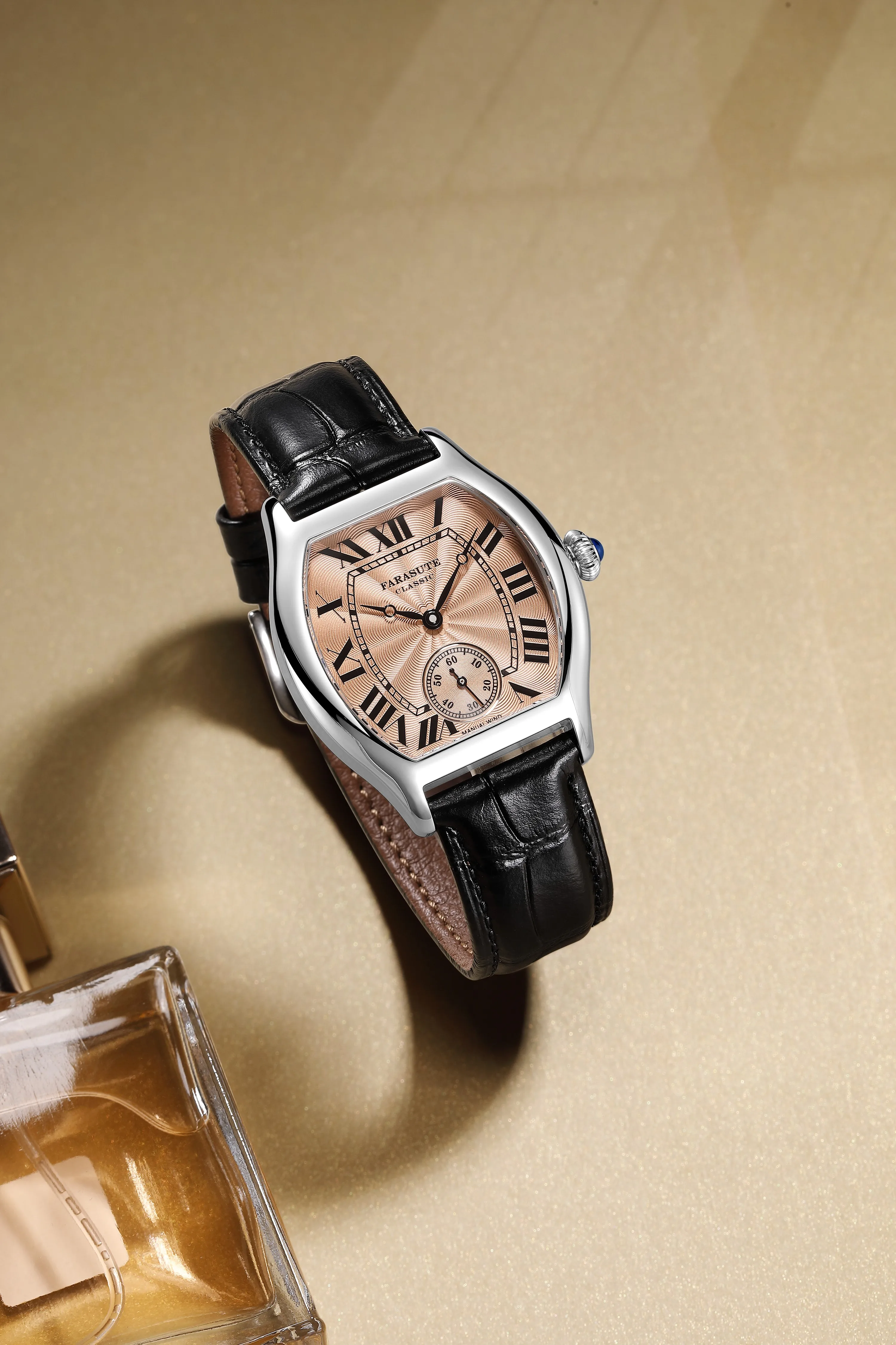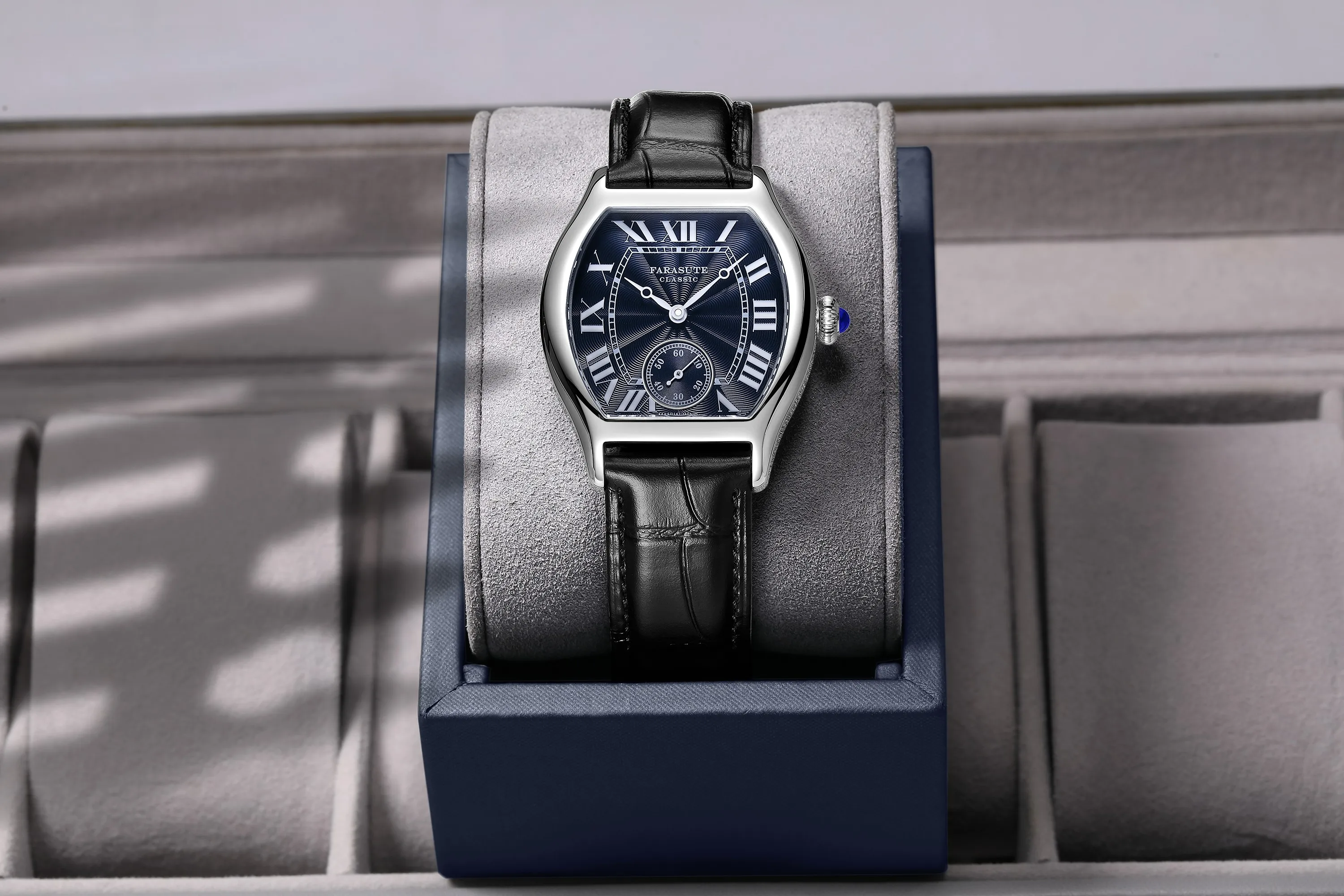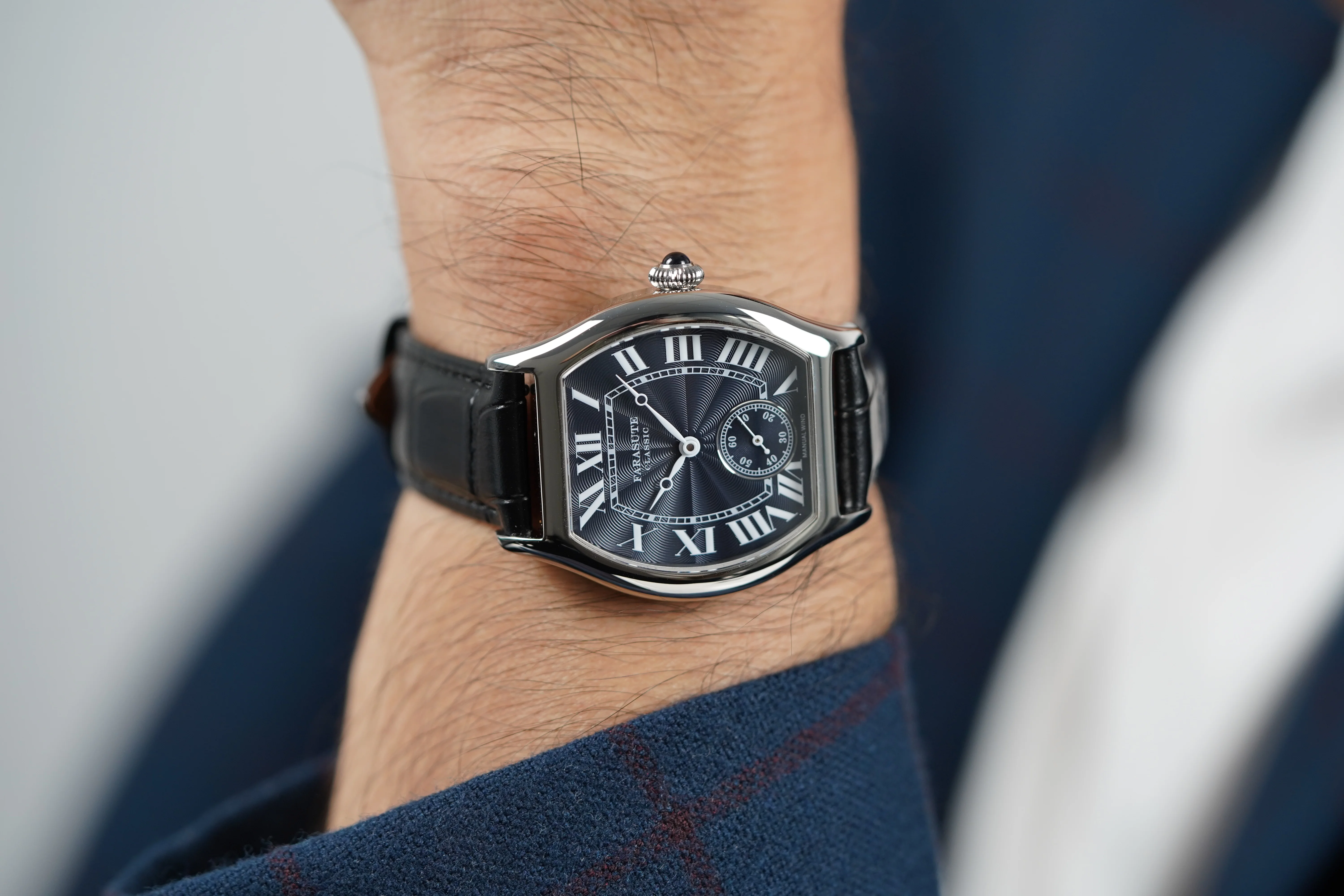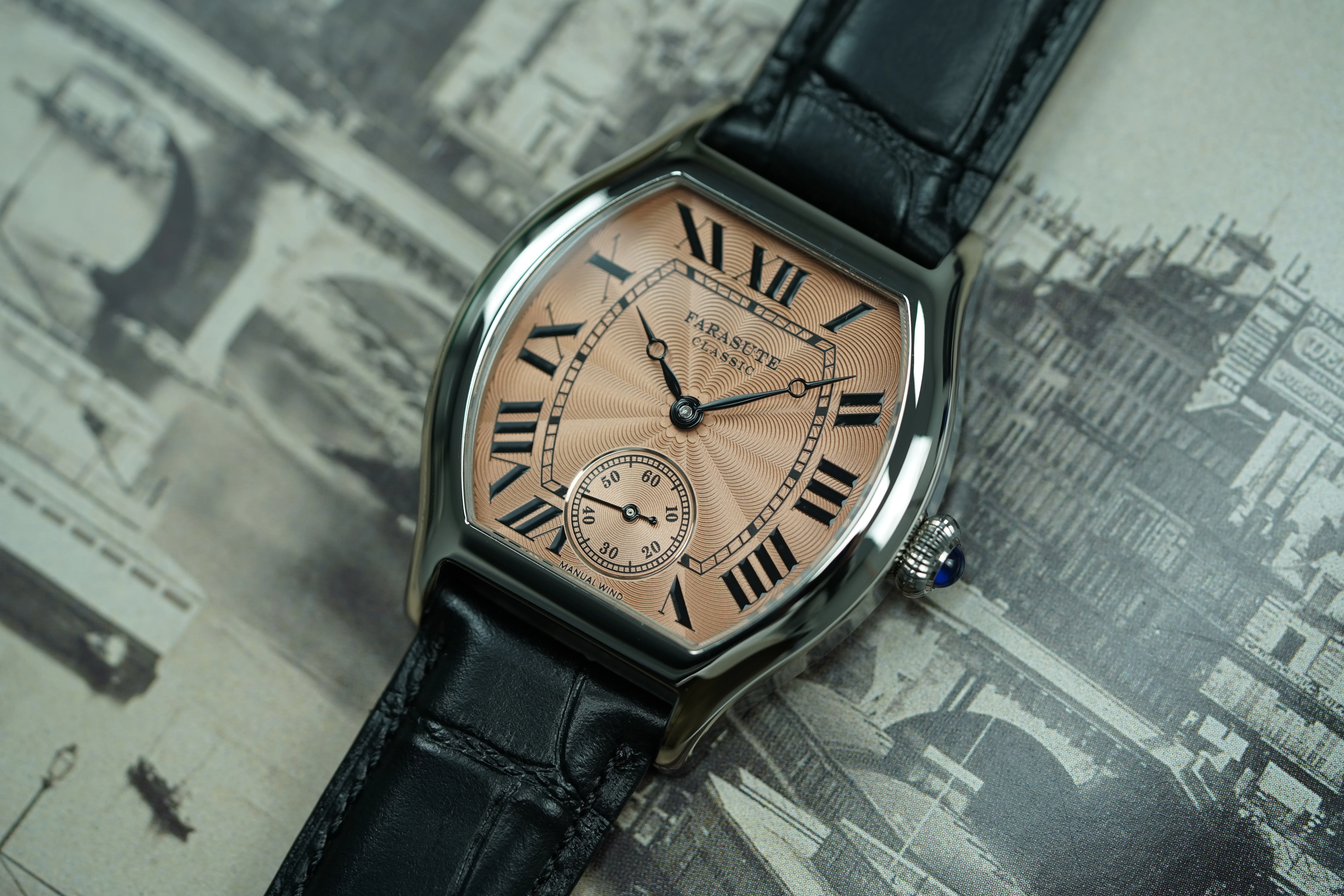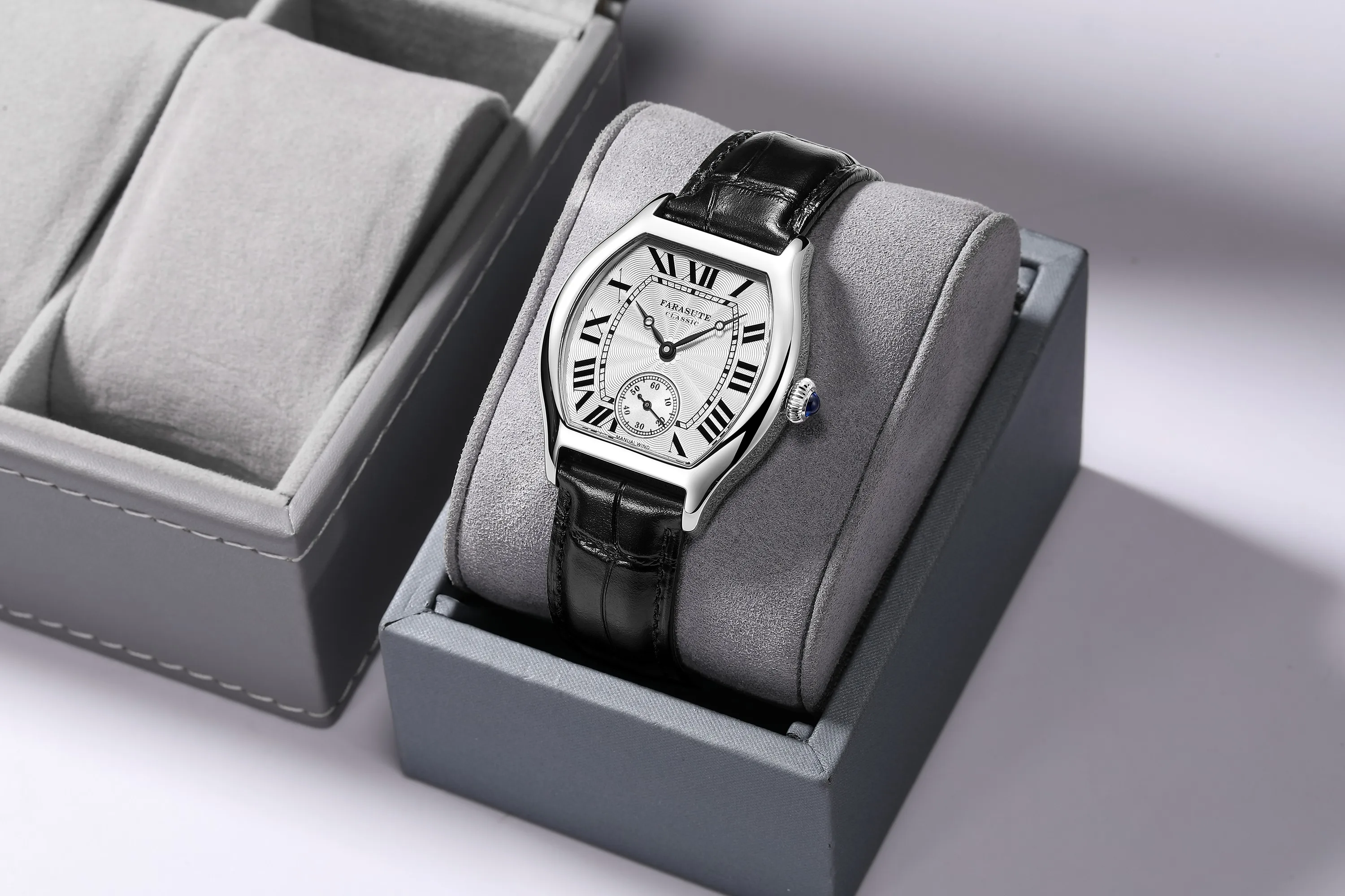 An elegant homage to cartier tortue platinum. the guilloche dial is stunning. the size is perfect for a dress watch. overall i am impressed by the quality of this watch. well done farasute!