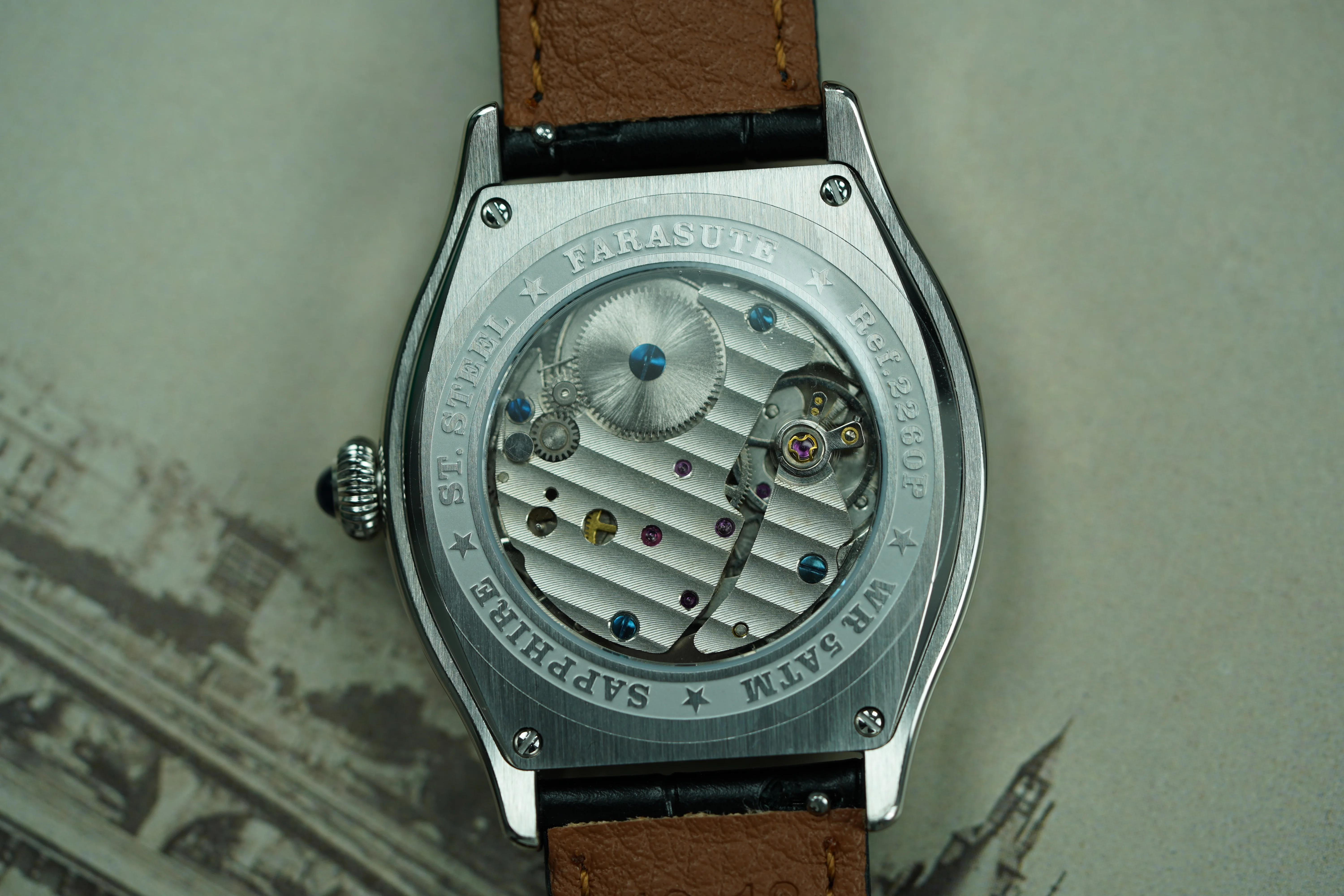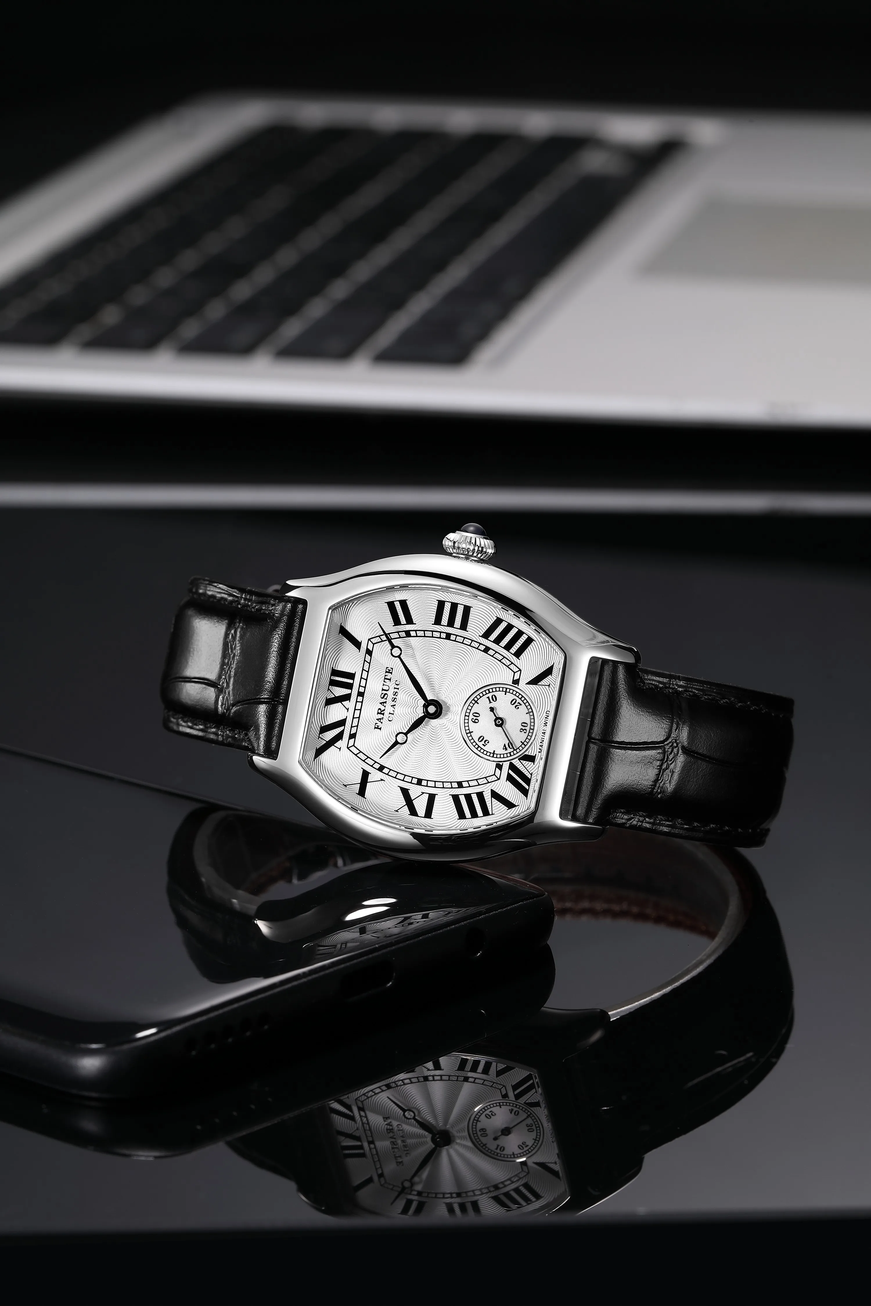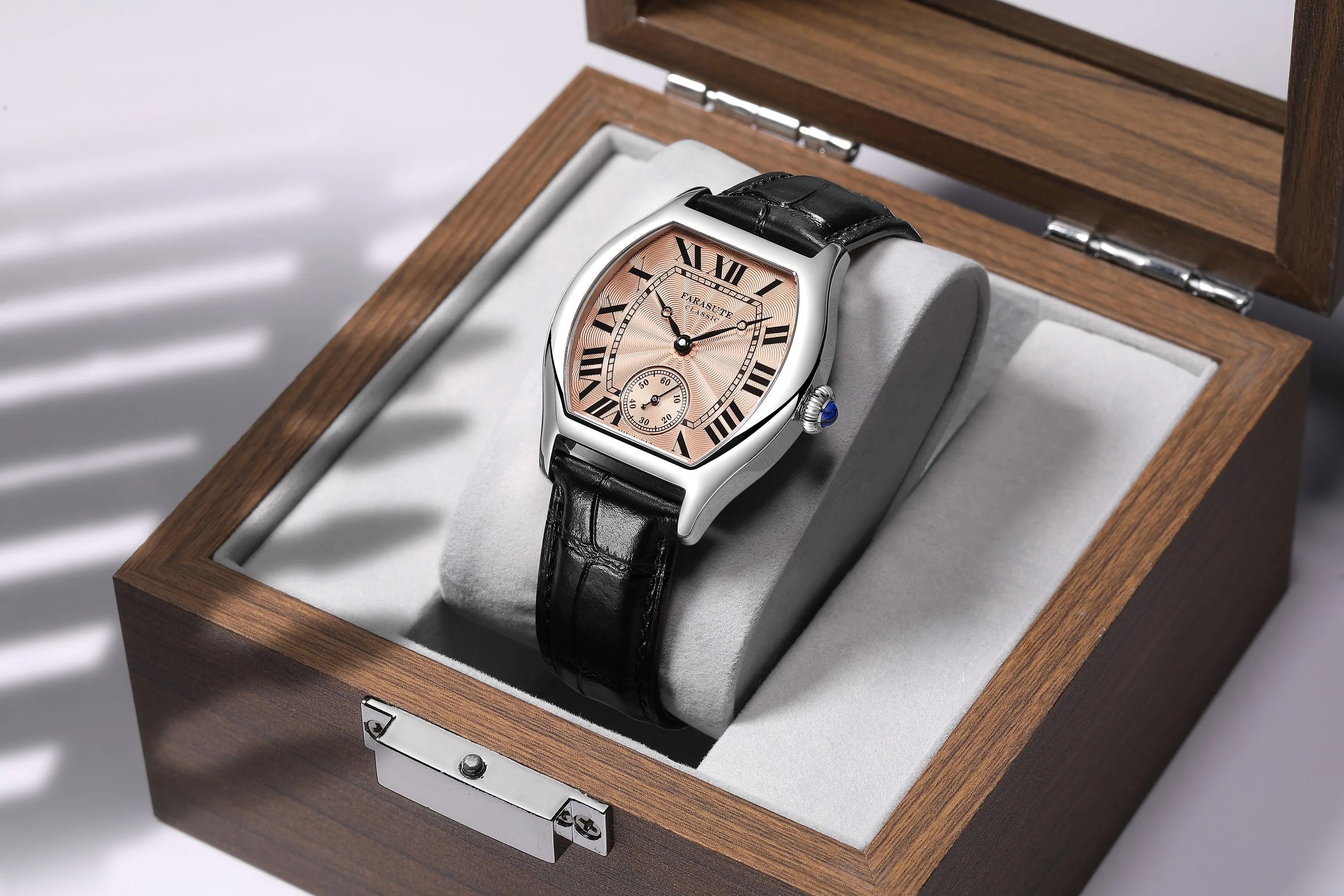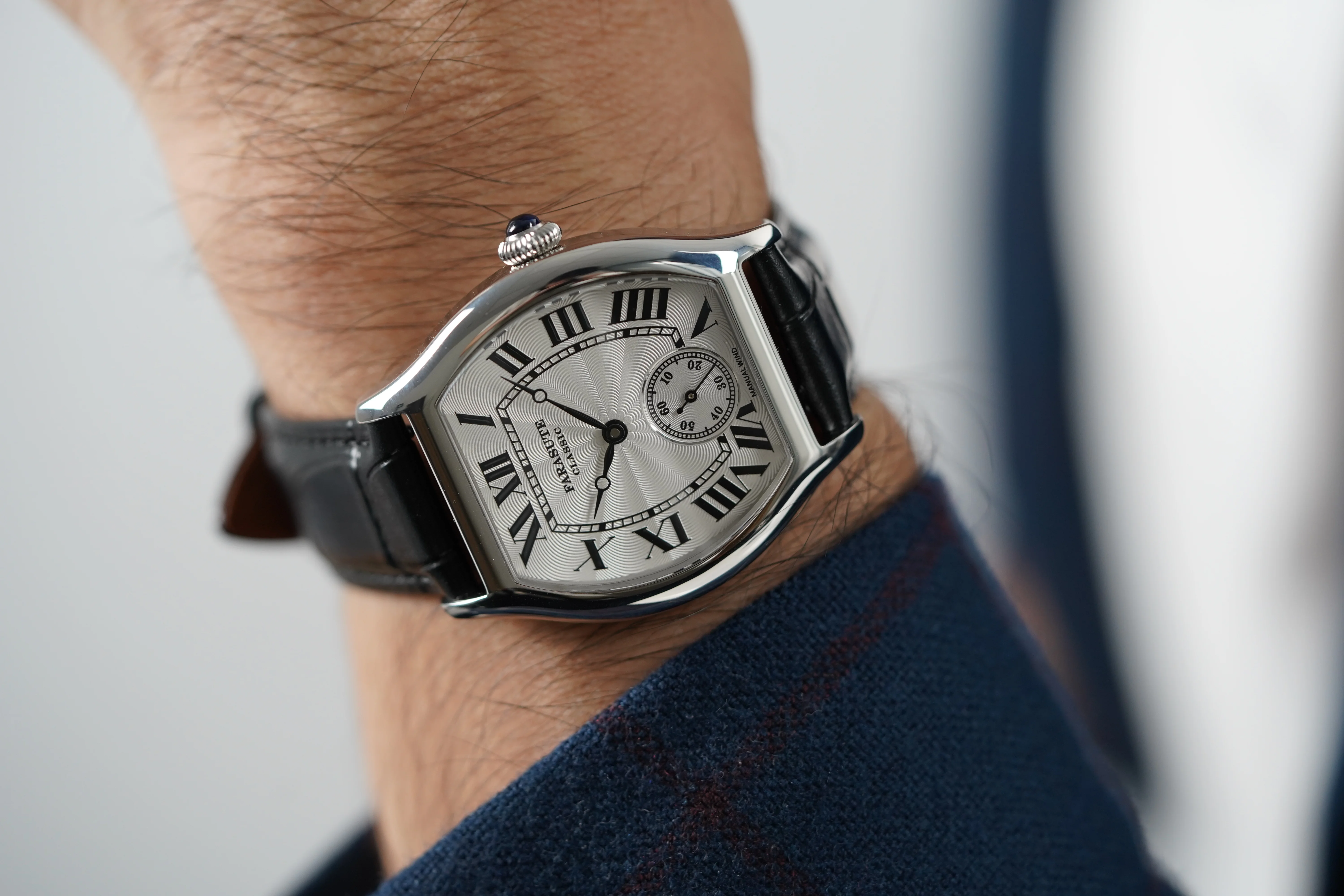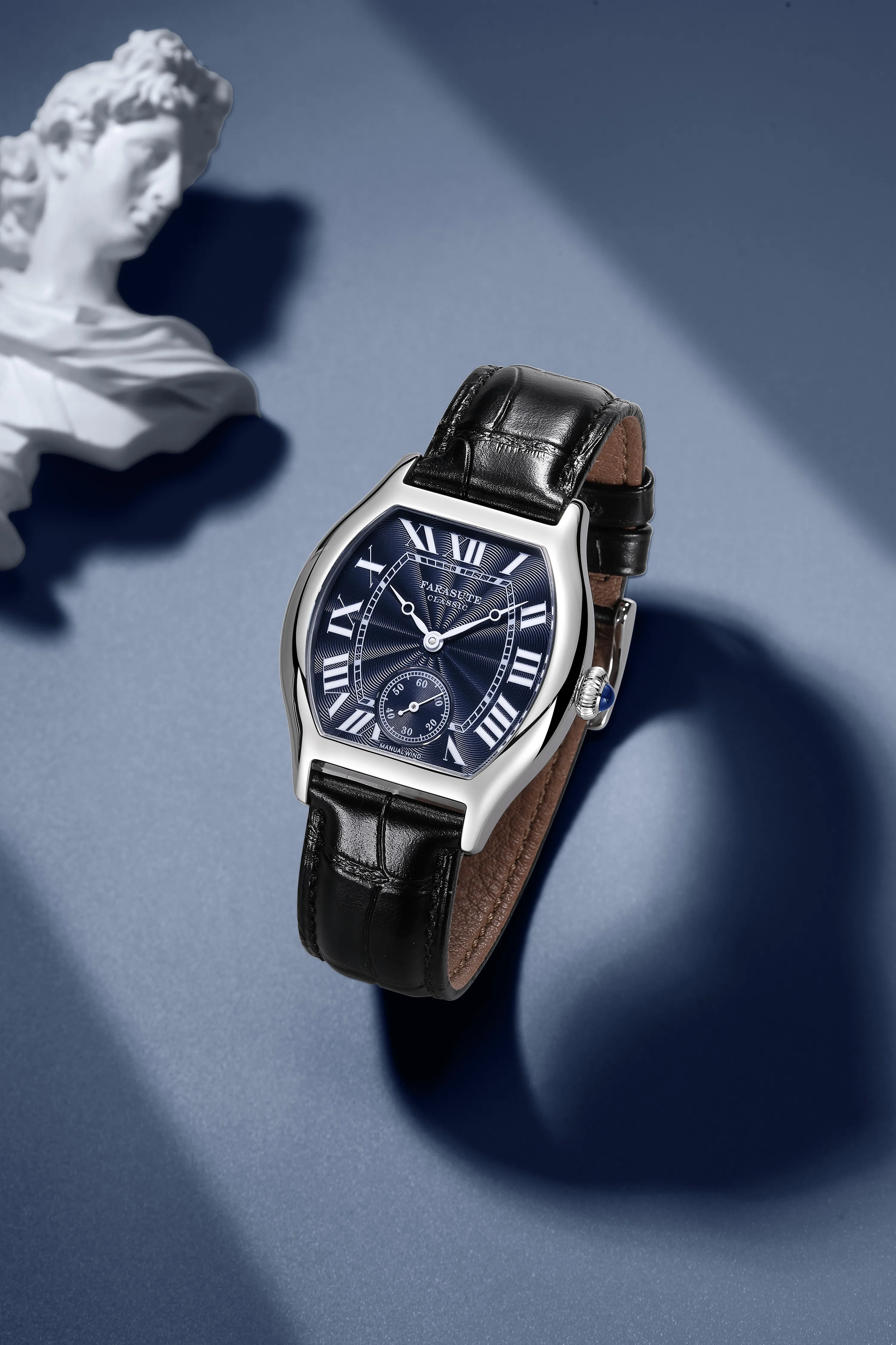 An elegant homage to cartier tortue platinum. the guilloche dial is stunning. the size is perfect for a dress watch. overall i am impressed by the quality of this watch. well done farasute!