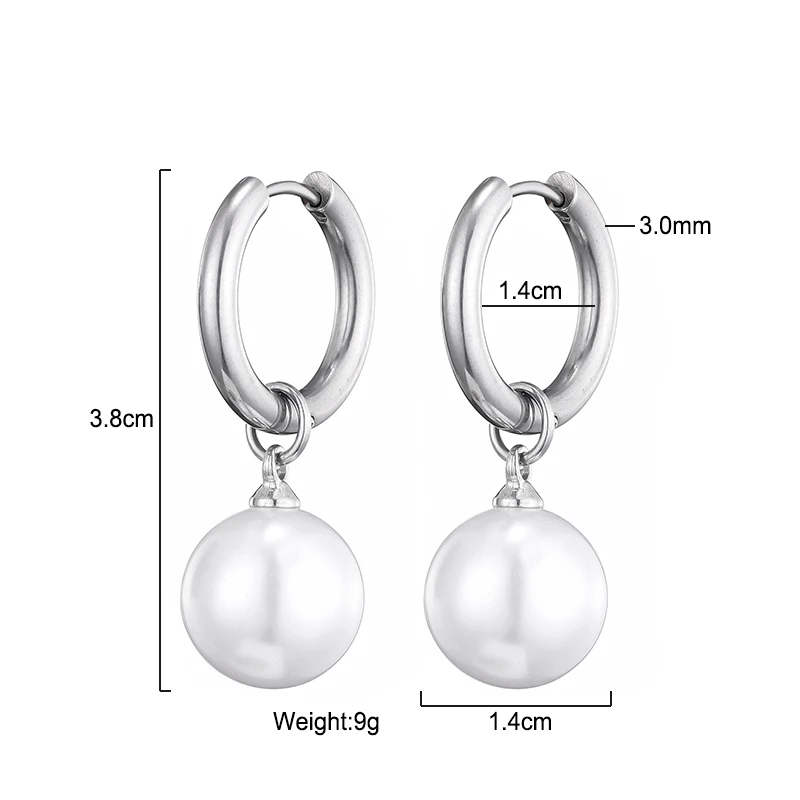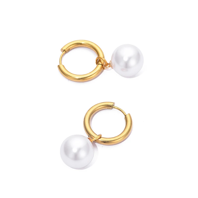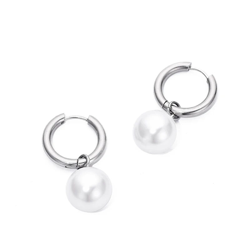 Fashion Imitation Pearl Pendant Stainless Steel Hoop Earrings Woman Round White Pearls Temperament Elegant Drop Dangle Jewelry