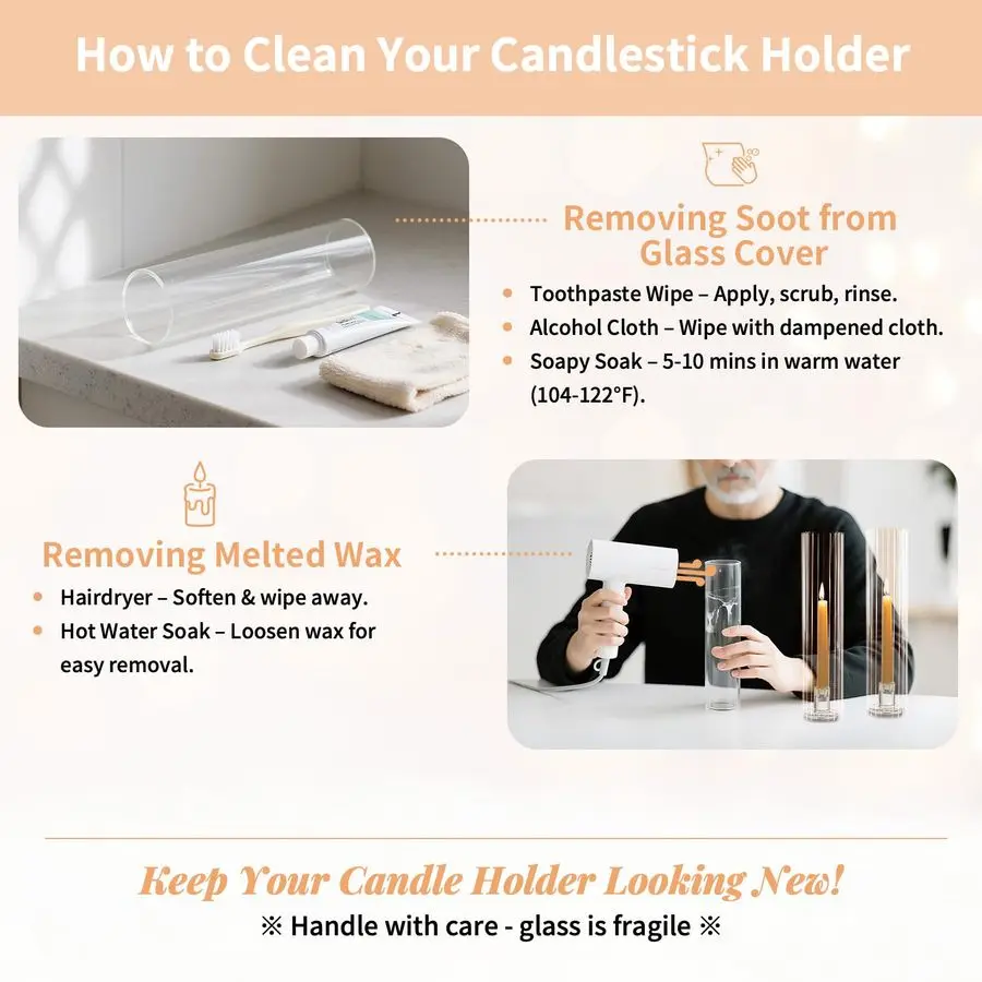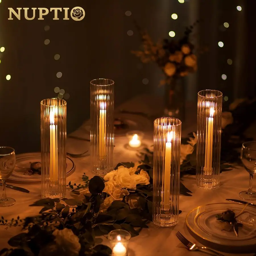 Windproof Ribbed Candle HolderMade of thick glass, sturdy, prevent it from easy cracking, falling and spilling, have a nice weight hold the candles securely. Each candlestick holders has a high quality thick glass base and a windproof ribbed hurricane glass. The ribbed glass shade causes a lovely soft lighting scene to the area, adding a warm atmosphere to your event.