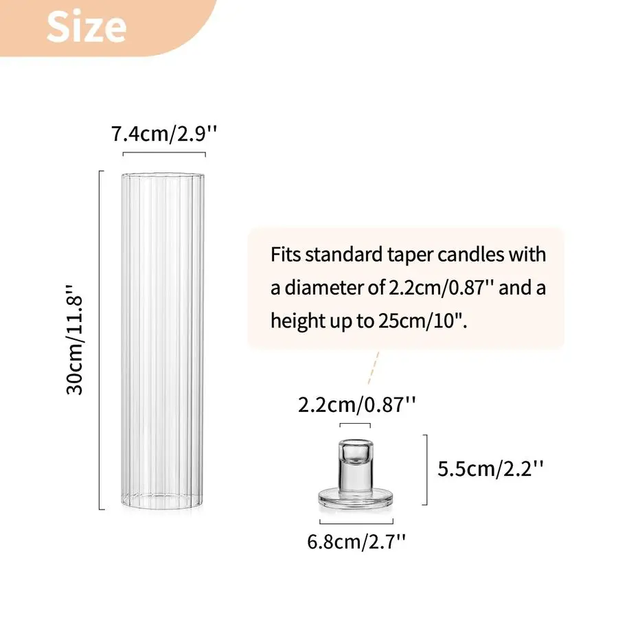 SizeRibbed hurricane glass height 11.83939 30cm, diameter 2.93939 7.4cm. Glass base height 2.173939 5.5cm, width 2.683939 6.8cm. candle hole diameter 0.873939 2.2cm, fits for 0.873939 2.2cm taper candles. You will get 10 pieces ribbed hurricane taper candle holderscandles are not included.