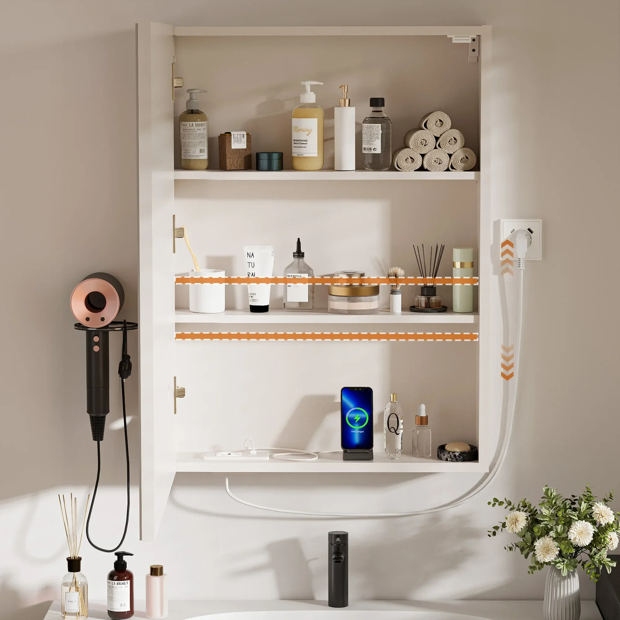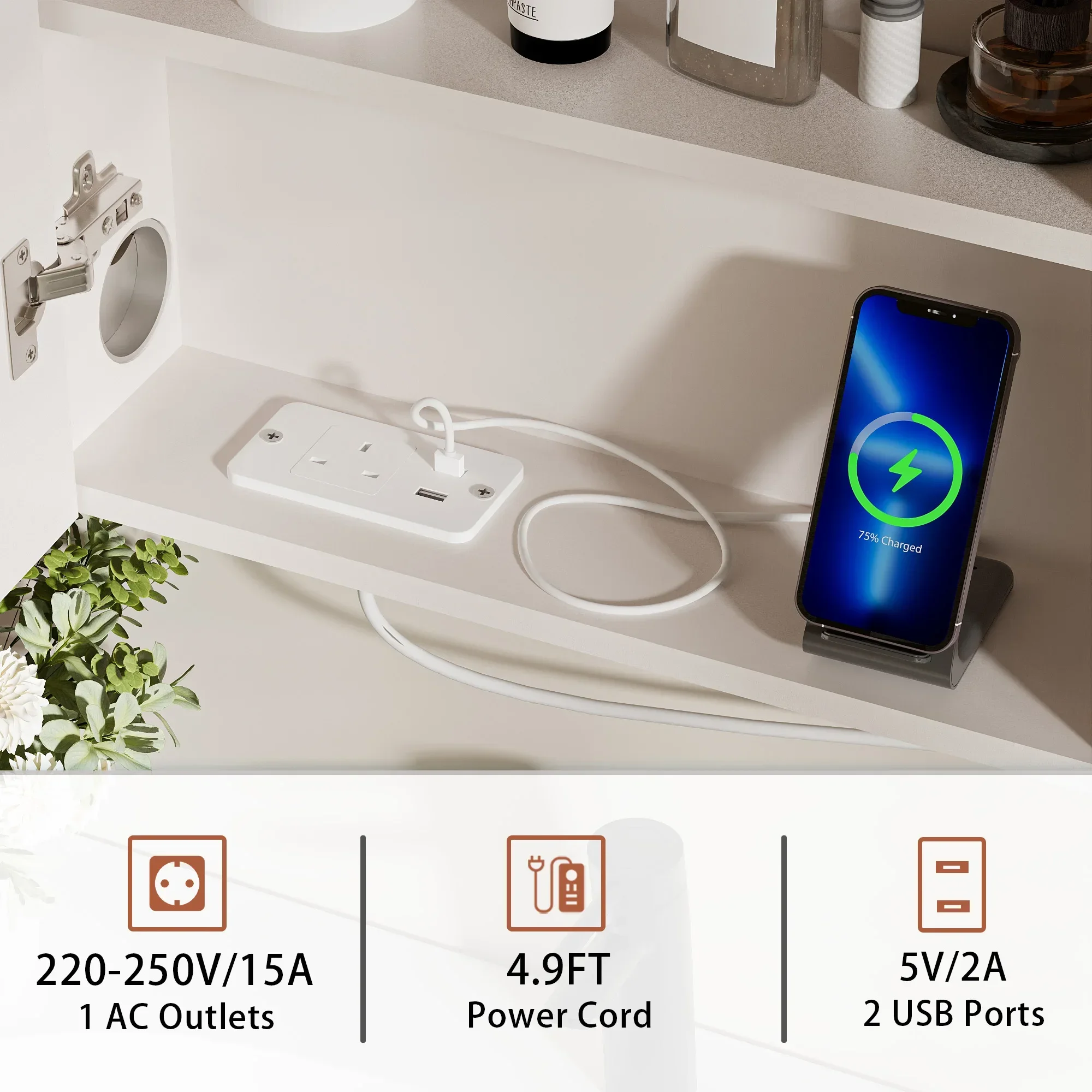 Power Outlets: Stay connected in your bathroom with our innovative mirror cabinet, equipped with 1 AC outlet and 2 USB ports. Charge your devices, power a hair dryer, or plug in an electric razor without needing extra adapters. With adjustable shelves, this cabinet maximizes storage and convenience, making your morning routine effortless.