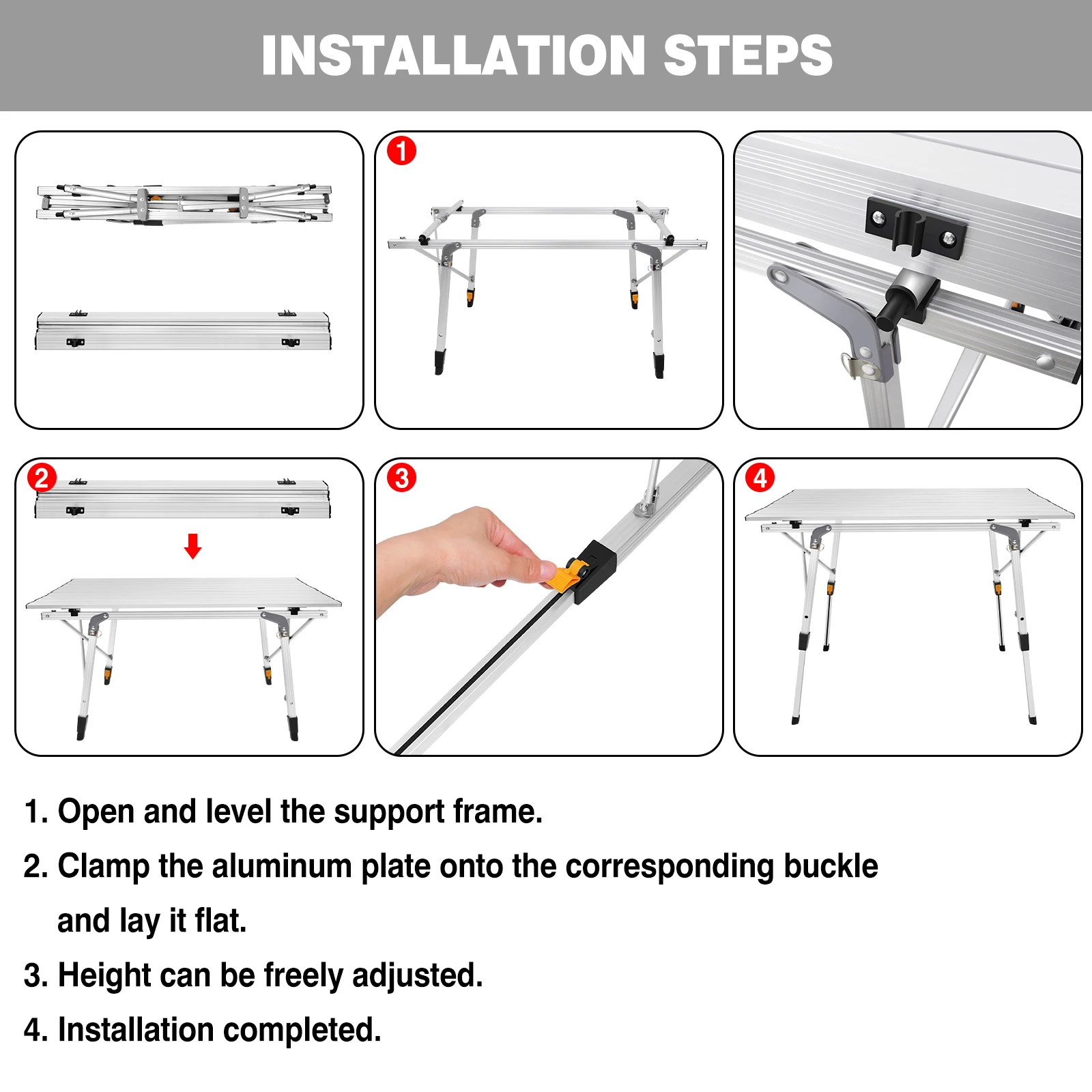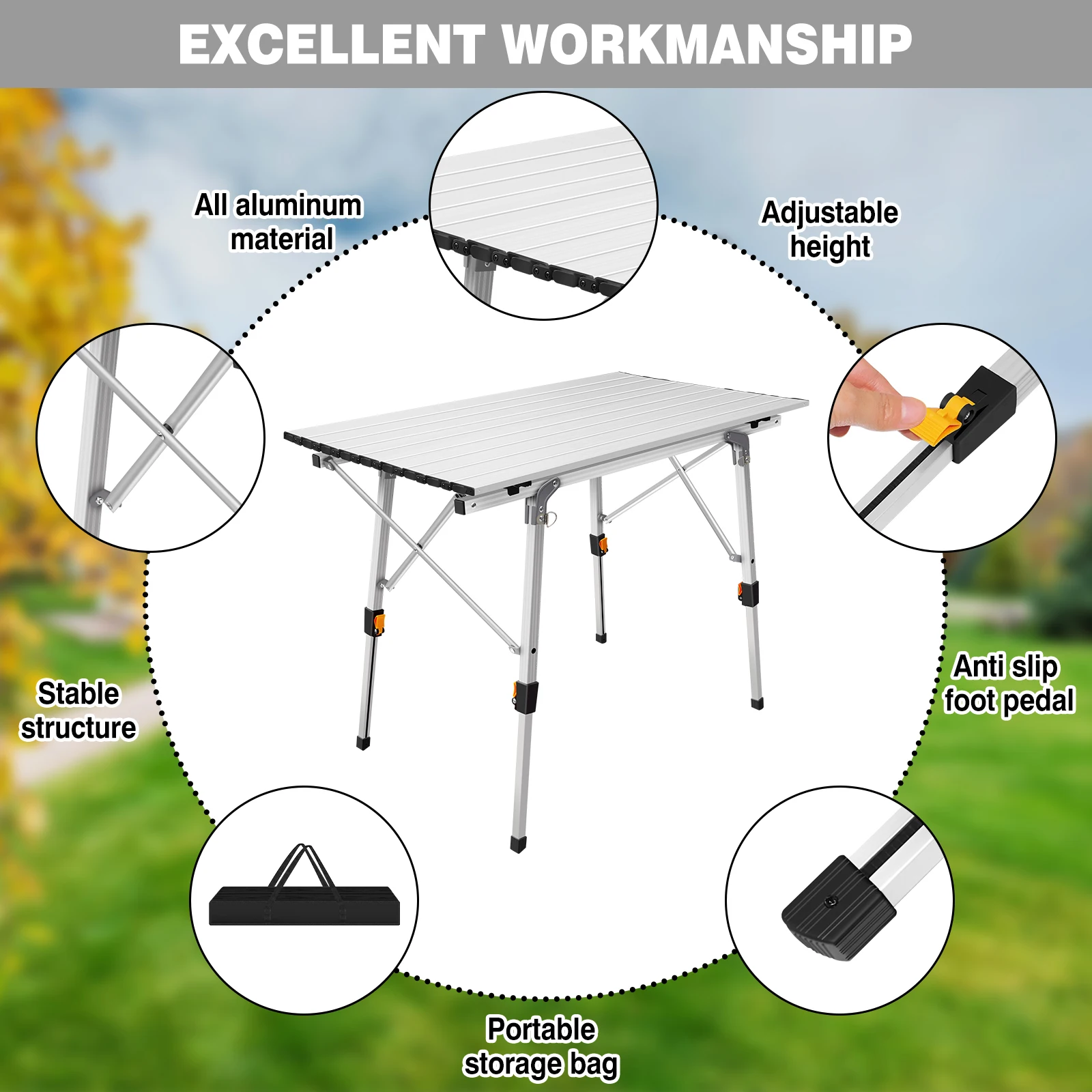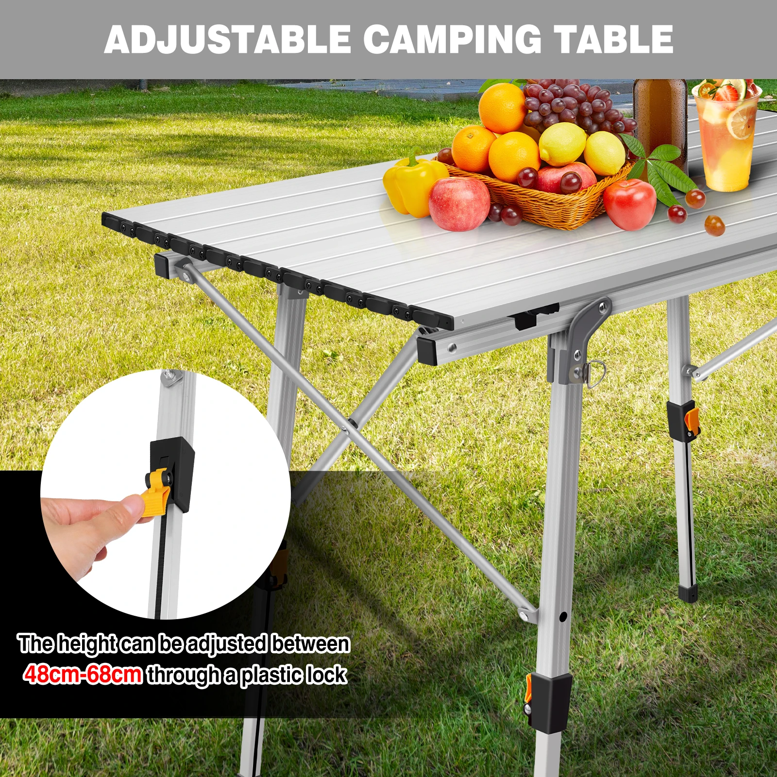 【4 ADJUSTABLE LEGS】 Our folding camping table features 4 adjustable telescoping legs. Each leg can be adjusted separately at any height between 45cm & 68cm to fit uneven surface and meet all demands for camping adventure.
