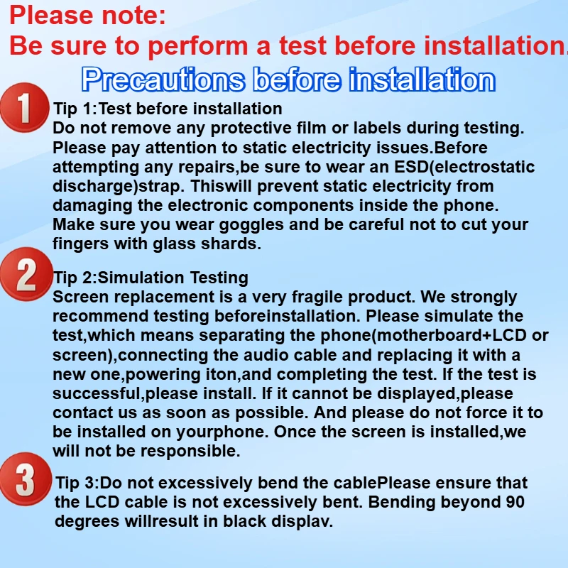 Screen replacement is a very fragile product. We strongly recommend testing before installation. Please simulate the test, which means separating the phone (motherboard+LCD or screen), connecting the audio cable and replacing it with a new one, powering it on, and completing the test. If the test is successful, please install. If it cannot be displayed, please contact us as soon as possible. And please do not force it to be installed on your phone. Once the screen is installed, we will not be responsible.