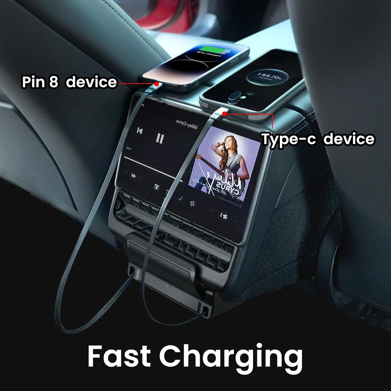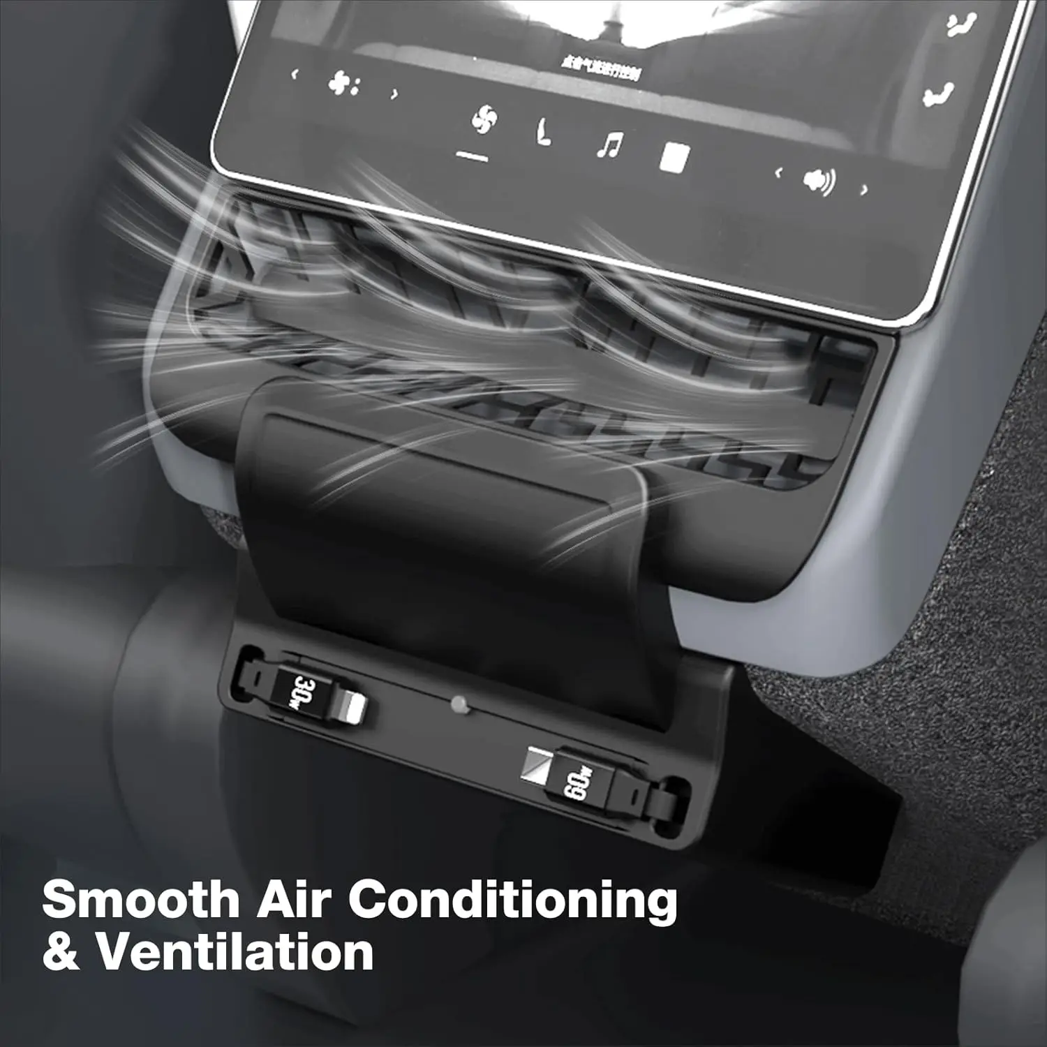 - Fast charging dock: The car fast charger comes with 30W and 60W charging cables. Featuring heavy-duty wide-gauge wiring for enhanced durability and power delivery, it allows rear-seat passengers to charge their phones and other devices quickly and safely.