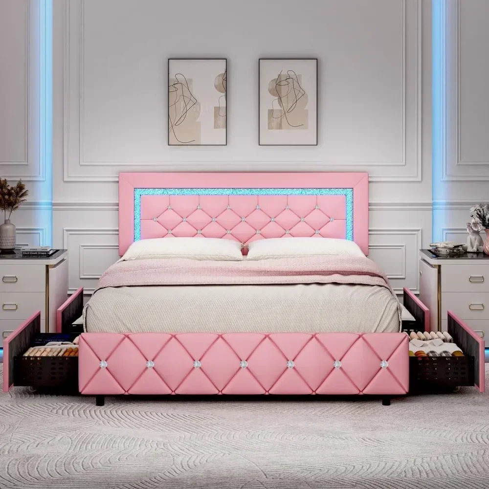 - Smart LED Bed Frame: The headboard is embedded with LED light strips, and the diamonds reflect different brilliance under the light. You can adjust the color and brightness through the remote control, which not only creates a charming atmosphere for your bedroom, but also can be used as a night light