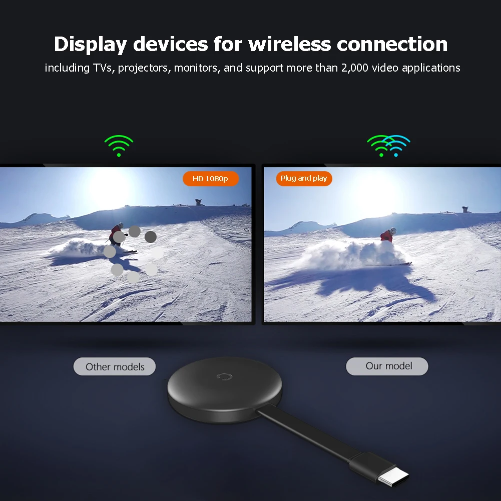 Feature: Display devices for wireless connection, including TVs, projectors, monitors, support for more than 2000 video Apps. Multiple modes: for AirPlay, for DLNA, for Miracast, for AirMirror, cross-system, cross-terminal screen mirroring. Full support for Netflix, for YouTube, for Google Chrome, video game apps and movie sites. Support H.265 decoding, HD 1080p playback. High resolution, full HD HDMI-compatible output, 50% faster processing speed. Wide range of applications for home theater, games, presentations, conferences. Plug and play, no application or driver required. 3 steps to enjoy the big screen experience: plugging, connecting, mirroring. Specification: Note: