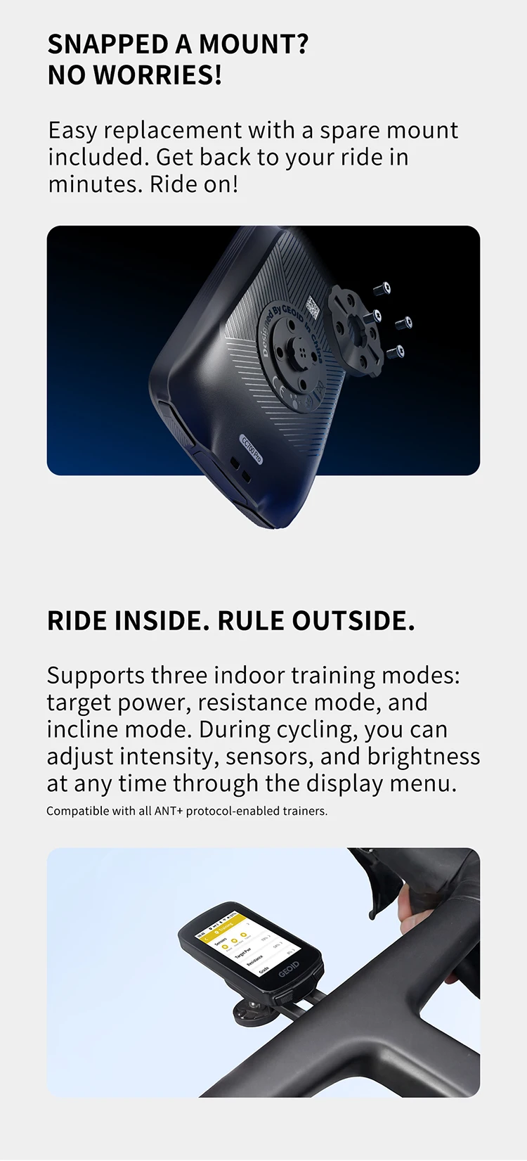 Supports three indoor training modes: target power, resistance mode, and incline mode. During cycling, you can adjust intensity, sensors, and brightness at any time through the display menu.