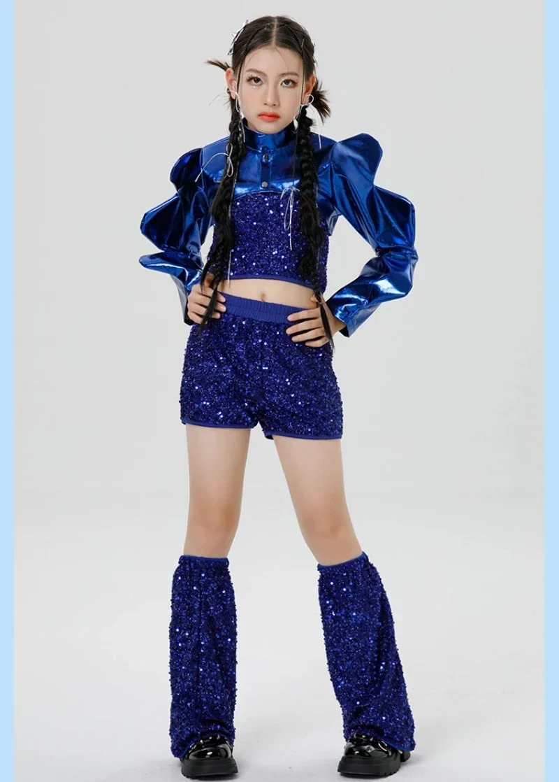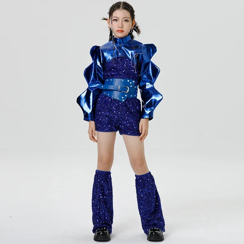 Girl Blue Jazz Dance Costume Performance Costume Technology Model T Stage Performance Street Dance Fashion Costume Set