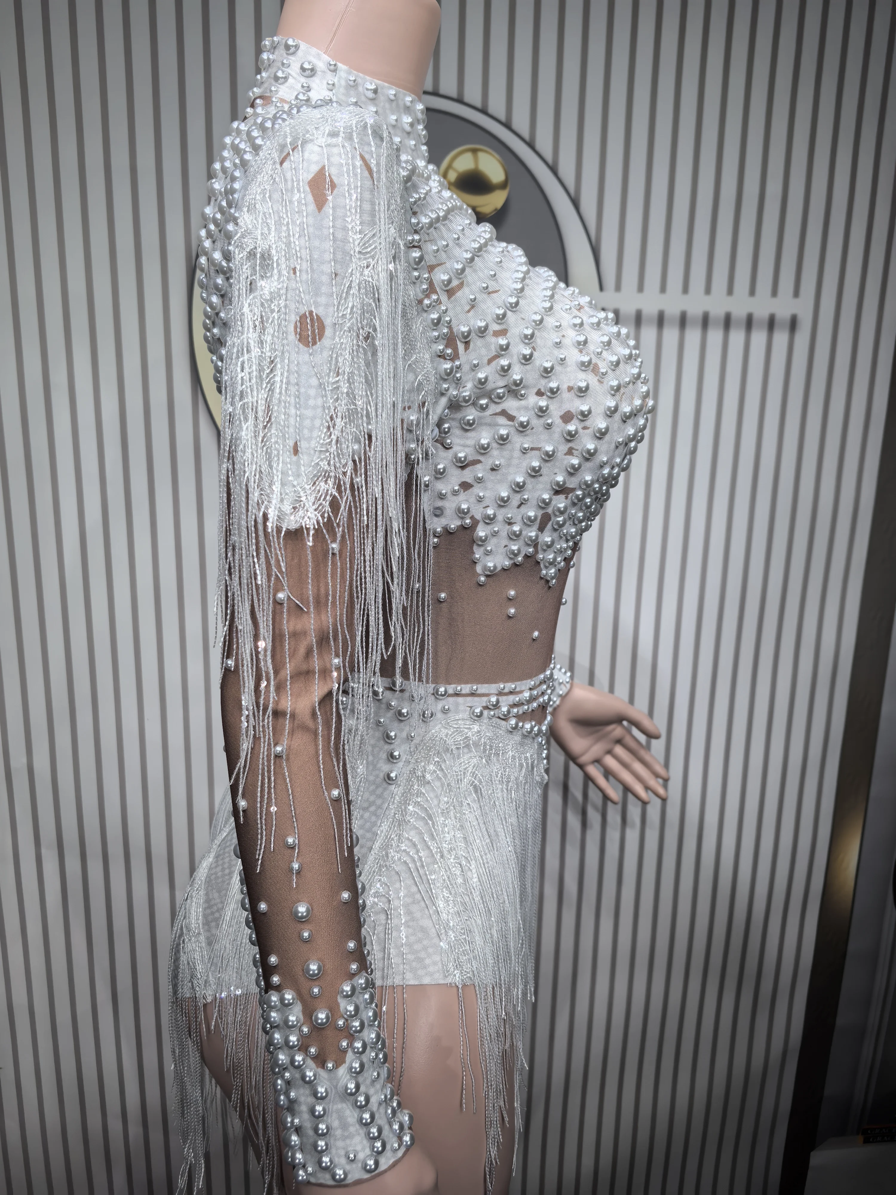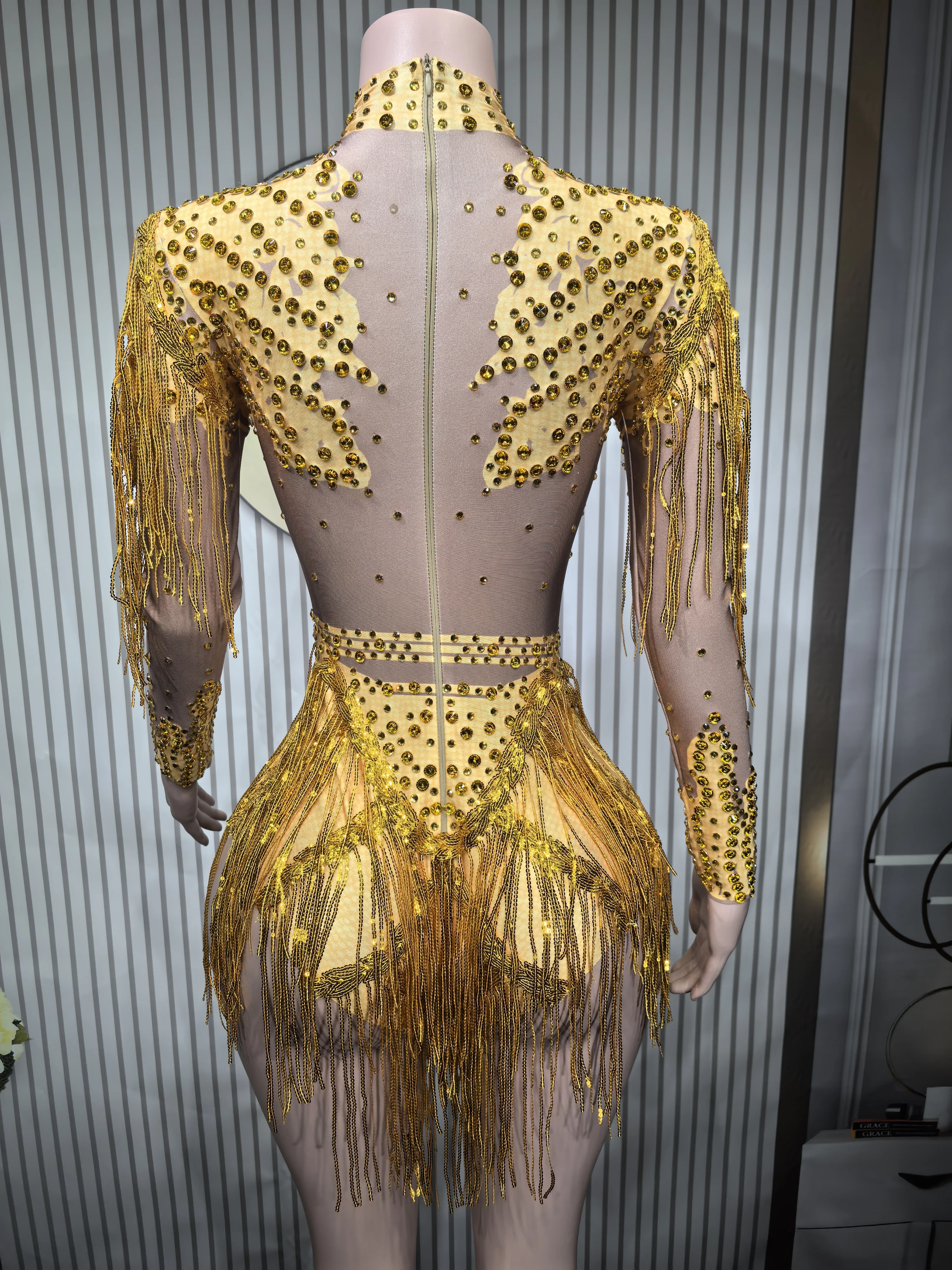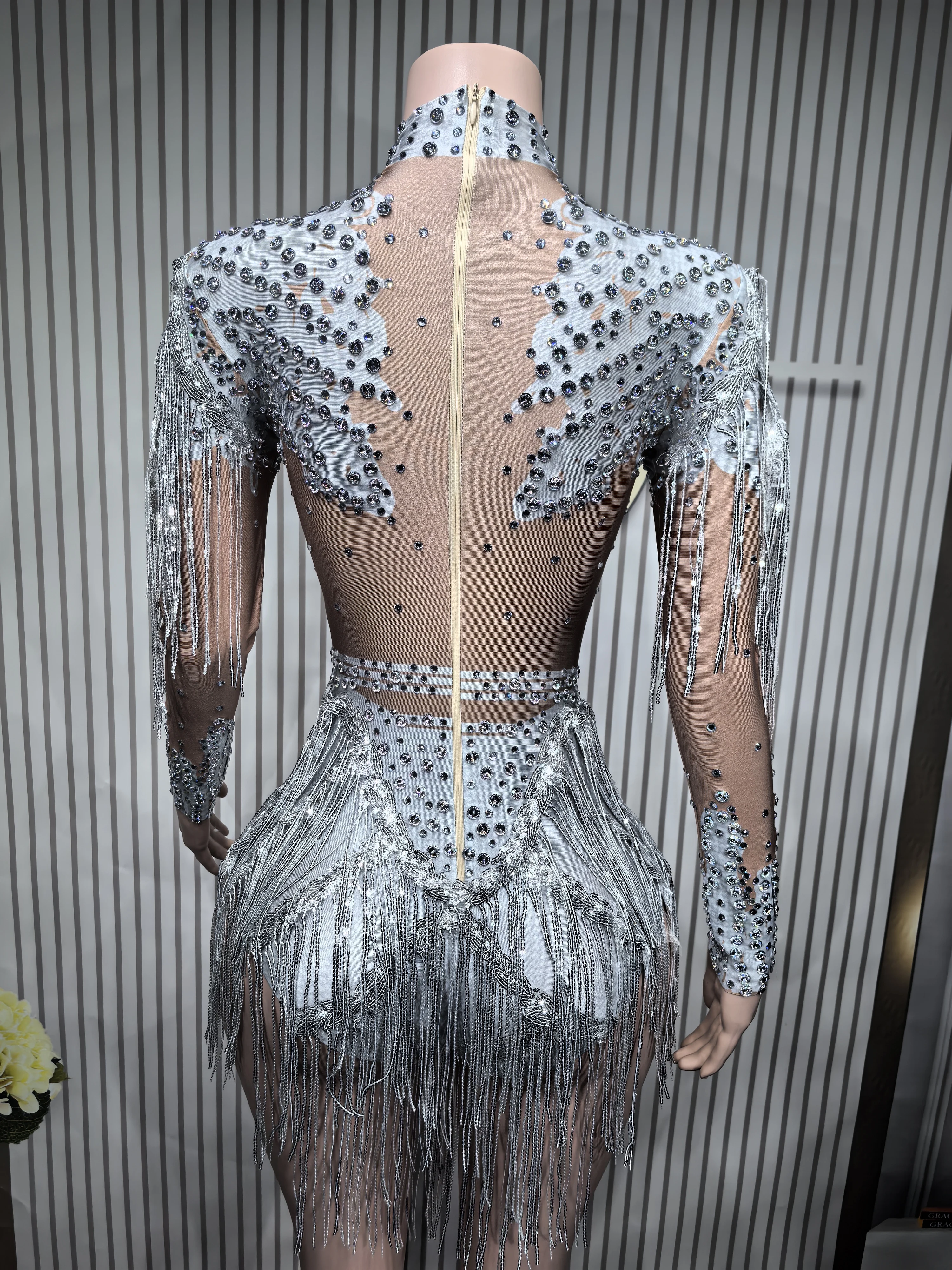 It’s beautiful, I wore it in a competition and everyone loved it. The skin-colored part is fabric, it’s not transparent, it’s full of pearls and looks super pretty, just like the image. I will buy in other colors. It arrived in a week to Mexico.
