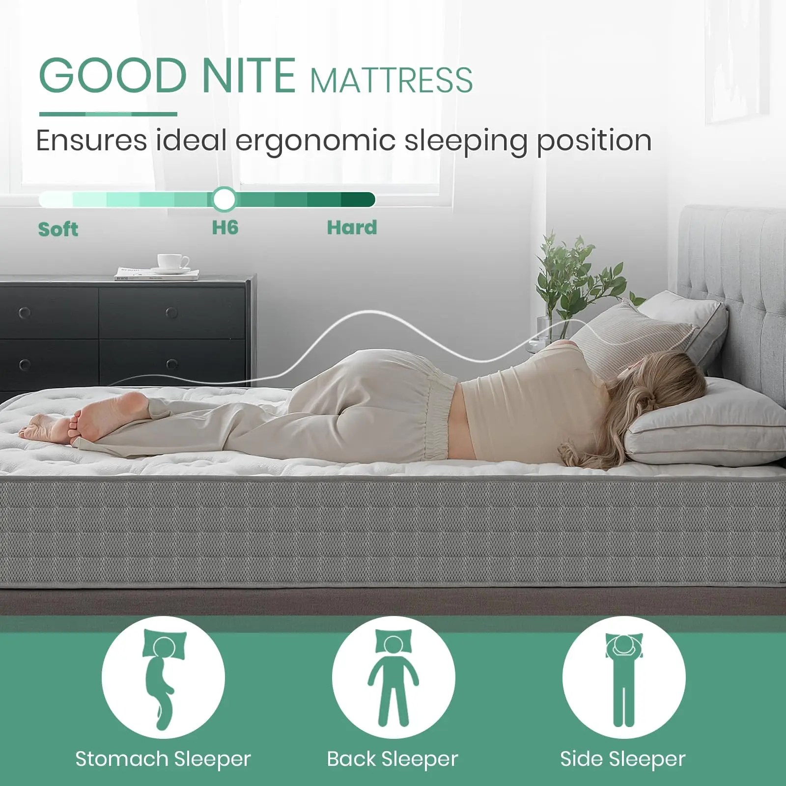 The Good Nite Hybrid Mattress is designed to provide optimal spinal alignment, combining orthopedic support with plush comfort. It targets pressure points like shoulders and hips, effectively relieving muscle tension, reducing back fatigue, and ensuring a restful, pain-free sleep.