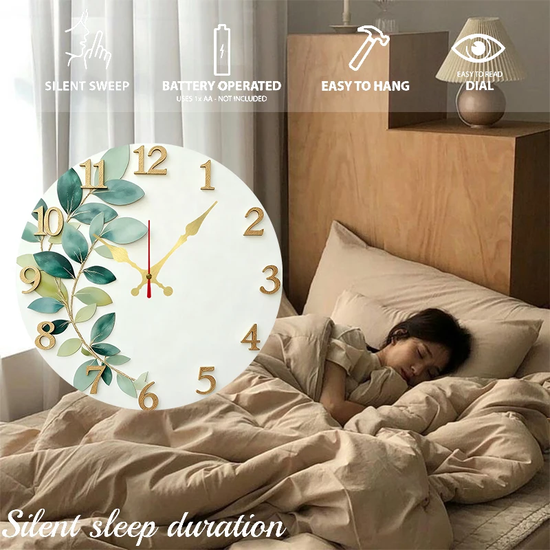 Green Leaf Theme Wooden Round Silent Hanging Wall Clock, Suitable For Living Room, Office, Study Room, Bedroom, Home Decoration