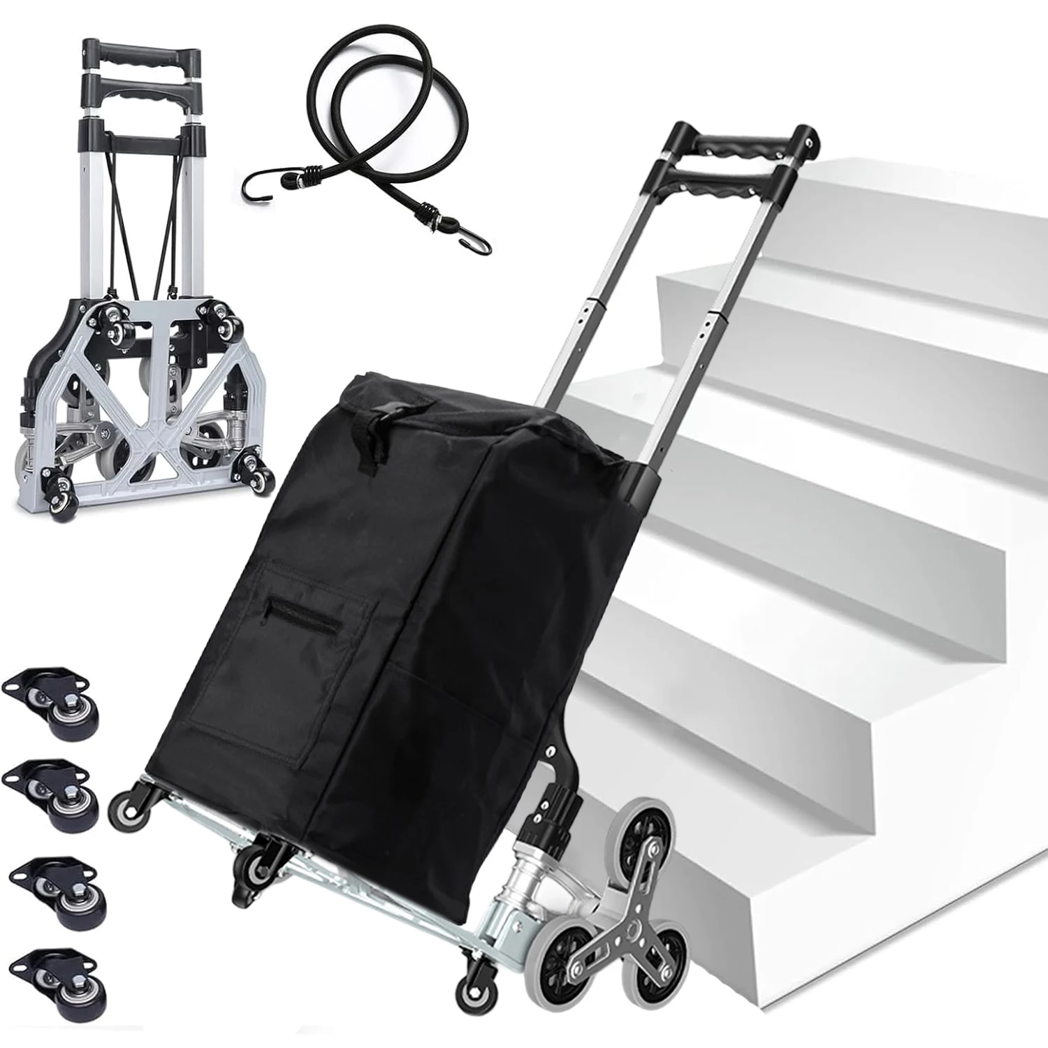 【package content】1 x stair climbing cart with 6 climbing wheels, 4 x universal 360° Rolling swivel wheels, 1 x elastic rope, 1x black waterproof canvas bag, 2 x tools.