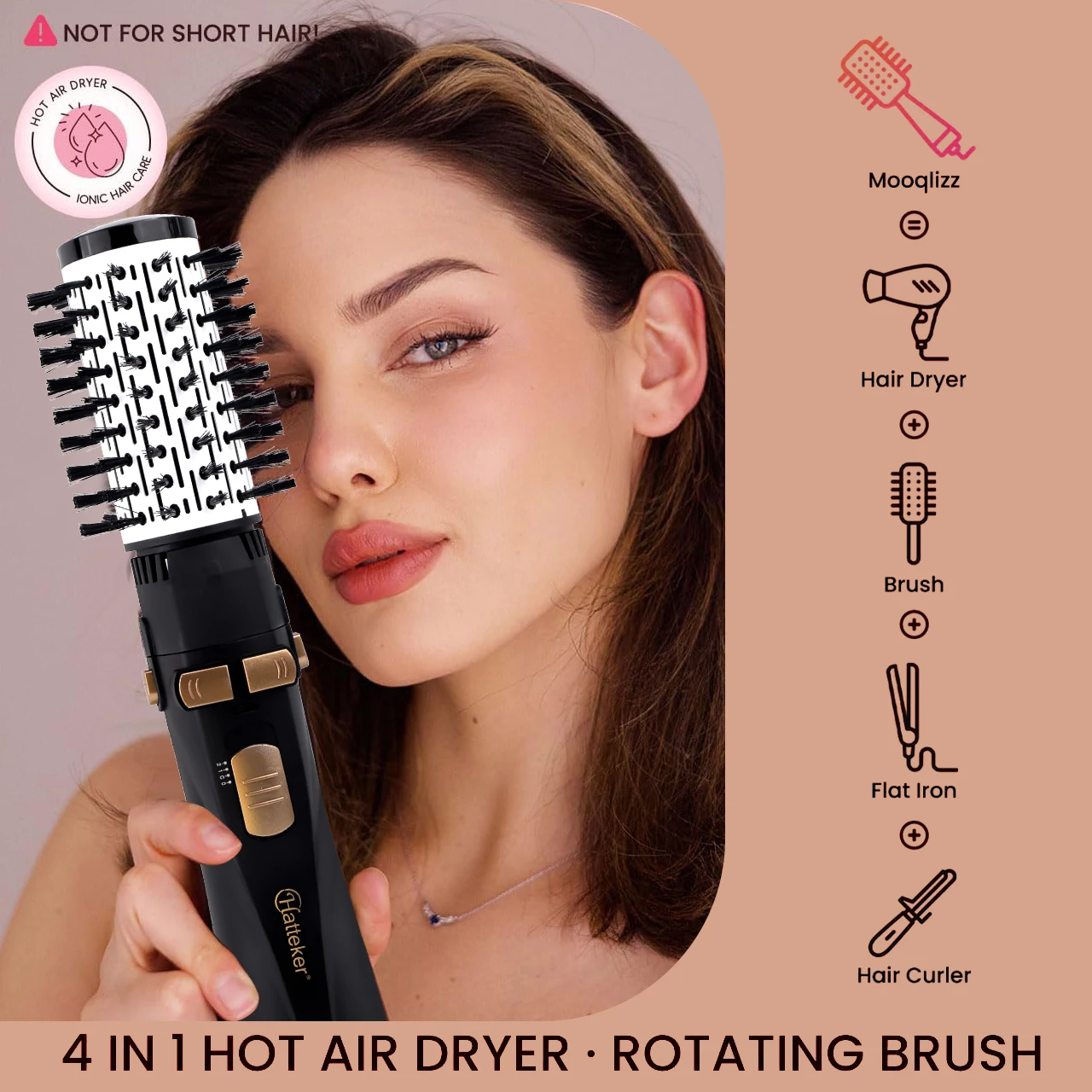 The Hatteker Hot Air Brush features a versatile 4-head design, allowing for multi-styling options such as straightening, curling, and blowing.