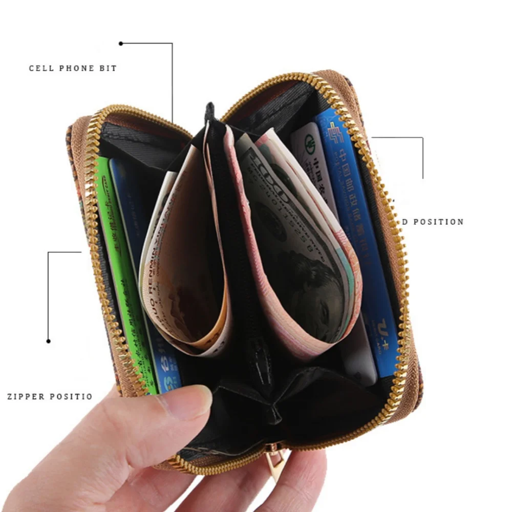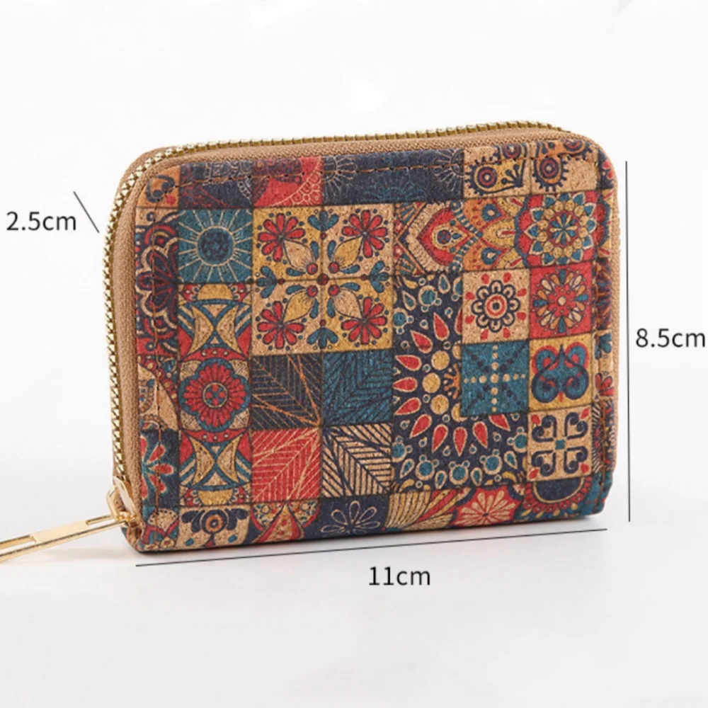 New Retro Exquisite Printed Short Wallet PU Cork Grain Coin Purse Multi-functional Card Holder Portable Zipper Money Bag for Men Women.