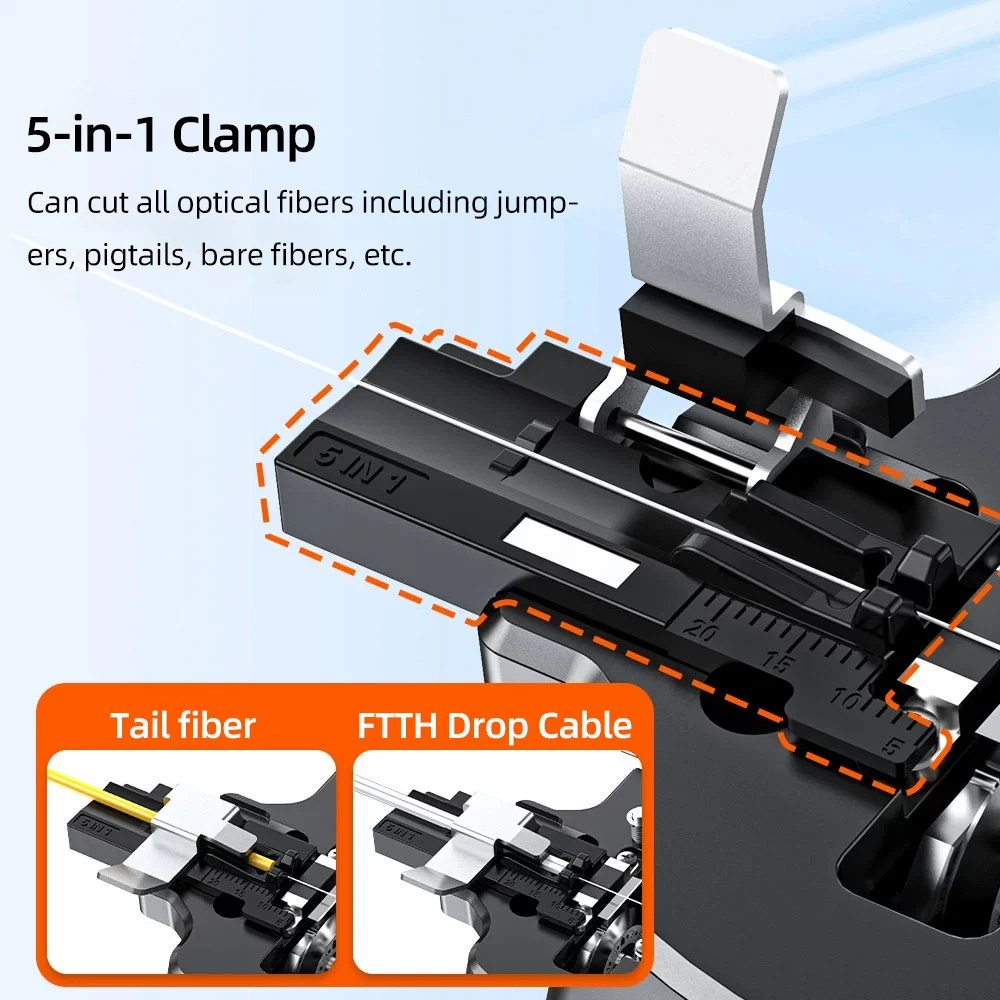 Equipped with a 24-position tungsten steel blade, it delivers an ultra-precise cutting angle of ≈0.3° (far exceeding the industry standard of ≤0.5°) and supports up to 50,000 cuts, ensuring minimal fusion loss for stable signal transmission. The 3-in-1 fixture is compatible with 250μm bare fiber, 900μm pigtail, and 3.0mm drop cable, while the built-in waste fiber box keeps your workspace tidy.