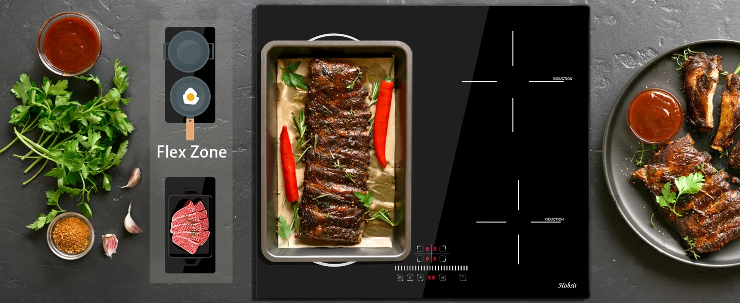 When the flexible operating mode of the induction hob is switched on, the two separate cooking zones can be combined into one large 39*21cm cooking zone – 2800W, more power and size for grilling larger or longer pans.