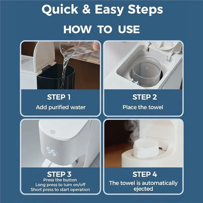 Steam-Moistened Towels: Smooth Dispensing Without Jamming Hot Face Towel Heater Machine gently steams towels to create soft, moist warmth that feels more comfortable than dry or cold towels. The smart tray movement system guides towels forward evenly during dispensing.