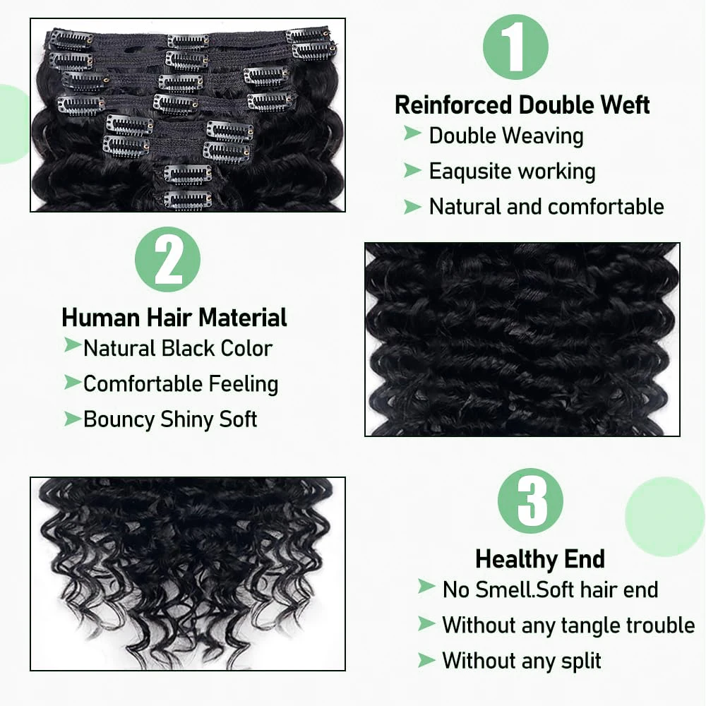 This hair is good quality and soft. The wave is a tight deep wave and the clip in part is flat and seamless. The clip ins are strong and sturdy and they stay put. I love this hair and the thickness is very full.