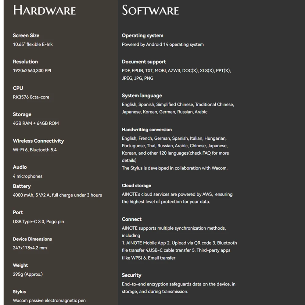 【AI Voice, Notes & Translation】More than a digital notepad,AINOTE 2 integrates AI-powered voice recording,real-time transcription and multilingual translation. Supports 16 transcription languages, 133 handwriting-to-text options and 11 instant translation modes for global communication