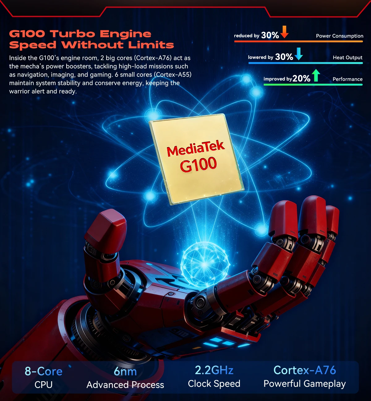 Inside the G100’s engine room, 2 big cores (Cortex-A76) act as the mecha’s power boosters, tackling high-load missions such as navigation, imaging, and gaming. 6 small cores (Cortex-A55) maintain system stability and conserve energy, keeping the warrior alert and ready.