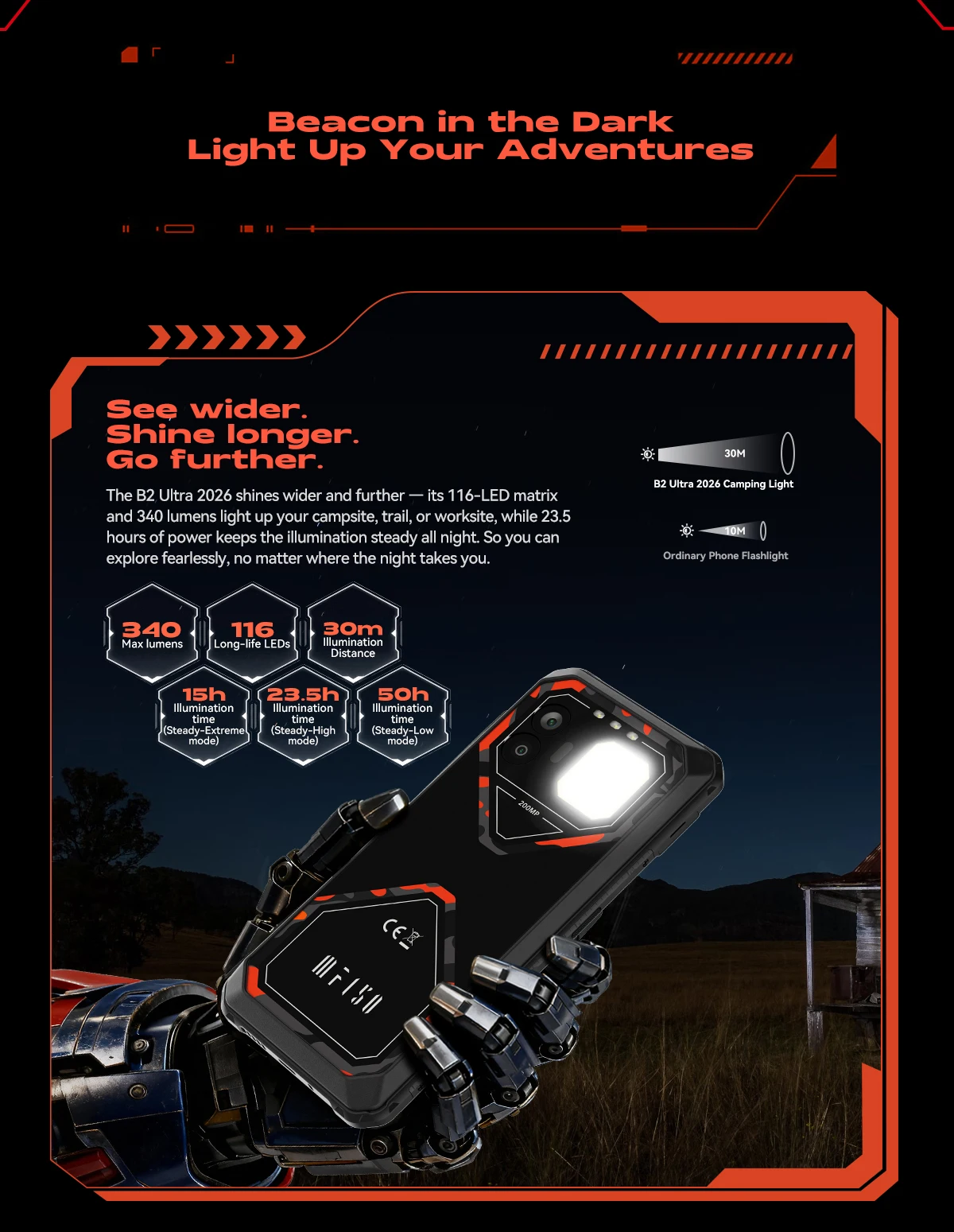 The B2 Ultra 2026 shines wider and further — its 116-LED matrix and 340 lumens light up your campsite, trail, or worksite, while 23.5 hours of power keeps the illumination steady all night. So you can explore fearlessly, no matter where the night takes you.