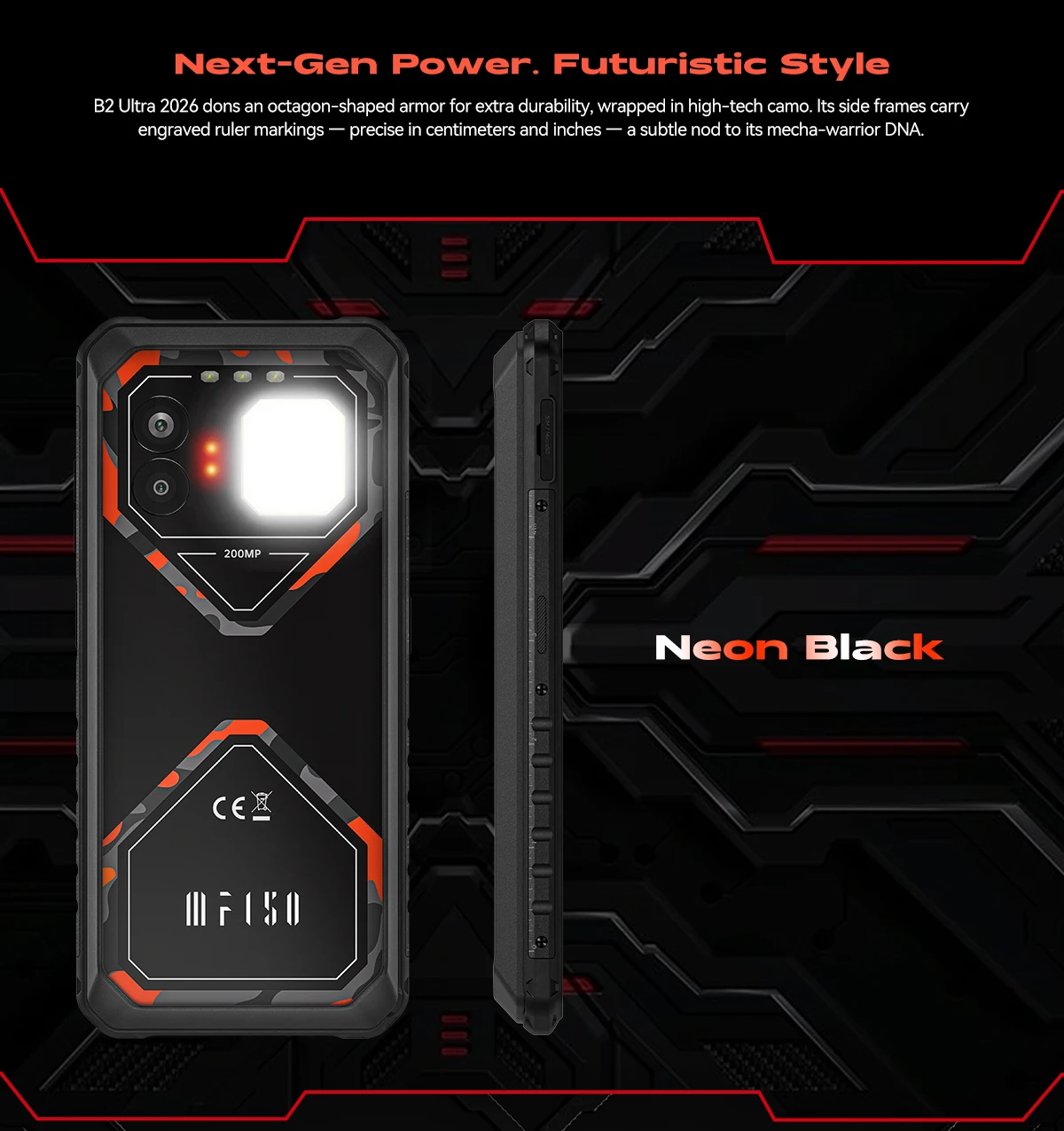 B2 Ultra 2026 dons an octagon-shaped armor for extra durability, wrapped in high-tech camo. Its side frames carry engraved ruler markings — precise in centimeters and inches — a subtle nod to its mecha-warrior DNA.