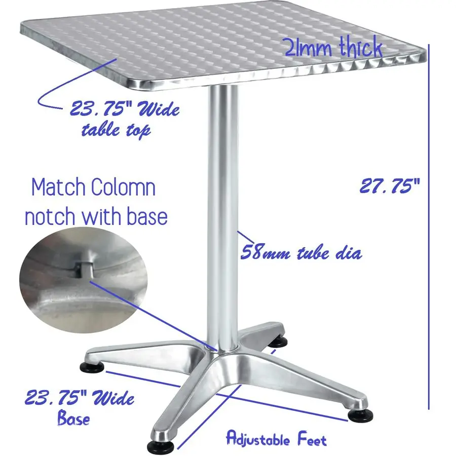 Table can be placed on the balcony, patio, outdoors, and indoors. Table need easy assembly. Additionally, it is both solid and easy to move around both at the same time. Table Dimension 23.7 Round X 27.7 H. 23.7 inch round table top. For Over time protection, flexseal e poxy or rust oleam sealant can be used on the seams and undersides. Smooth stainless steel surface. Aluminum column and base. Adjustable Plastic floor glides on base for minor uneven floors. Sleek and modern design.