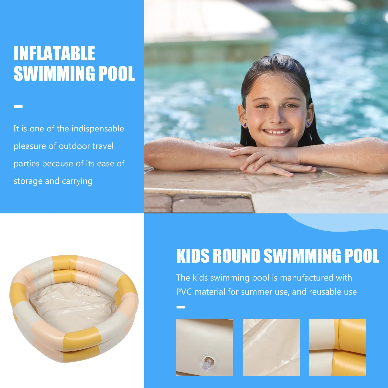 This item is an inflatable swimming pool, which is made of PVC, portable and practical. A good helper to keep cooling and enjoy this fun pool all summer long. Kids can just enjoy playing and swimming at home to promote parent-child interaction. kids pool