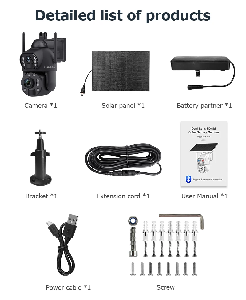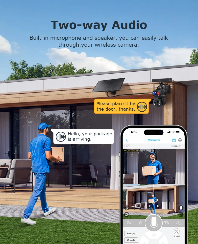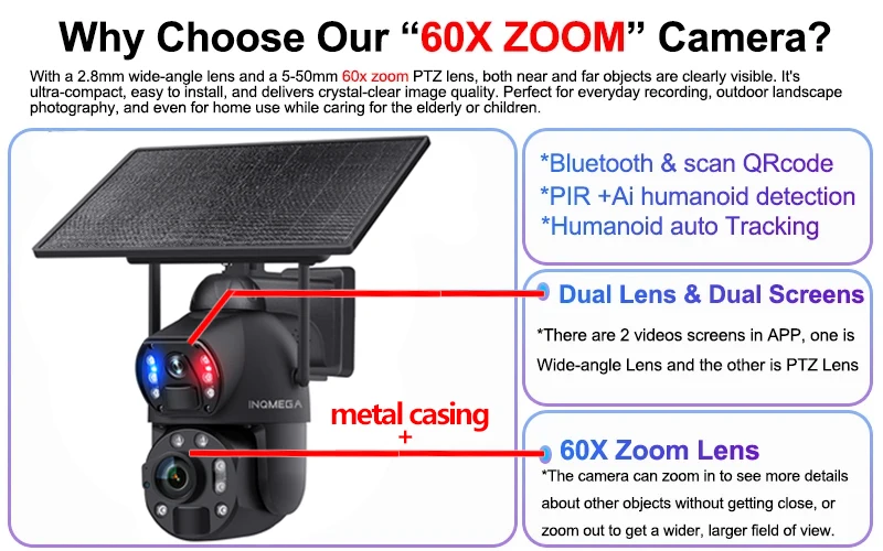 * Solar camera supports 60X optical zoom, allowing you to zoom in/out on the observed object in the app, allowing you to see more details.